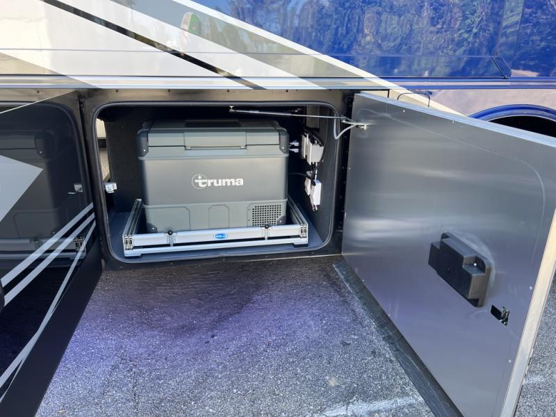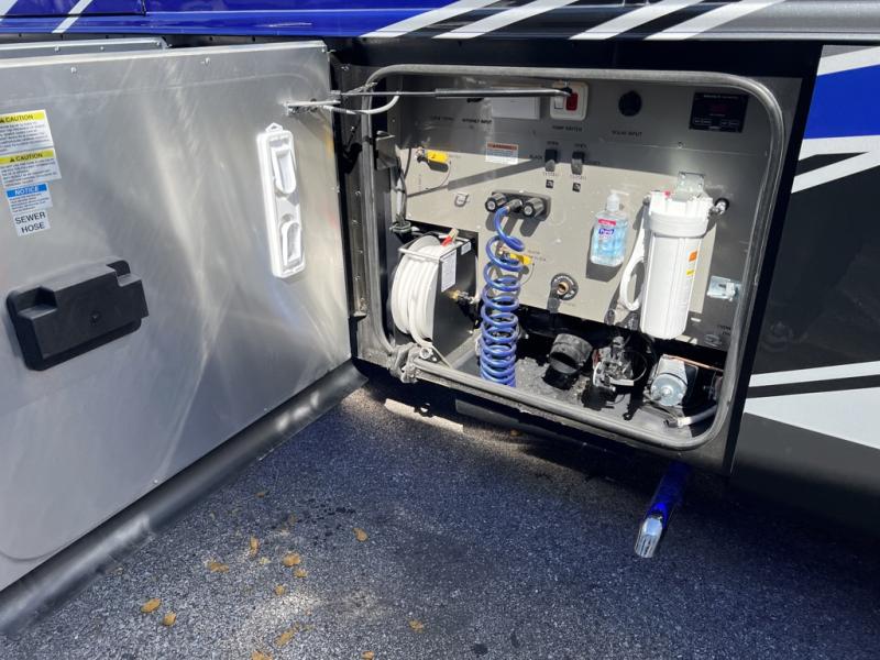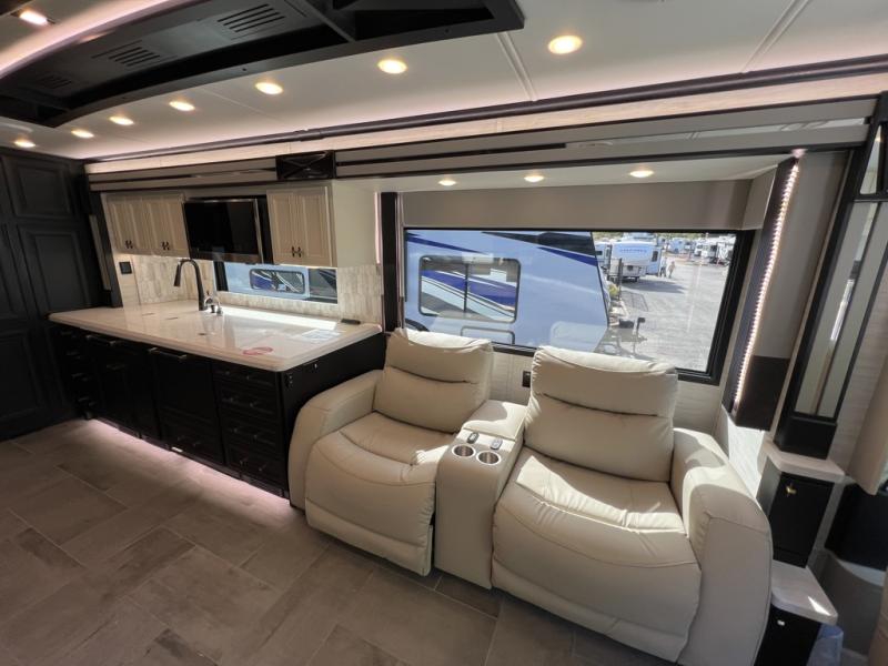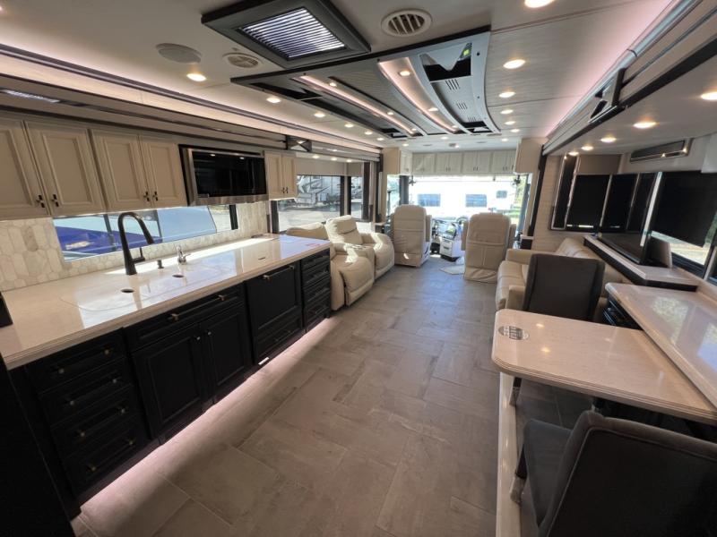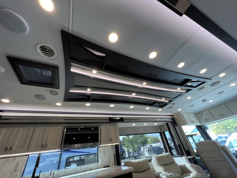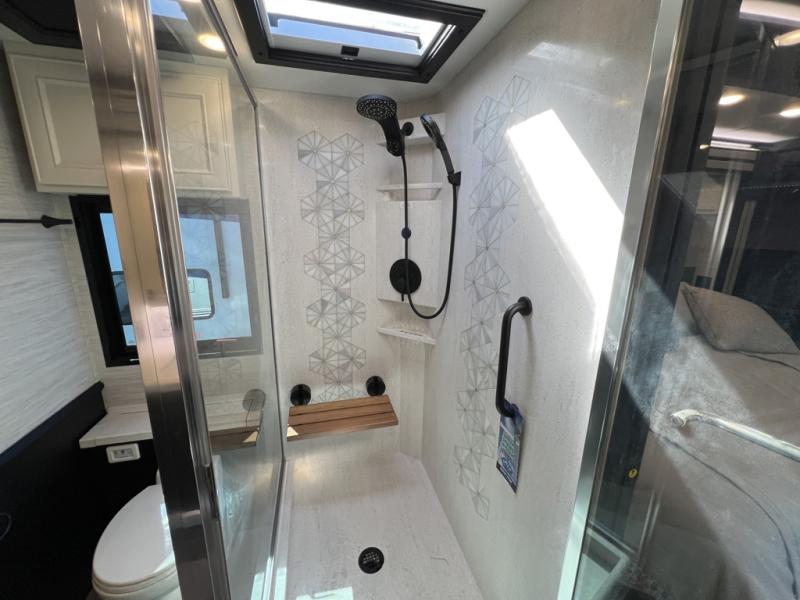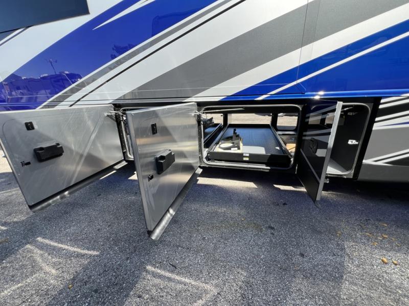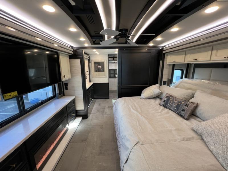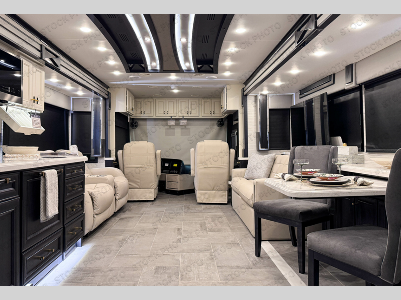 Fours slides, a bath and a half, plus sleeping space for six make this coach family friendly. There are two sofa beds in the main living area, plus a lift TV for your favorite shows. The chef of your group can cook meals on the two burner induction cooktop or in the stainless steel convection microwave with an air fryer, and there is a drawer-type dishwasher that will make clean up easier than ever. This model also includes a residential refrigerator plus pull-out storage and a stack of drawers for snacks galore. Enjoy a great night's rest on the king bed after traveling all day, and the full rear bath will allow you to clean up in luxury. There is even a floor-to-ceiling closet for maximum storage and a stacked washer and dryer; how convenient!