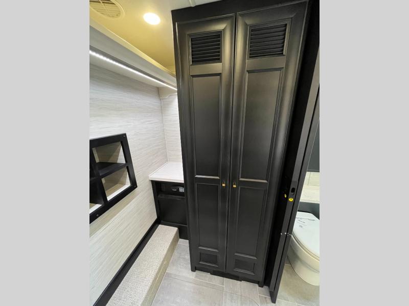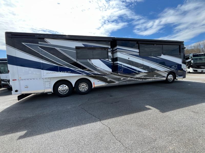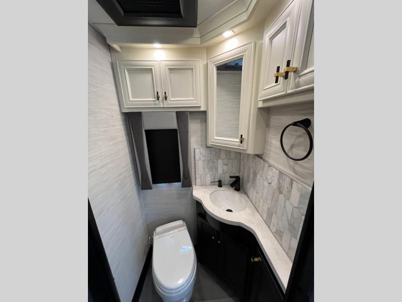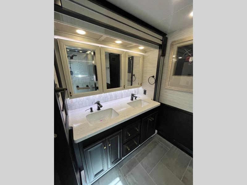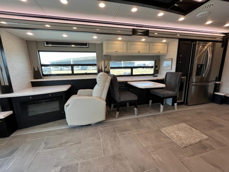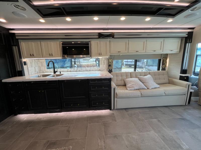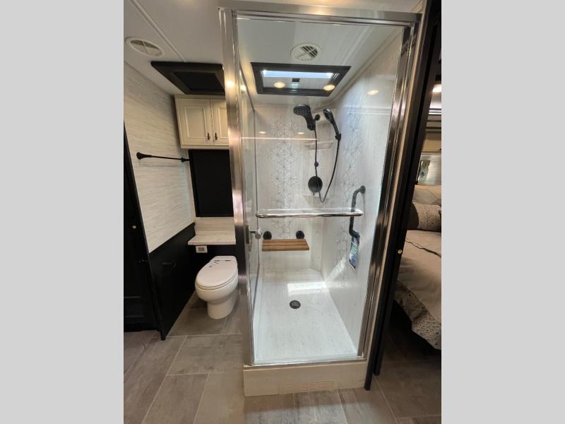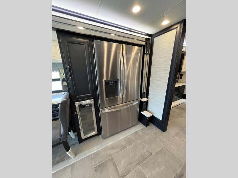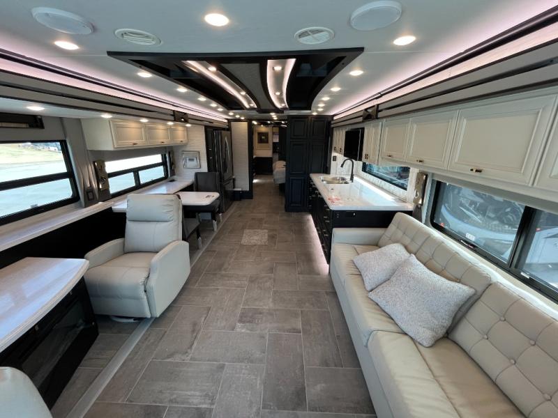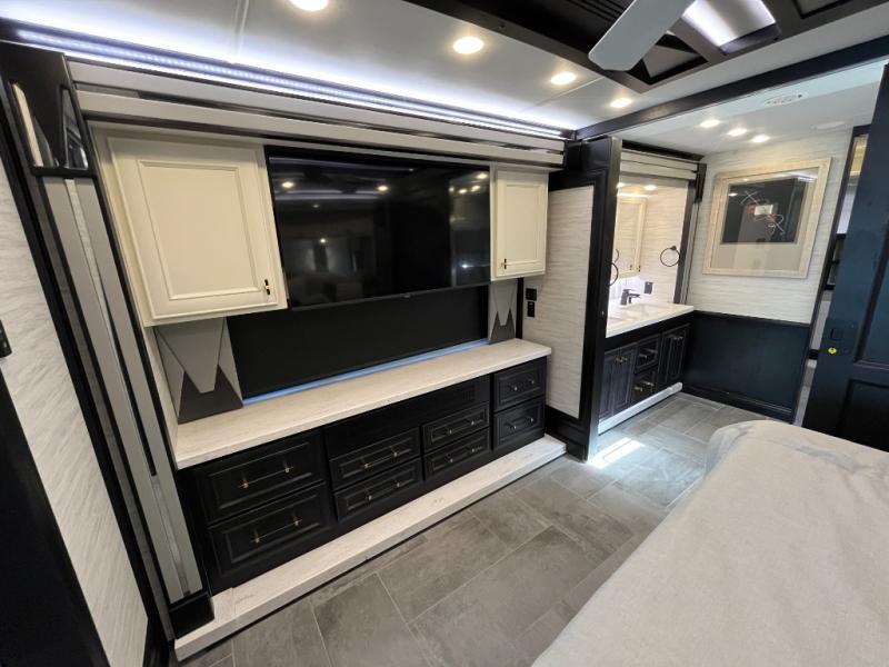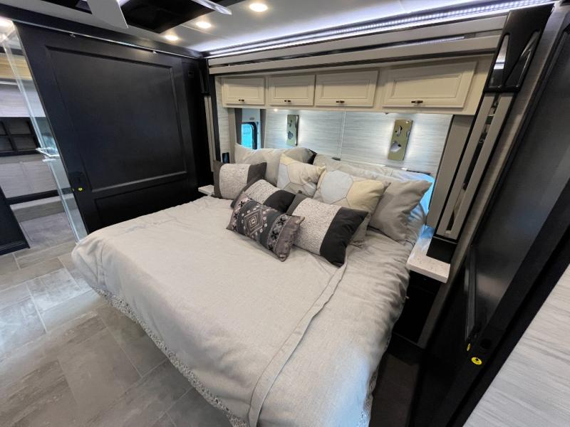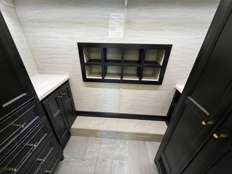 Fours slides, a bath and a half, plus sleeping space for six make this coach family friendly. There are two sofa beds in the main living area, plus a lift TV for your favorite shows. The chef of your group can cook meals on the two burner induction cooktop or in the stainless steel convection microwave with an air fryer, and there is a drawer-type dishwasher that will make clean up easier than ever. This model also includes a residential refrigerator plus pull-out storage and a stack of drawers for snacks galore. Enjoy a great night's rest on the king bed after traveling all day, and the full rear bath will allow you to clean up in luxury. There is even a floor-to-ceiling closet for maximum storage and a stacked washer and dryer; how convenient!