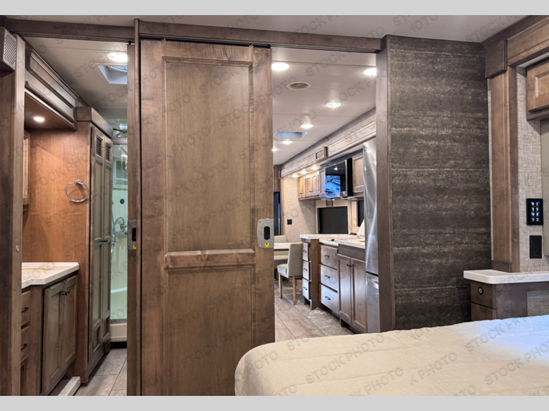 There are many standard luxurious features you will love about this motorhome! It also has many optional features you can add like the optional drop-down front bunk, the optional super sofa and the optional theater seating. The queen bed slide in the rear private bedroom offers a comfortable place to sleep, as well as the flip and fold sofa bed in the living area. You will love the dinette bar with a lift TV, a flip-up countertop, and two chairs that will make this the perfect place to get some work done while you're on the road. The kitchen includes everything you need to prepare meals each day, including a 1.7 cu. ft. smart convection microwave with an air fryer, a three burner liquid propane cooktop, and a 23 cu. ft. stainless steel residential refrigerator with French doors and a bottom freezer. Head to the rear master bedroom with a queen bed slide out, a large wardrobe, a cabinet with a TV and drawers below, plus a private entrance into the dual entry bath!