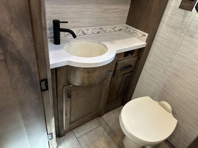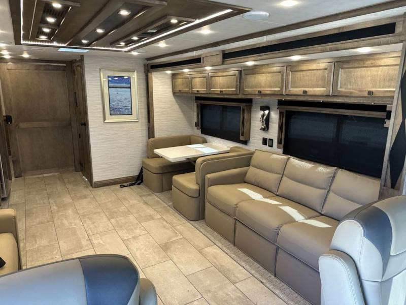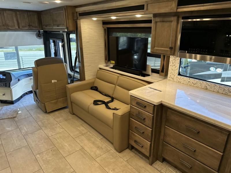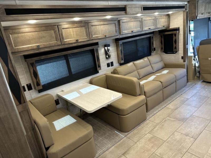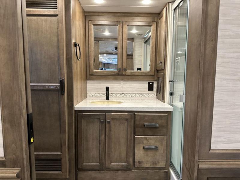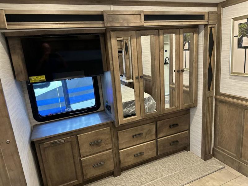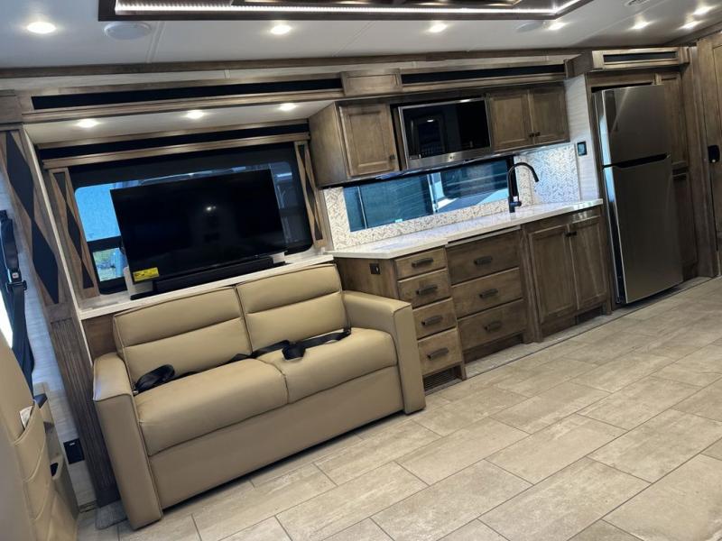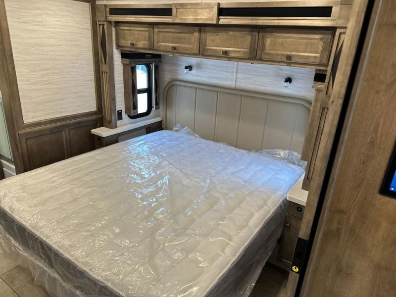 If luxury is what you want, luxury is what you'll get with this Allegro RED Class A diesel motorhome! Glamorous furnishings and high-class style are included all throughout this coach. One of the best features is going to be the master suite. This space has a private bedroom connected to its own private bathroom. The king bed slide sits across from the full-wall slide, so there is plenty of space to change your clothes and just relax. There is a TV next to the wardrobe and across from the bed for easy viewing at night, and the bathroom has a place for the optional washer/dryer to be added. Out in the main living area, the rest of your traveling companions can use the half bathroom to clean up, and there is plenty of seating for everyone to lounge on with the booth dinette sleeper and two sofas. If you would like to have more sleeping space, you can add the optional drop-down bunk above the cab.