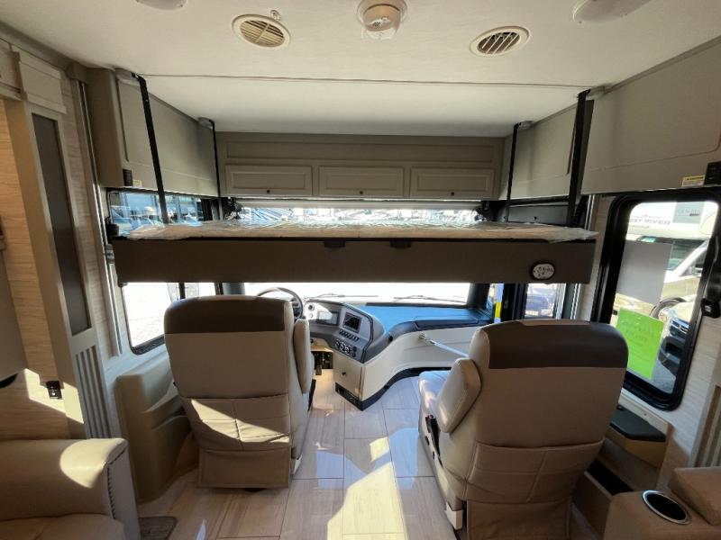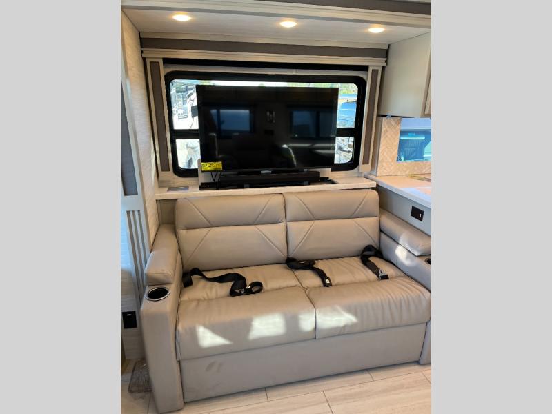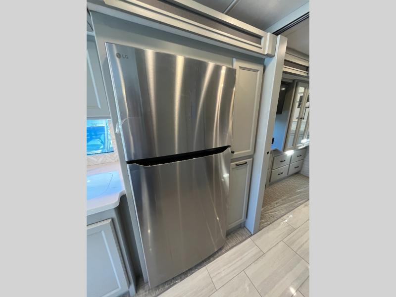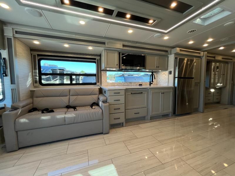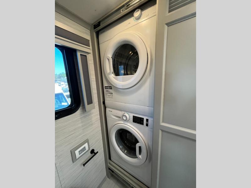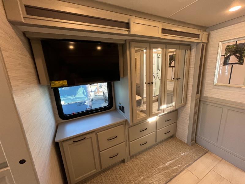If luxury is what you want, luxury is what you'll get with this Allegro RED Class A diesel motorhome! Glamorous furnishings and high-class style are included all throughout this coach. One of the best features is going to be the master suite. This space has a private bedroom connected to its own private bathroom. The king bed slide sits across from the full-wall slide, so there is plenty of space to change your clothes and just relax. There is a TV next to the wardrobe and across from the bed for easy viewing at night, and the bathroom has a place for the optional washer/dryer to be added. Out in the main living area, the rest of your traveling companions can use the half bathroom to clean up, and there is plenty of seating for everyone to lounge on with the booth dinette sleeper and two sofas. If you would like to have more sleeping space, you can add the optional drop-down bunk above the cab.