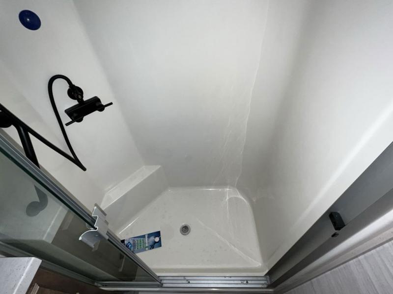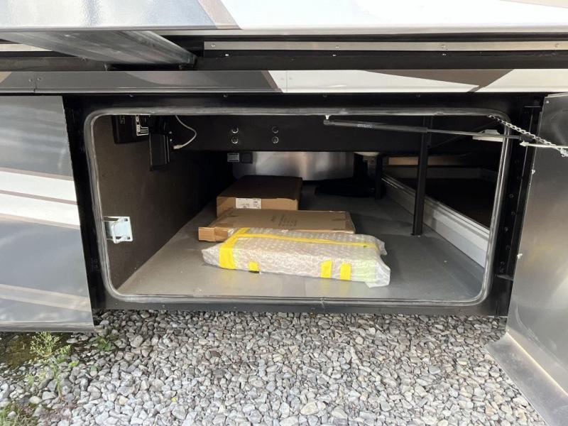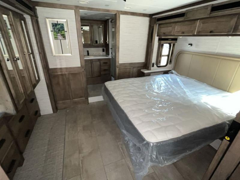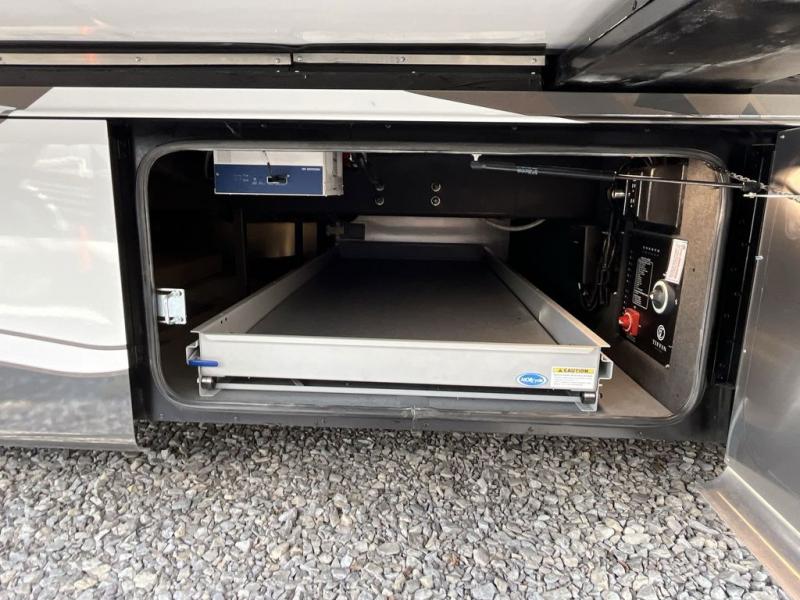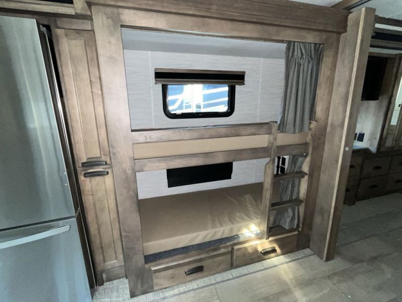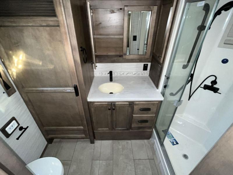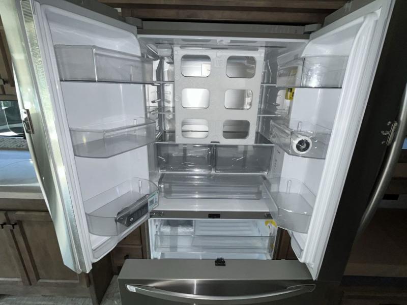 Don't be surprised if you never want to leave this Allegro RED Class A diesel motorhome! You have an excellent amount of sleeping space with the king bed slide, air coil sofa, booth dinette sleeper, and 28" x 70" bunk beds, but if you would like to have even more sleeping space, you can also add the optional drop-down bunk above the cab. The other thing you have quite a lot of is entertainment. There are three TVs, a centralized entertainment center with Blu-Ray player, and a sound bar sound system with the living area TV. The kitchen has all of the tools needed to prepare delicious meals while you're out and about, and you will be able to store all of those meal ingredients in the pantry and 23 cu. ft. stainless steel residential refrigerator with French doors and bottom freezer. Another feature that makes this coach comfortable is the full and half bathroom. The half bath is located out in the main living area for all, and the full bathroom rests inside the master suite in the back.