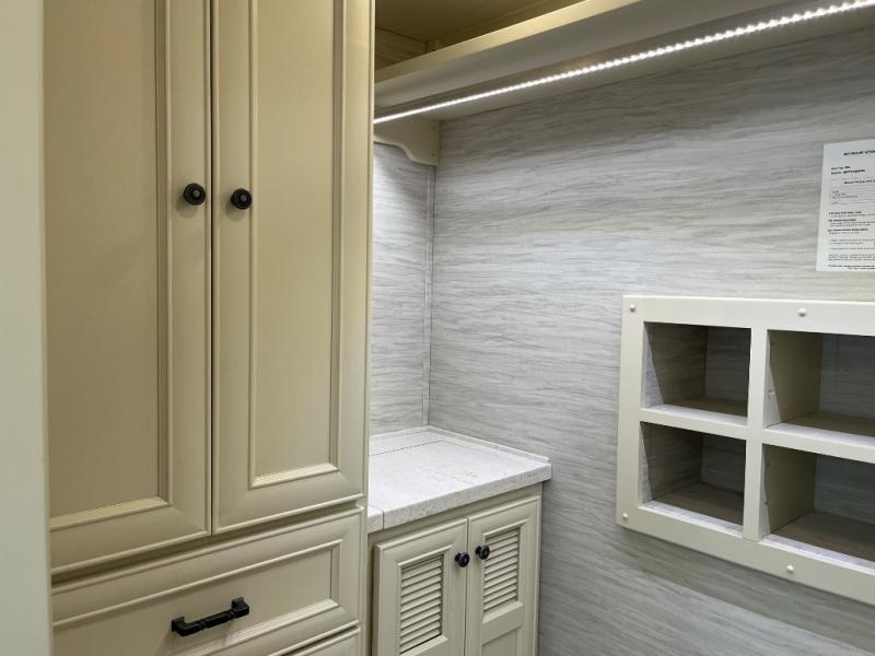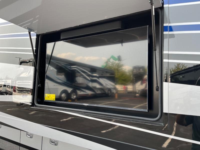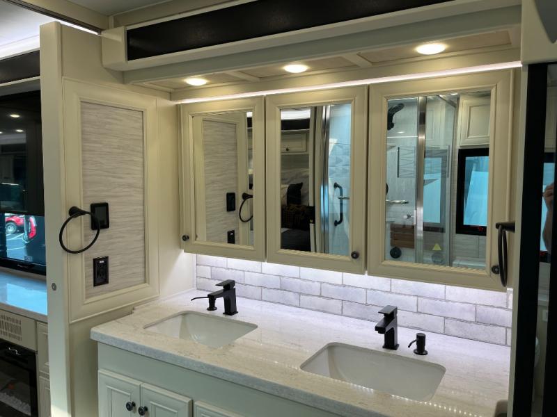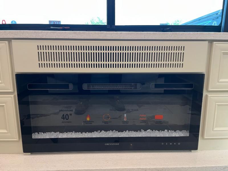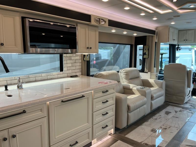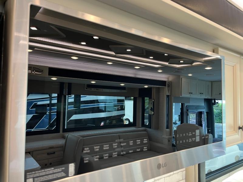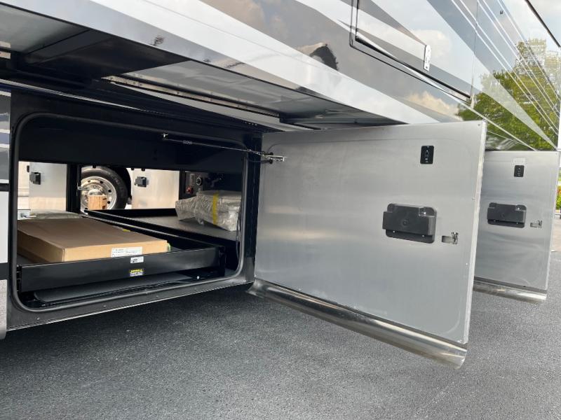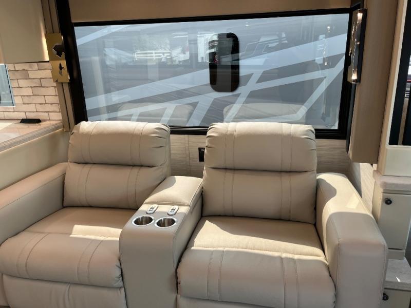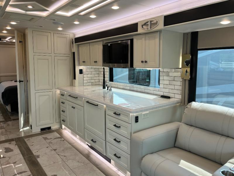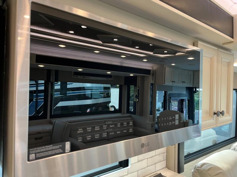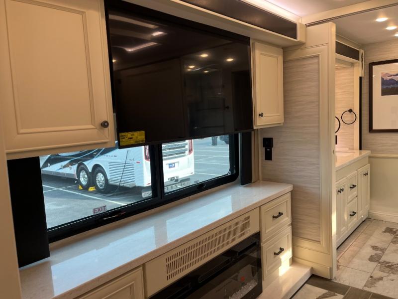 Get ready for luxury trips both near and far in this spacious coach! Once you find somewhere to park for the night, you can cook dinner on the two burner induction cooktop or in the 1.7 cu. ft. Smart convection microwave with an air fryer. There is an Expand-An-Island for more prep space plus pull-out storage and a drawer-type dishwasher to make clean up easier than ever. You can then relax on the DE sofa bed with a lift TV above it or on the air coil sofa bed with an ottoman. There is also a dinette with chairs where you can dine together or get some work done while you're away from home. And the half bath off of the kitchen is convenient for everyone. A master bedroom is sure to meet your needs with a power Smart king bed slide with dual nightstands, a 50" TV, and drawers below an optional fireplace. The feature you might like most on this coach is the full rear bath! Here, you'll find dual bath sinks with a tri-view mirror, a spacious shower, and a floor-to-ceiling closet, complete with storage cabinets, a safe plus prep for a washer and dryer!