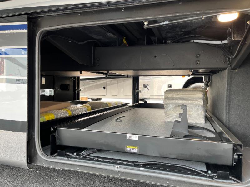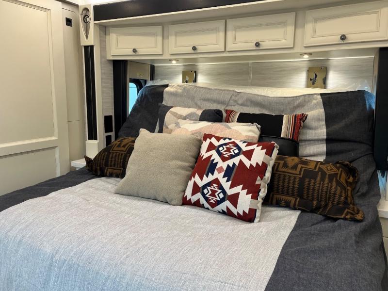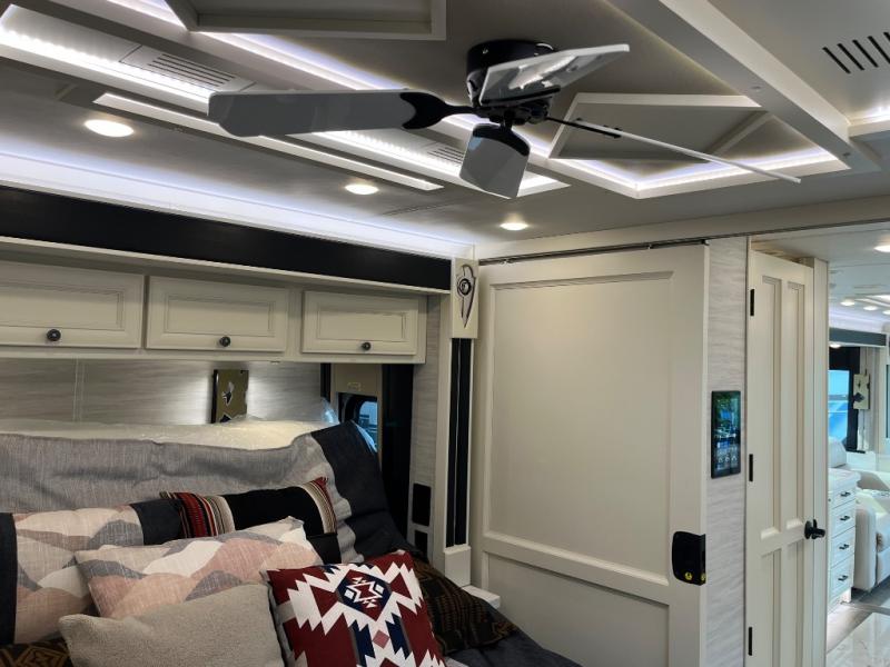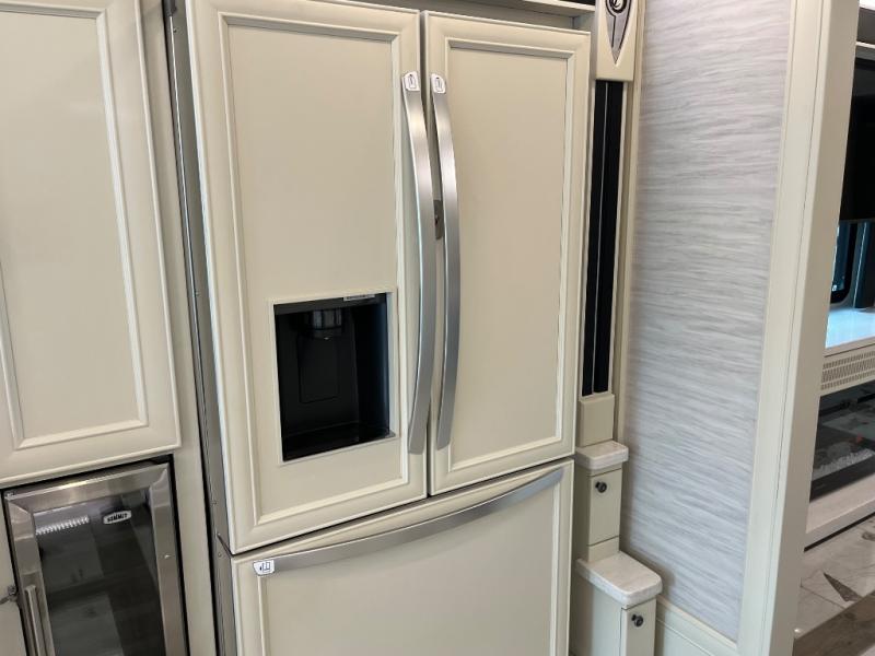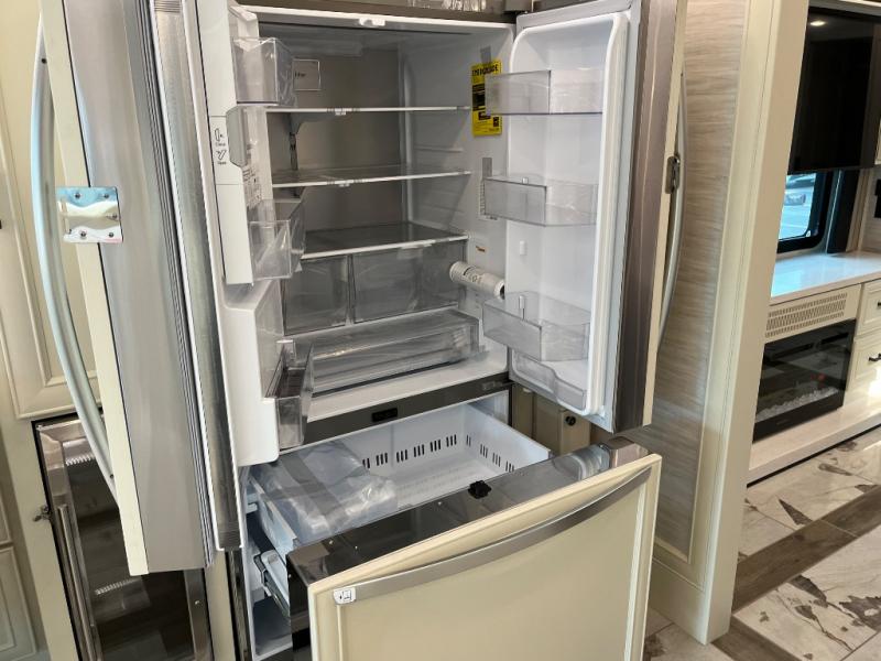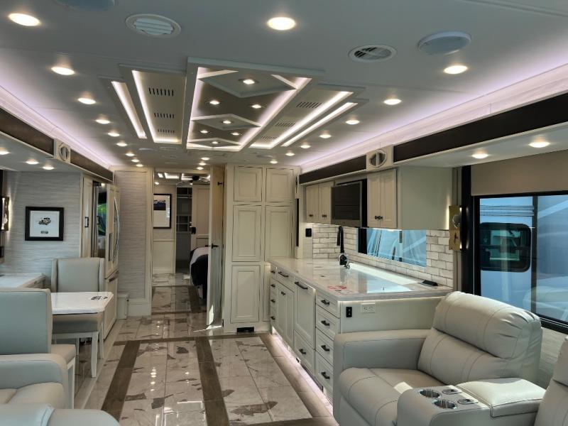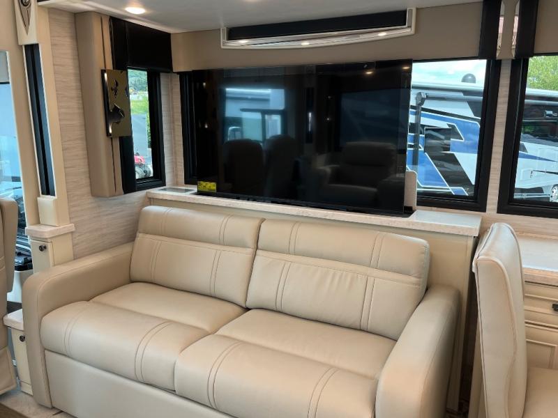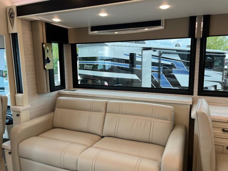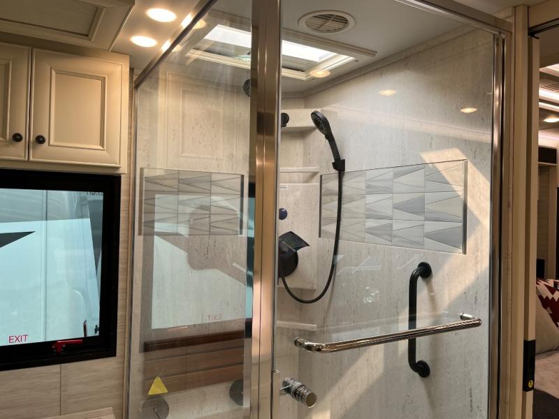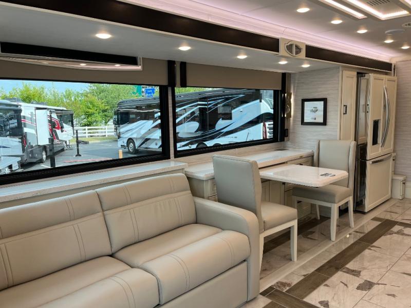 Get ready for luxury trips both near and far in this spacious coach! Once you find somewhere to park for the night, you can cook dinner on the two burner induction cooktop or in the 1.7 cu. ft. Smart convection microwave with an air fryer. There is an Expand-An-Island for more prep space plus pull-out storage and a drawer-type dishwasher to make clean up easier than ever. You can then relax on the DE sofa bed with a lift TV above it or on the air coil sofa bed with an ottoman. There is also a dinette with chairs where you can dine together or get some work done while you're away from home. And the half bath off of the kitchen is convenient for everyone. A master bedroom is sure to meet your needs with a power Smart king bed slide with dual nightstands, a 50" TV, and drawers below an optional fireplace. The feature you might like most on this coach is the full rear bath! Here, you'll find dual bath sinks with a tri-view mirror, a spacious shower, and a floor-to-ceiling closet, complete with storage cabinets, a safe plus prep for a washer and dryer!
