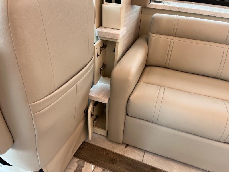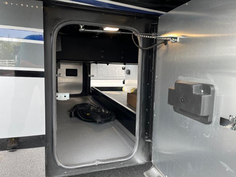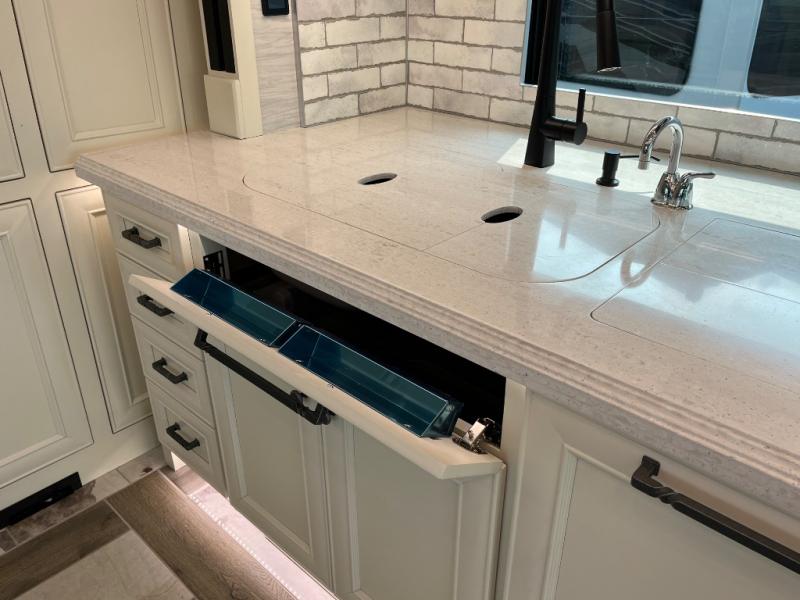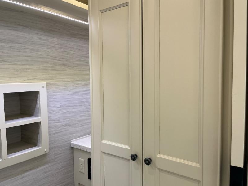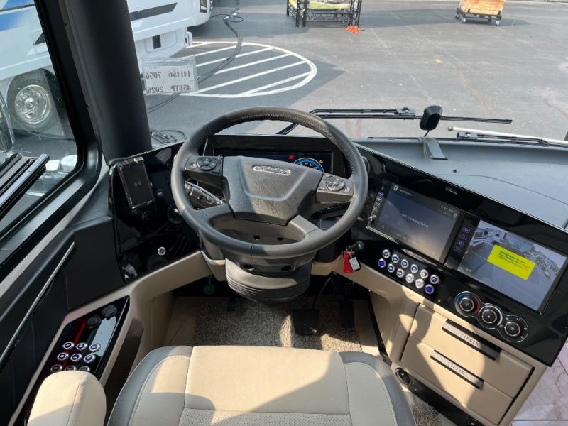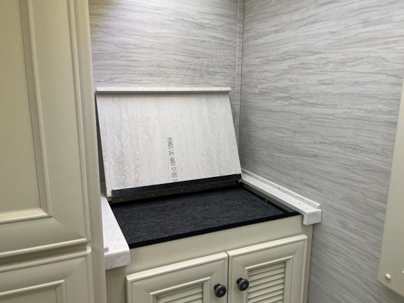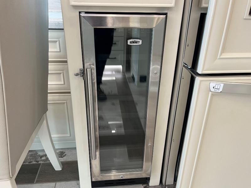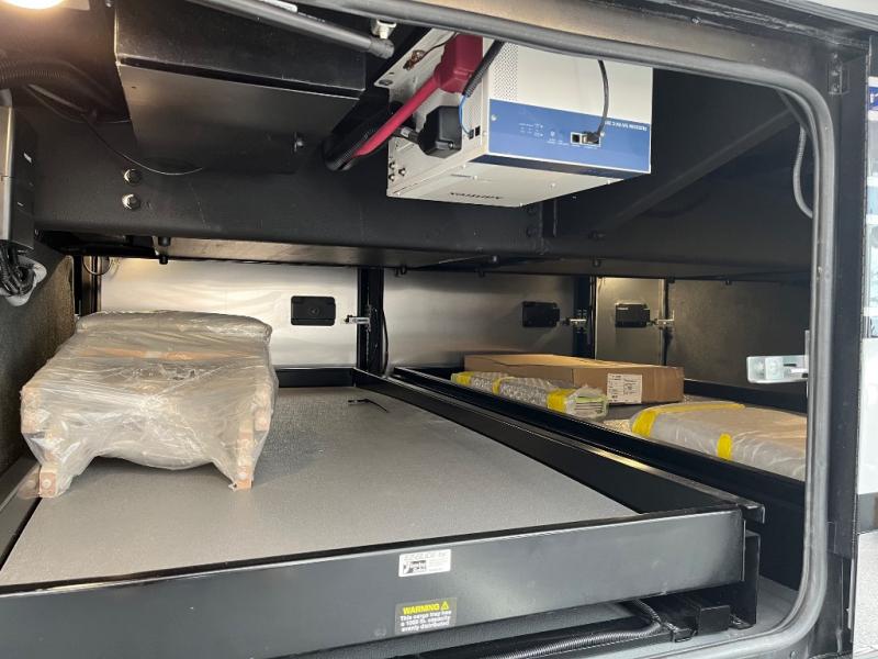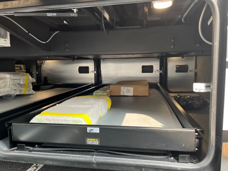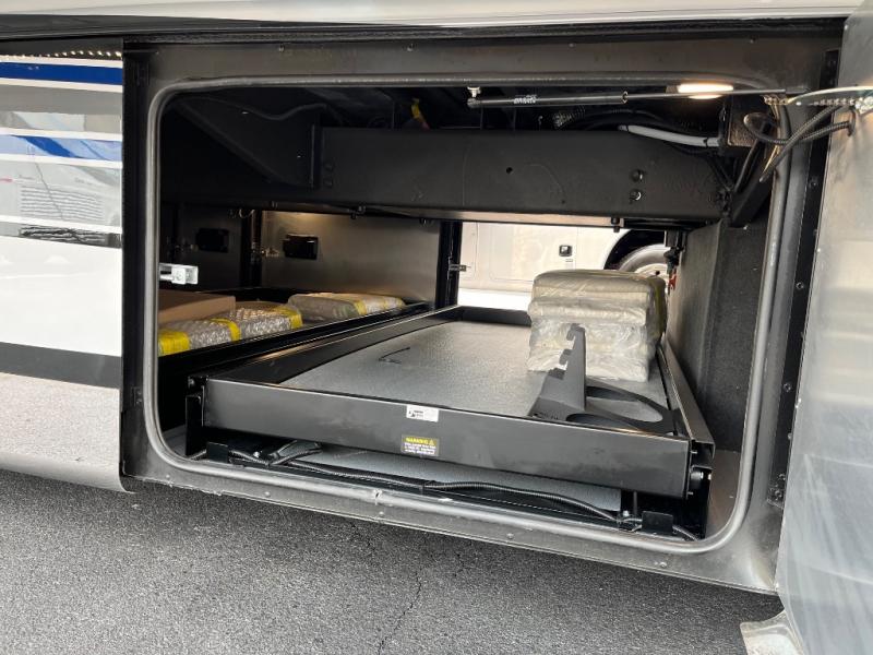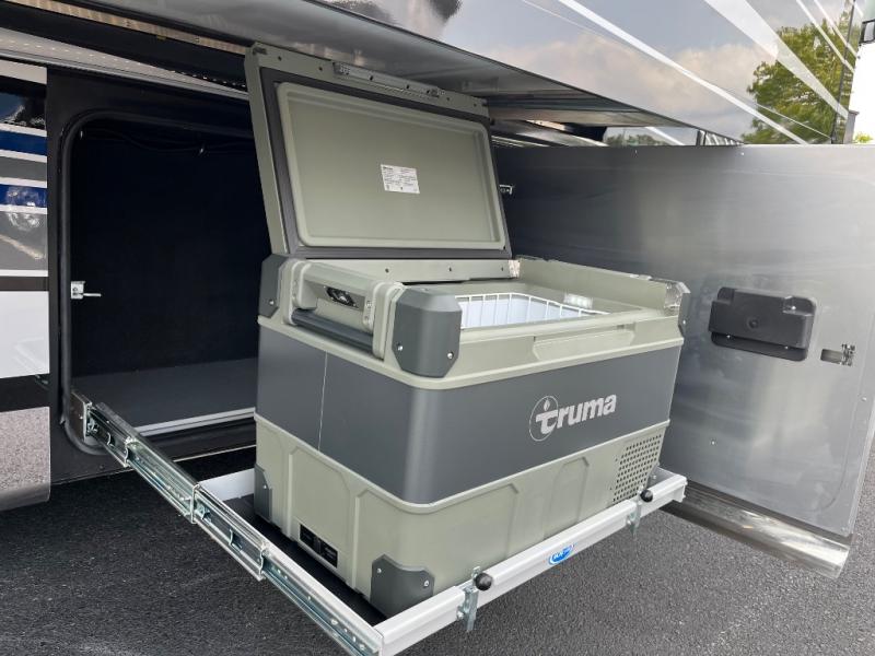 Get ready for luxury trips both near and far in this spacious coach! Once you find somewhere to park for the night, you can cook dinner on the two burner induction cooktop or in the 1.7 cu. ft. Smart convection microwave with an air fryer. There is an Expand-An-Island for more prep space plus pull-out storage and a drawer-type dishwasher to make clean up easier than ever. You can then relax on the DE sofa bed with a lift TV above it or on the air coil sofa bed with an ottoman. There is also a dinette with chairs where you can dine together or get some work done while you're away from home. And the half bath off of the kitchen is convenient for everyone. A master bedroom is sure to meet your needs with a power Smart king bed slide with dual nightstands, a 50" TV, and drawers below an optional fireplace. The feature you might like most on this coach is the full rear bath! Here, you'll find dual bath sinks with a tri-view mirror, a spacious shower, and a floor-to-ceiling closet, complete with storage cabinets, a safe plus prep for a washer and dryer!