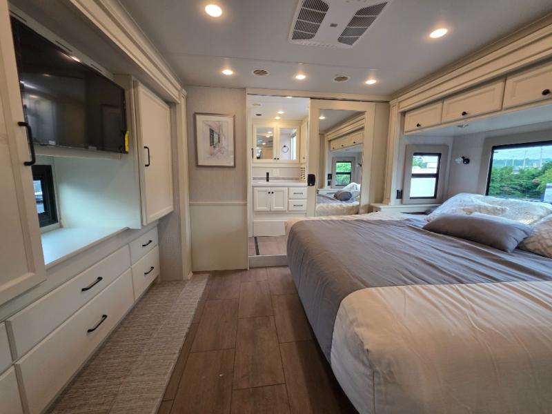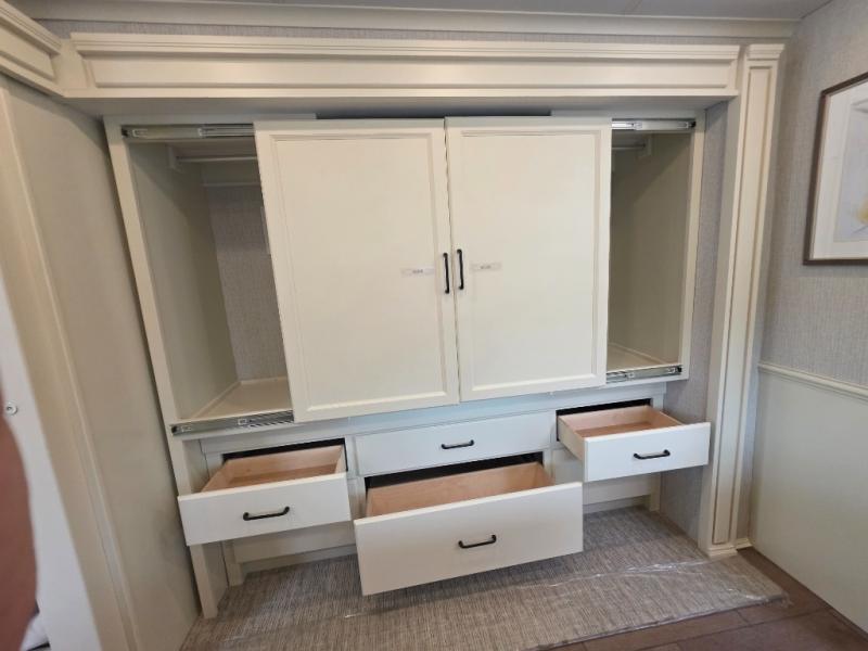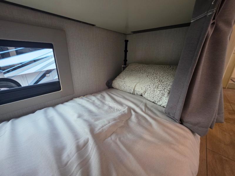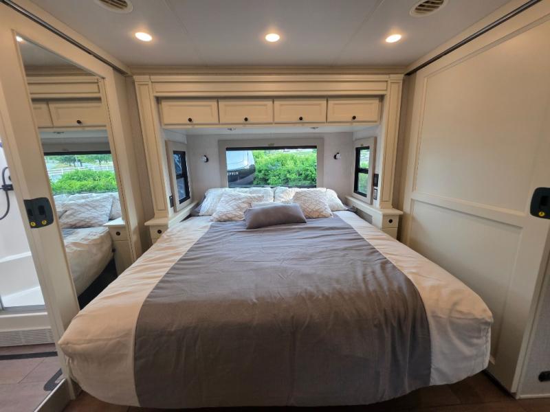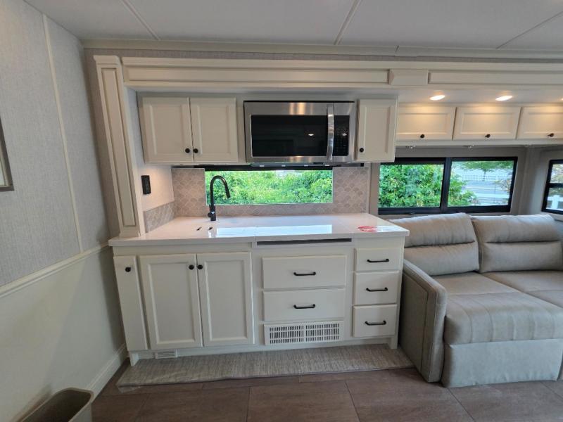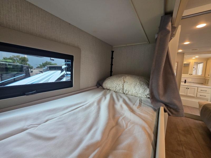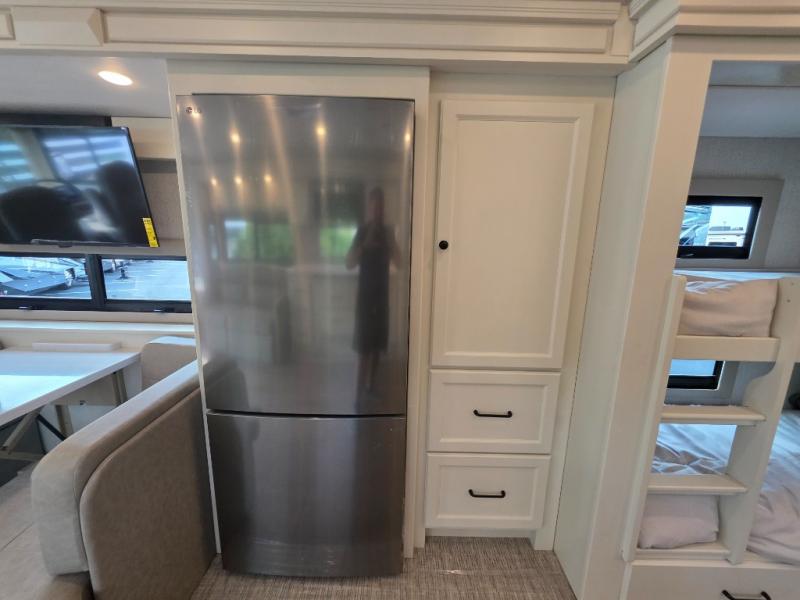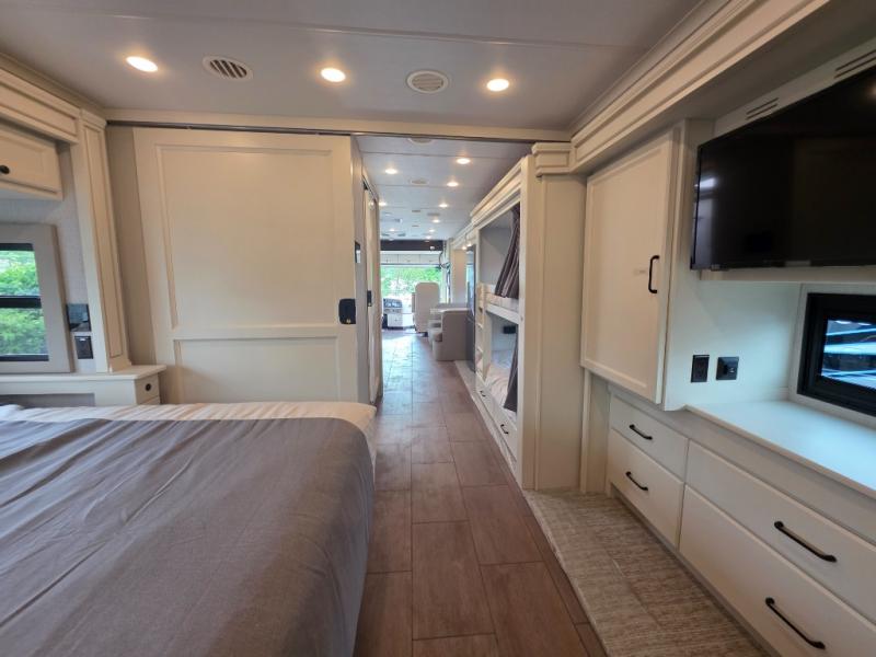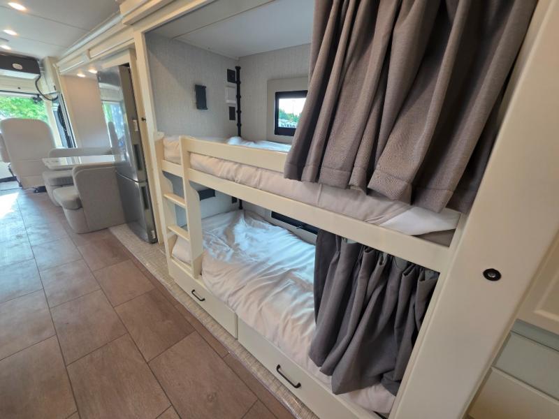 A full-wall slide plus two additional slides provides ample room to stretch out in this coach! It will be so easy to travel with a larger group since there is a full rear bath, bunk beds, plus a second full bath right across the bunks for convenience! You will surely appreciate the master bedroom with dual bedroom wardrobes and nightstands, a king bed slide out, and quick entrance into the rear bath. In the morning, you can prepare breakfast for everyone on the three burner cooktop or in the 1.5 cu. ft. Smart convection microwave, and the perishables can go back in the 18 cu. ft. residential refrigerator when you're done. Your crew can also make themselves comfortable on the air coil sofa and booth dinette sleeper, and these areas can double as sleeping space as well. If you need more sleeping space, you might want to add the optional drop-down front bunk!