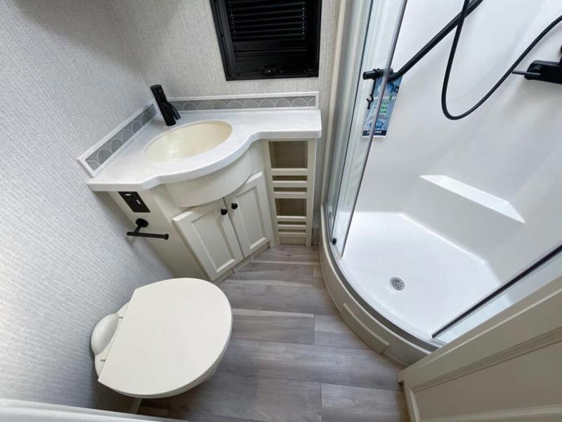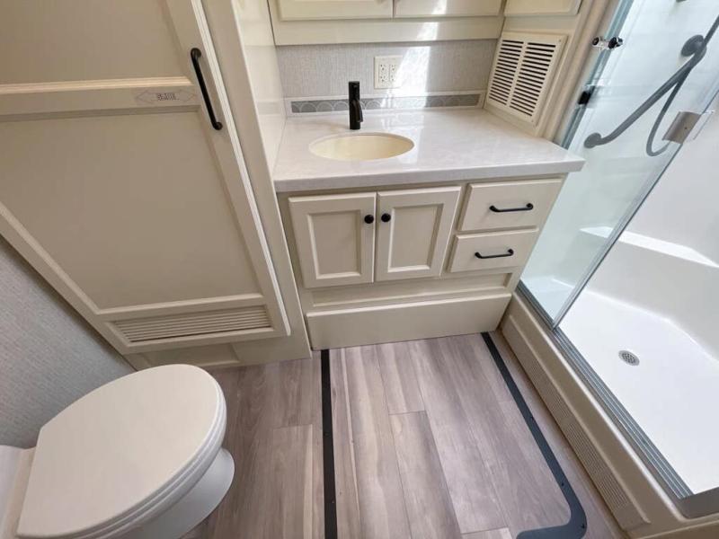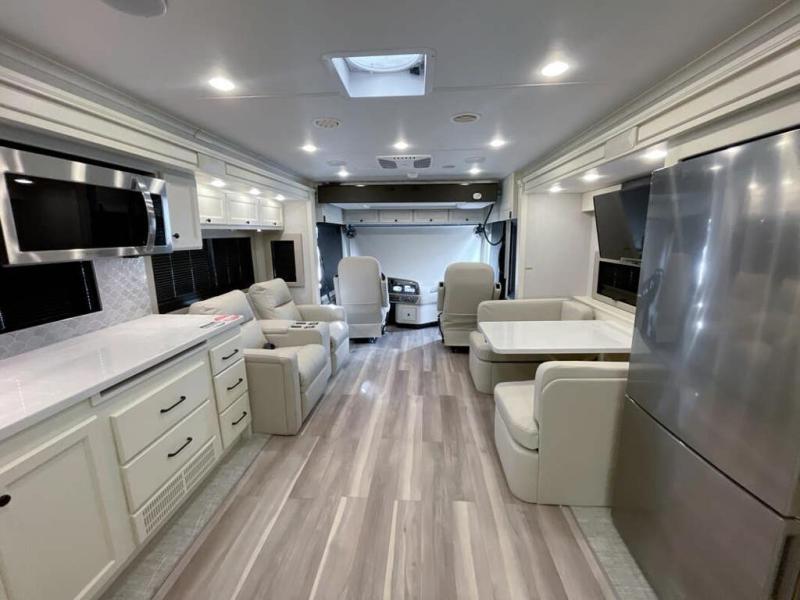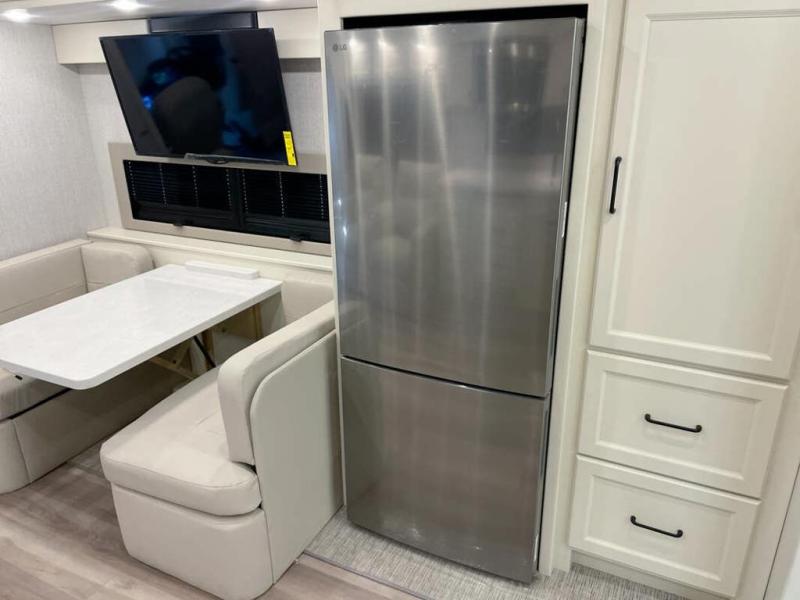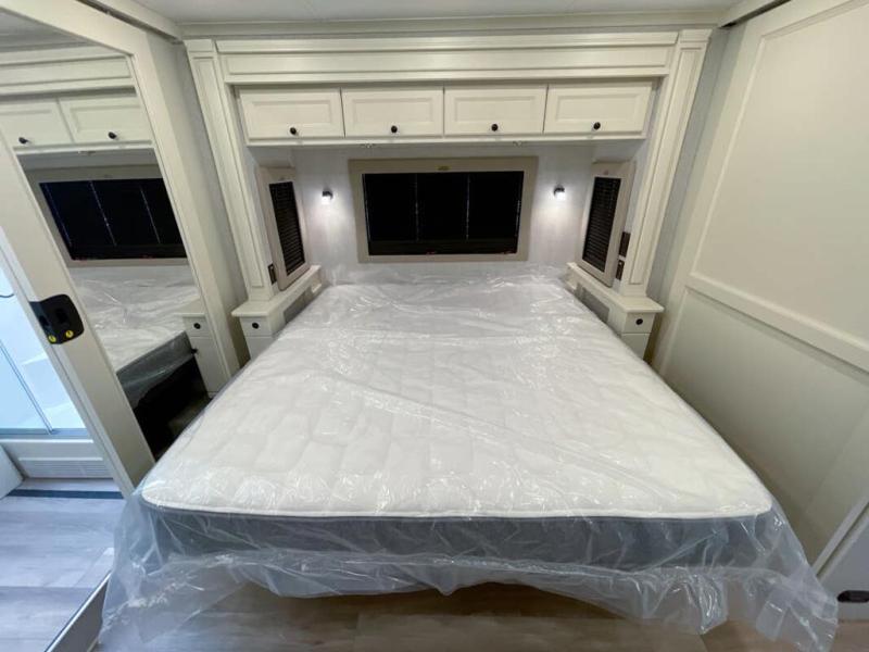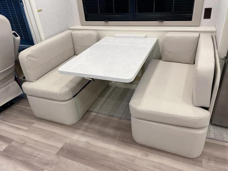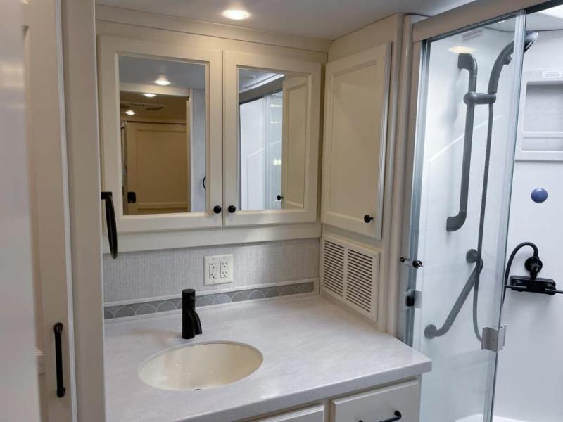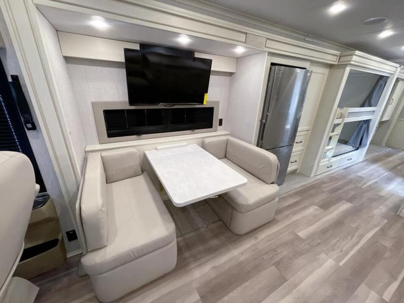 A full-wall slide plus two additional slides provides ample room to stretch out in this coach! It will be so easy to travel with a larger group since there is a full rear bath, bunk beds, plus a second full bath right across the bunks for convenience! You will surely appreciate the master bedroom with dual bedroom wardrobes and nightstands, a king bed slide out, and quick entrance into the rear bath. In the morning, you can prepare breakfast for everyone on the three burner cooktop or in the 1.5 cu. ft. Smart convection microwave, and the perishables can go back in the 18 cu. ft. residential refrigerator when you're done. Your crew can also make themselves comfortable on the air coil sofa and booth dinette sleeper, and these areas can double as sleeping space as well. If you need more sleeping space, you might want to add the optional drop-down front bunk!
