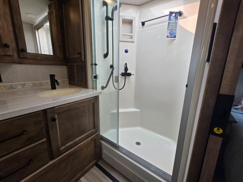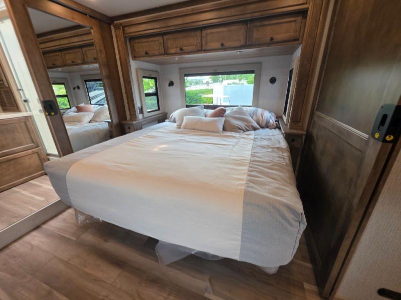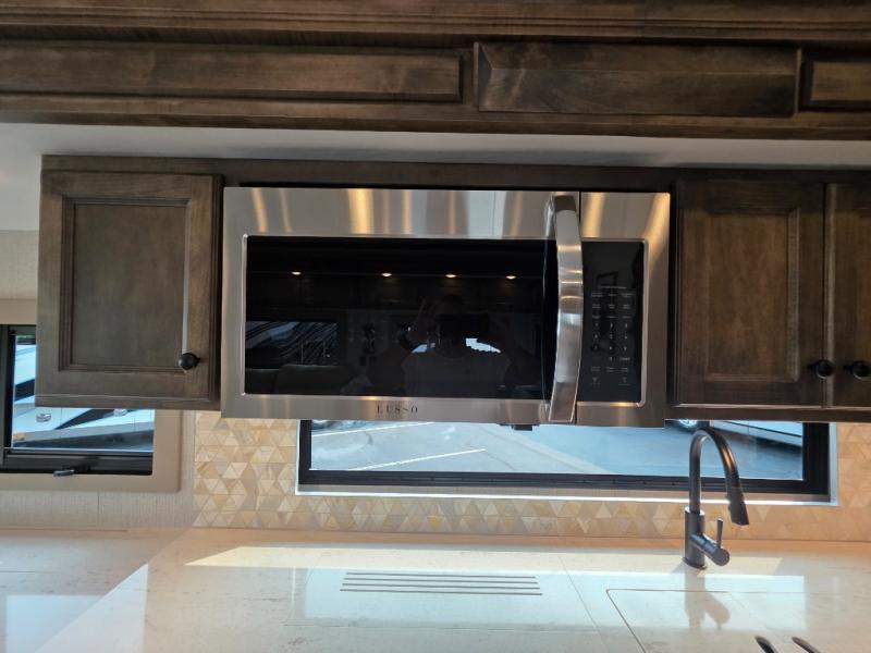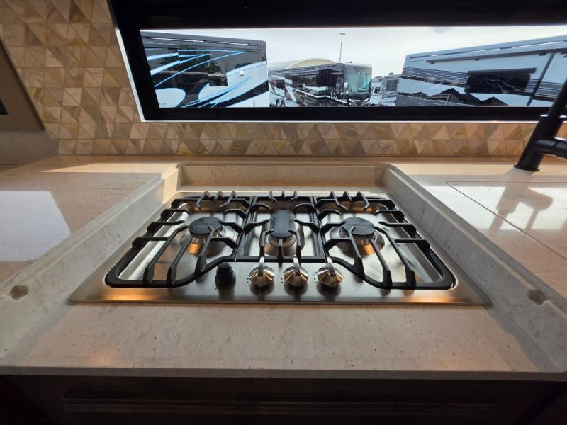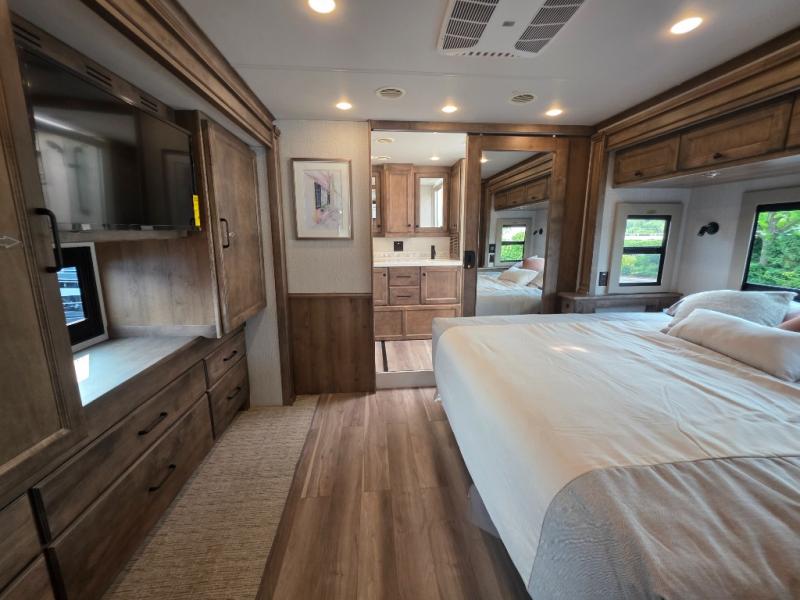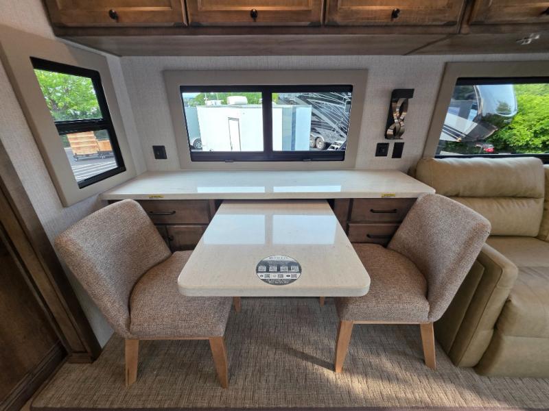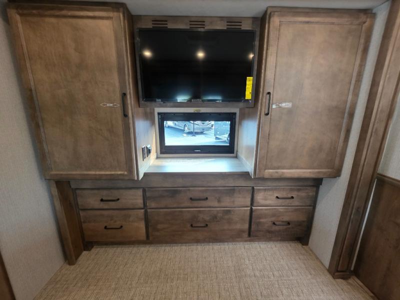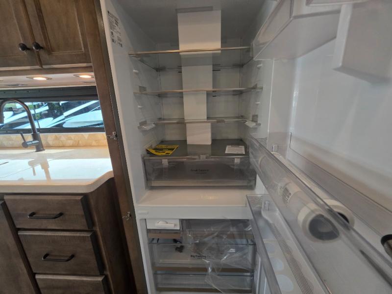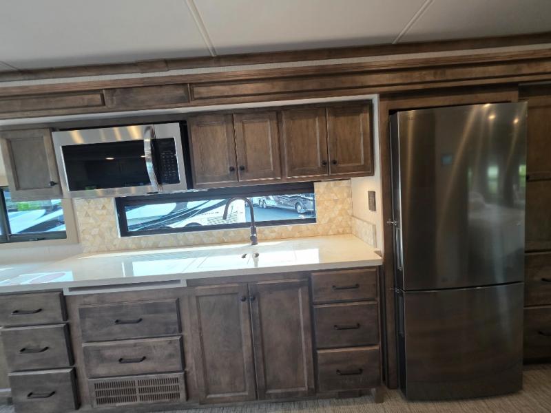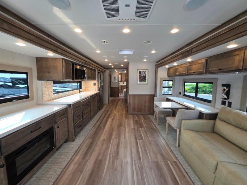 One step inside this spacious coach and you'll be sold! There is a bath and a half to make traveling with friends and family easier than ever. The full-wall slide will make your space feel more open, plus there is a king bed slide out and a third slide out so everyone is comfortable. This model includes theater seats, a lift TV within the entertainment center, along with drawer storage to keep movies organized, and an optional fireplace. You'll be pleasantly surprised by the full kitchen with its three burner cooktop, 1.5 cu. ft. Smart convection microwave, plus a pantry and 18 cu. ft. residential refrigerator with a bottom freezer to keep ice cream stocked up! When you're ready for some shut-eye, the master bedroom will be waiting for you, while your guests sleep on the booth dinette sleeper, or you can choose the optional drop-down front bunk for more sleeping space!