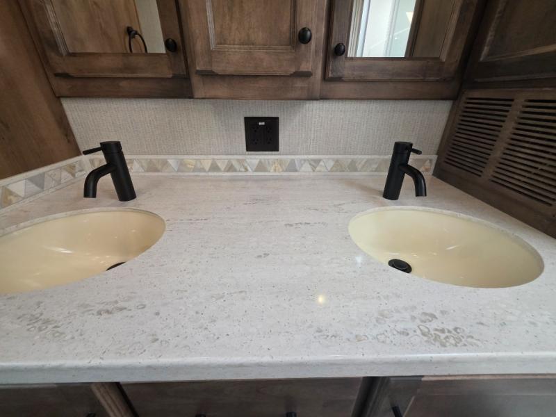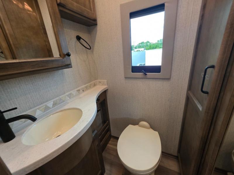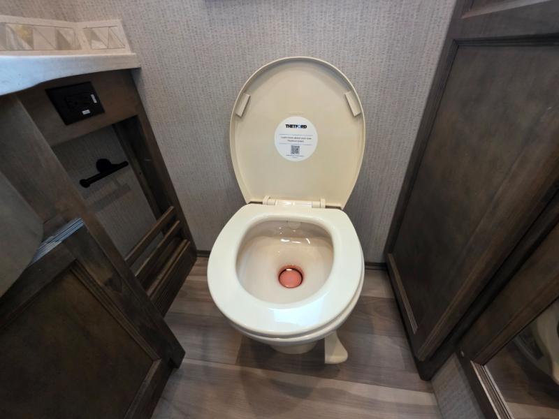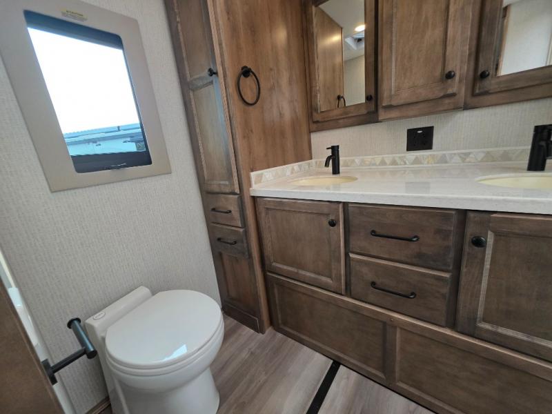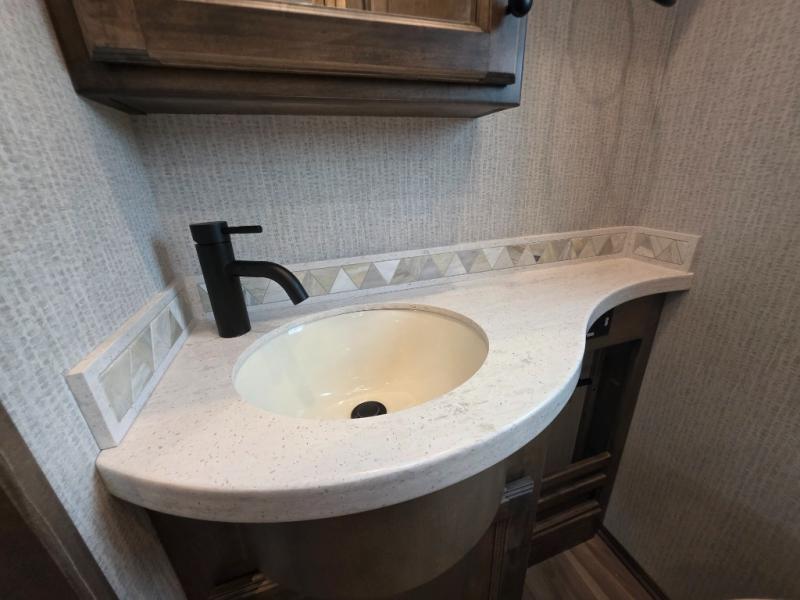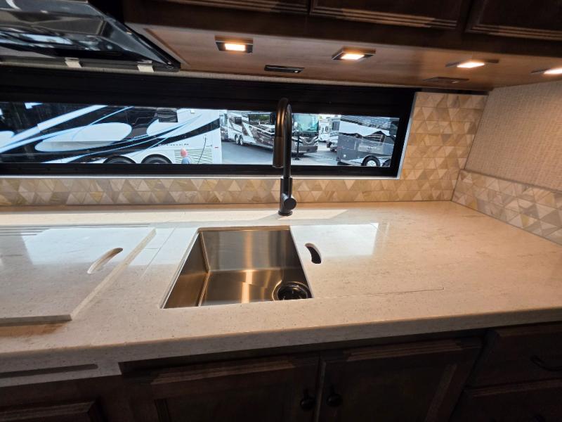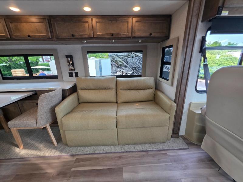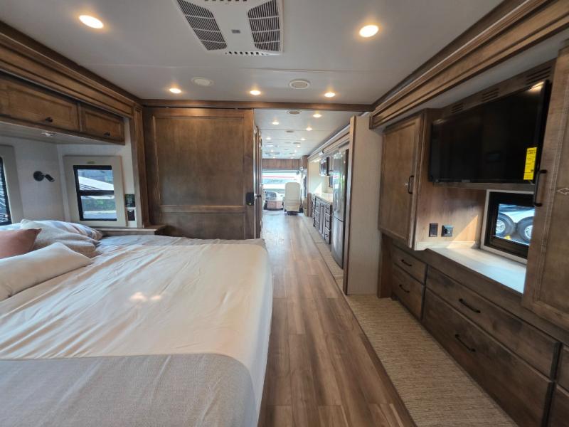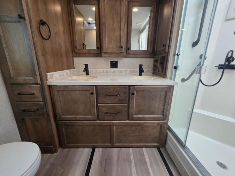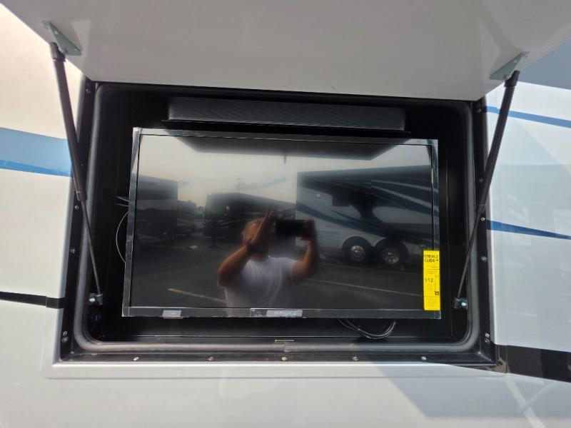One step inside this spacious coach and you'll be sold! There is a bath and a half to make traveling with friends and family easier than ever. The full-wall slide will make your space feel more open, plus there is a king bed slide out and a third slide out so everyone is comfortable. This model includes theater seats, a lift TV within the entertainment center, along with drawer storage to keep movies organized, and an optional fireplace. You'll be pleasantly surprised by the full kitchen with its three burner cooktop, 1.5 cu. ft. Smart convection microwave, plus a pantry and 18 cu. ft. residential refrigerator with a bottom freezer to keep ice cream stocked up! When you're ready for some shut-eye, the master bedroom will be waiting for you, while your guests sleep on the booth dinette sleeper, or you can choose the optional drop-down front bunk for more sleeping space!