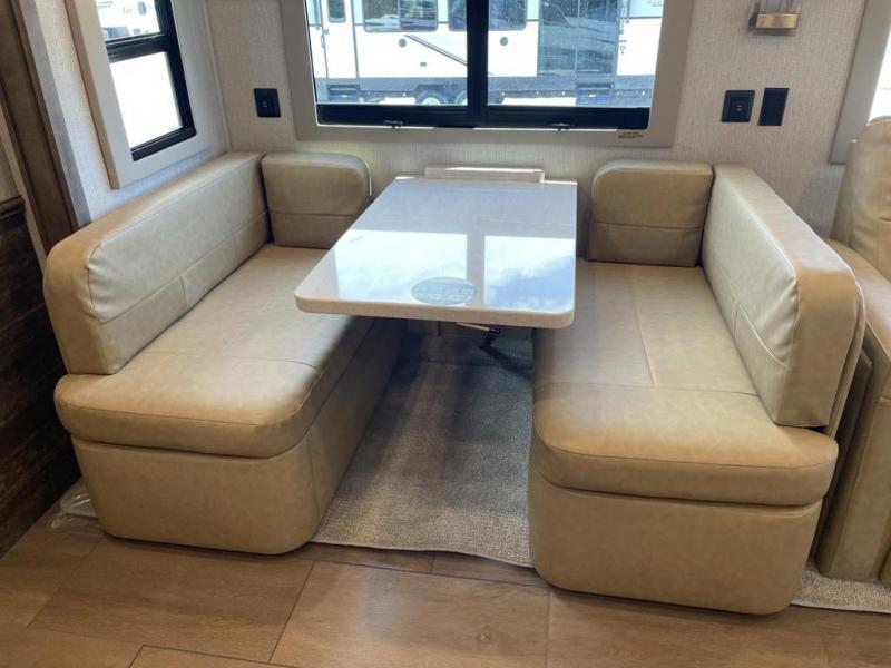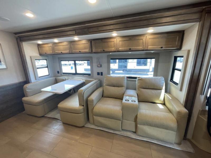 One step inside this spacious coach and you'll be sold! There is a bath and a half to make traveling with friends and family easier than ever. The full-wall slide will make your space feel more open, plus there is a king bed slide out and a third slide out so everyone is comfortable. This model includes theater seats, a lift TV within the entertainment center, along with drawer storage to keep movies organized, and an optional fireplace. You'll be pleasantly surprised by the full kitchen with its three burner cooktop, 1.5 cu. ft. Smart convection microwave, plus a pantry and 18 cu. ft. residential refrigerator with a bottom freezer to keep ice cream stocked up! When you're ready for some shut-eye, the master bedroom will be waiting for you, while your guests sleep on the booth dinette sleeper, or you can choose the optional drop-down front bunk for more sleeping space!