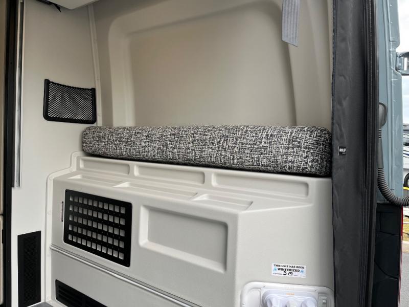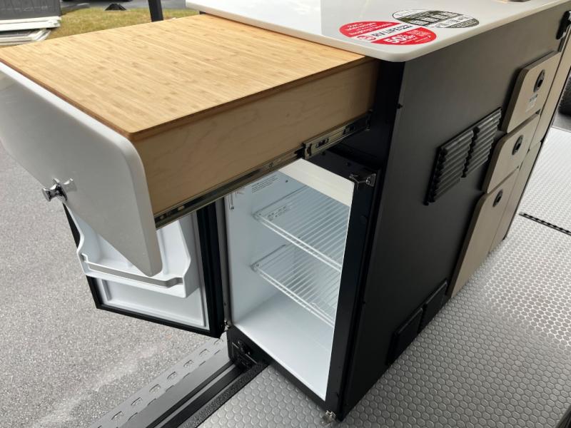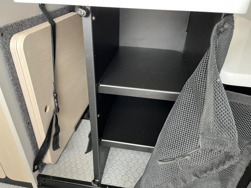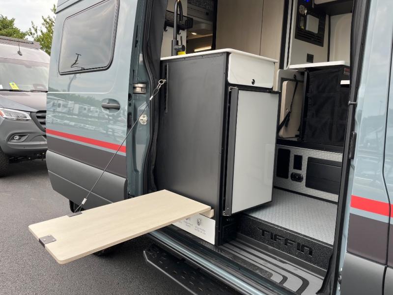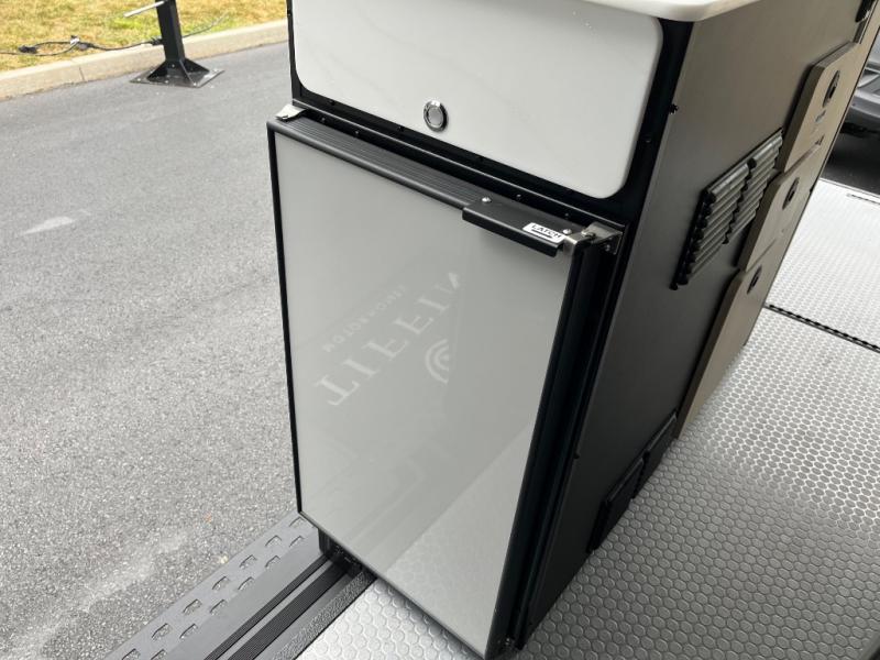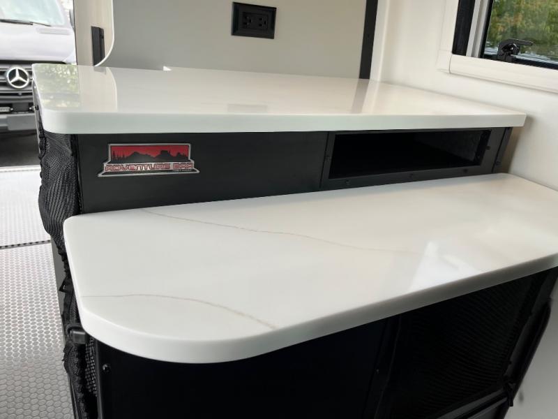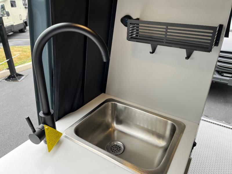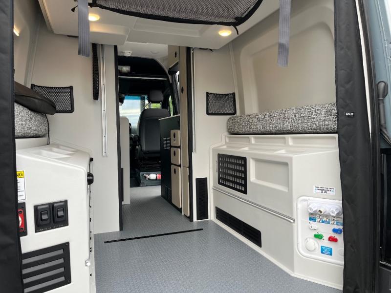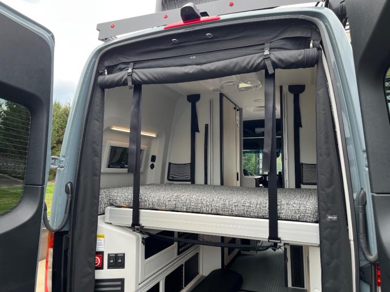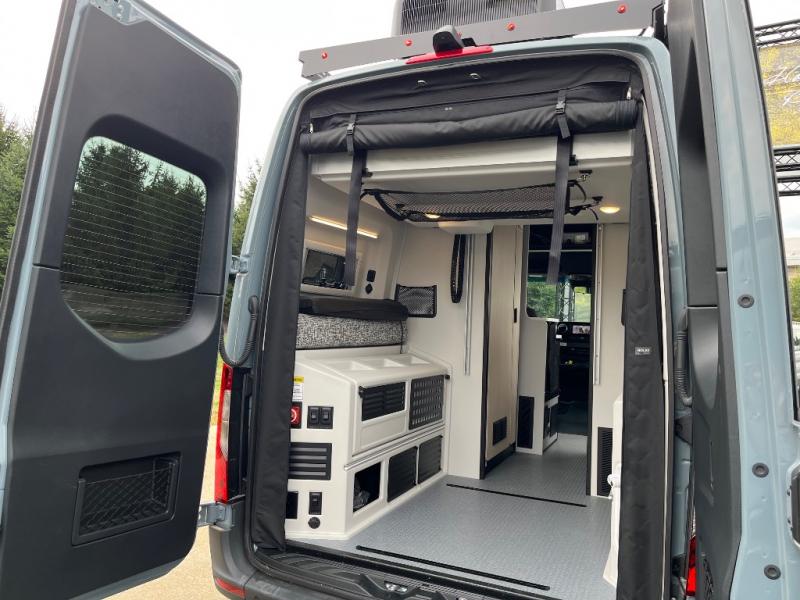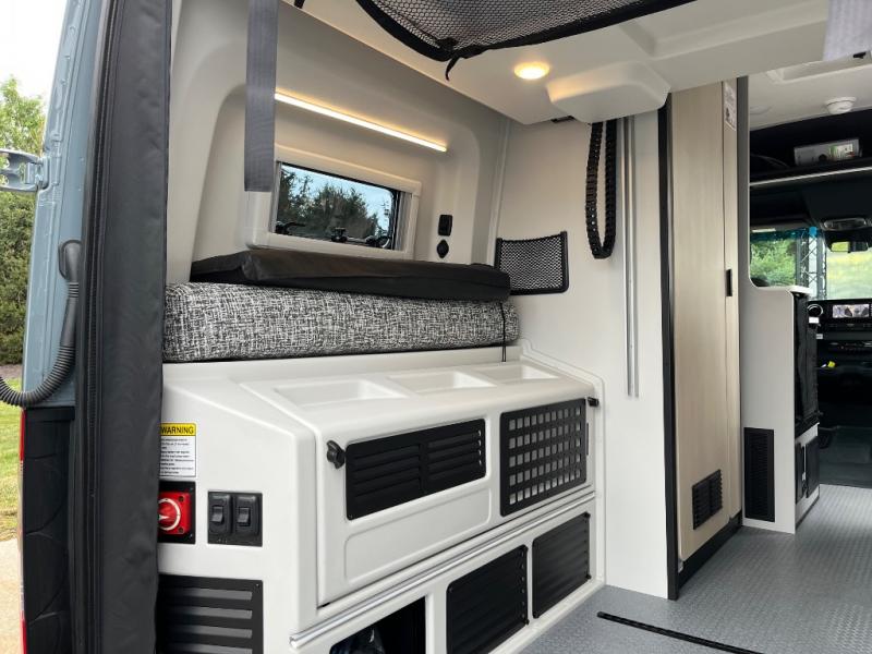 Pick a place, any place, and start packing. This off-road capable diesel van features a 49" x 79" gear garage beneath the power lift bed where you can store camp chairs, paddle boards for the lake, outdoor games and plenty of hiking gear. The on-board wet bath will keep you fresh and clean, and you can easily whip up meals and snacks in the kitchen with a single-burner induction cooktop and refrigerator beneath the counter for your perishables. There is also a sink for cleaning up and a removable counter extension. An optional jump seat and removable wall mounted swivel table behind the driver's seat can accommodate you for meals or a game of cards, or you can choose the optional adventure bar work/storage solution in place of the jump seat. Both front driver and passenger seats swivel to the back so you'll have plenty of seating even with company. At night, the power lift bed will allow you to get a great night's rest so you can enjoy it all again the next day!