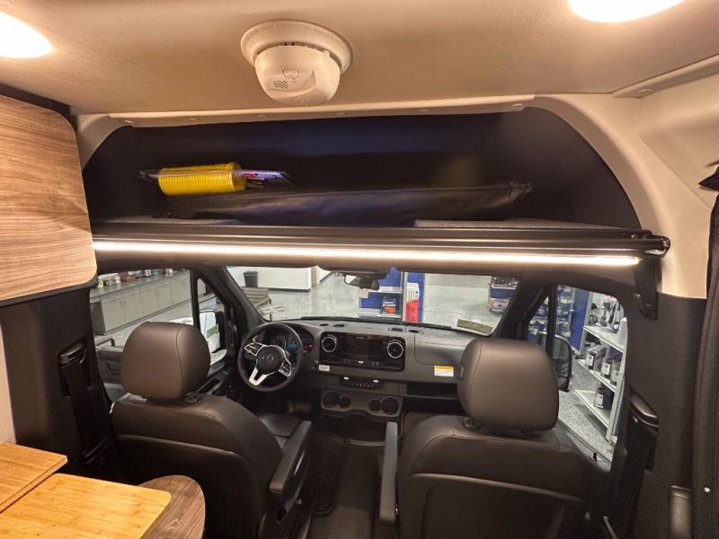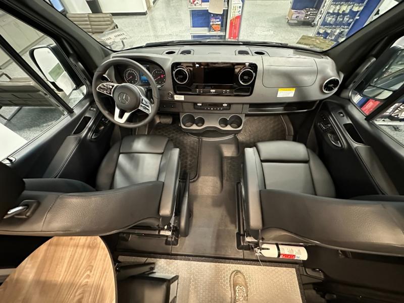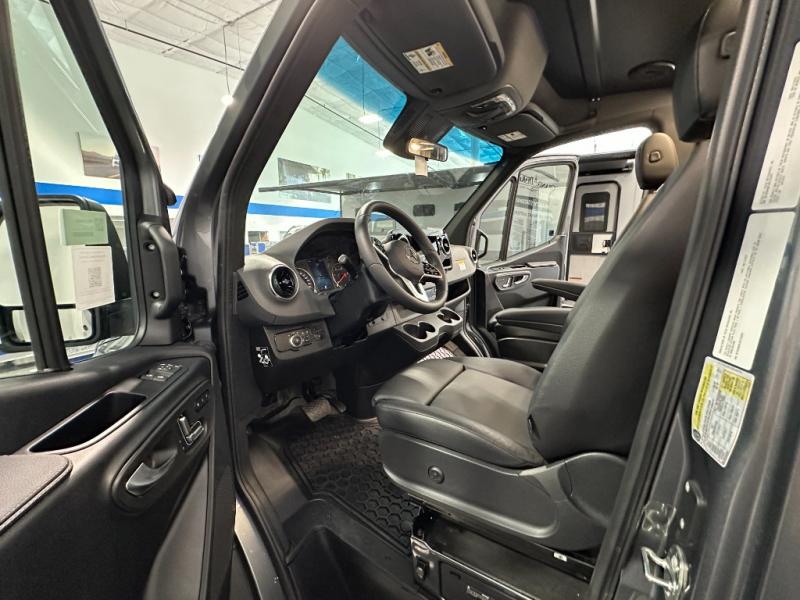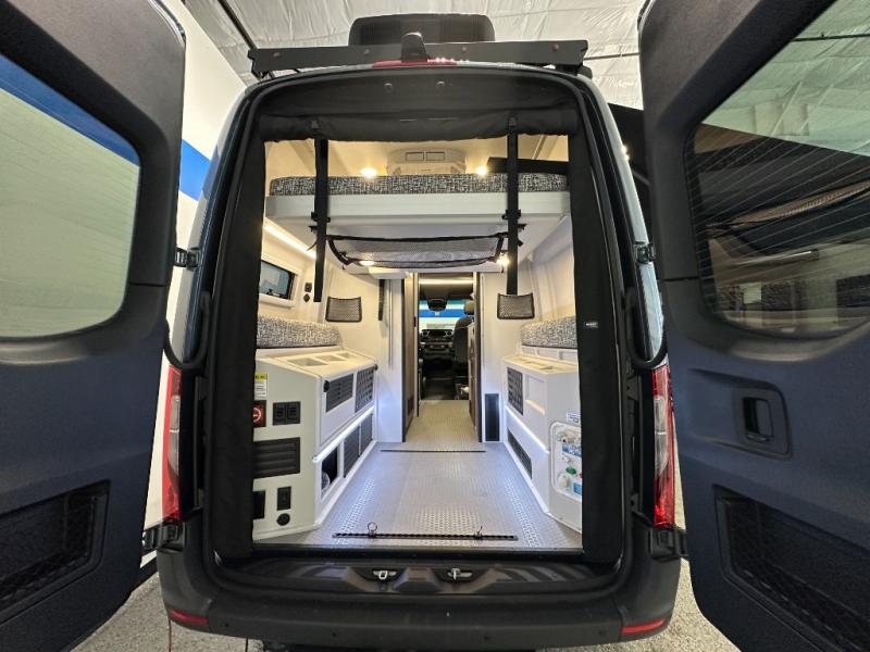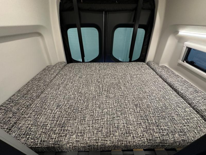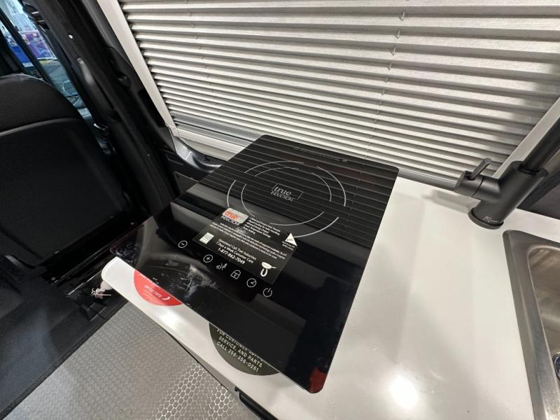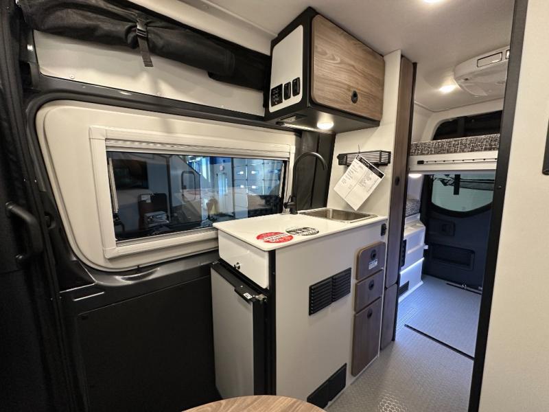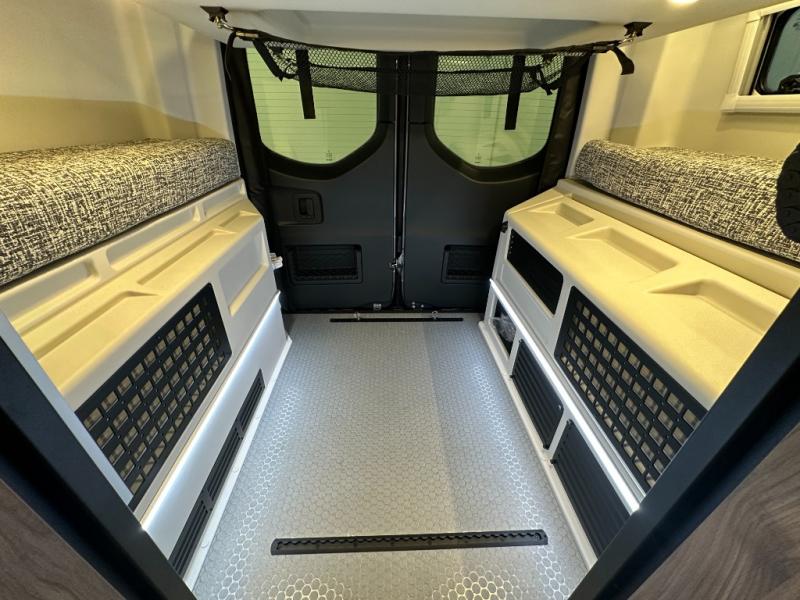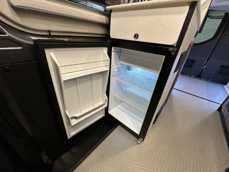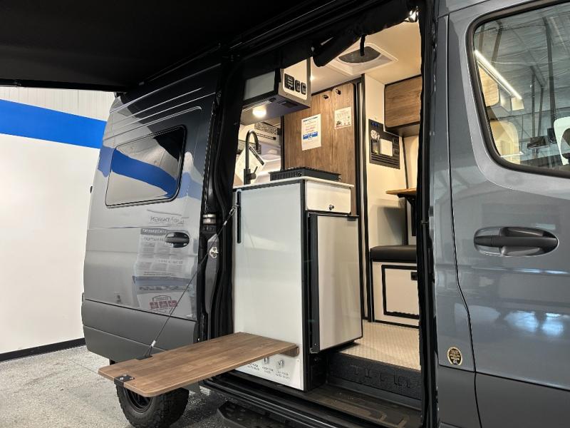 Pick a place, any place, and start packing. This off-road capable diesel van features a 49" x 79" gear garage beneath the power lift bed where you can store camp chairs, paddle boards for the lake, outdoor games and plenty of hiking gear. The on-board wet bath will keep you fresh and clean, and you can easily whip up meals and snacks in the kitchen with a single-burner induction cooktop and refrigerator beneath the counter for your perishables. There is also a sink for cleaning up and a removable counter extension. An optional jump seat and removable wall mounted swivel table behind the driver's seat can accommodate you for meals or a game of cards, or you can choose the optional adventure bar work/storage solution in place of the jump seat. Both front driver and passenger seats swivel to the back so you'll have plenty of seating even with company. At night, the power lift bed will allow you to get a great night's rest so you can enjoy it all again the next day!