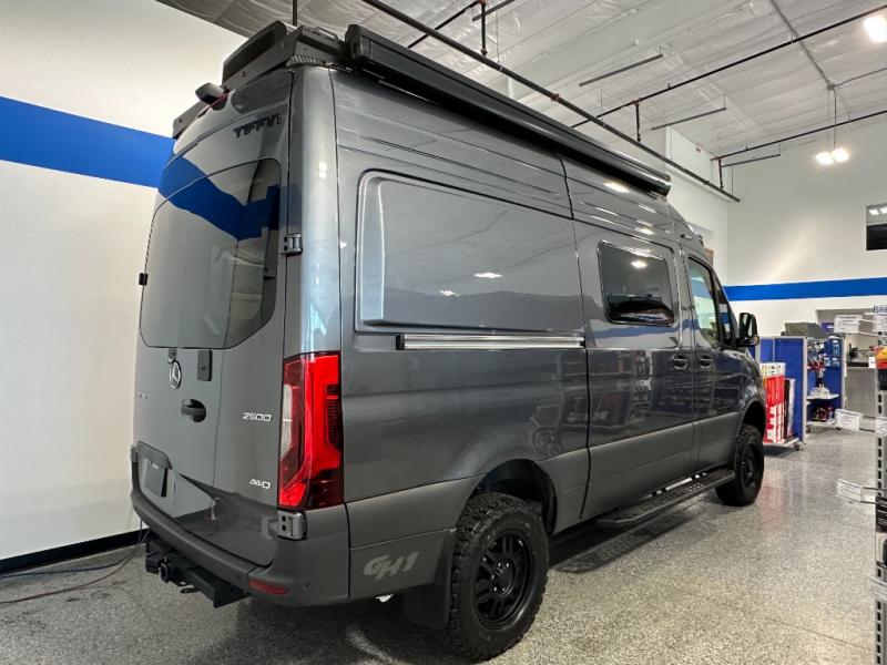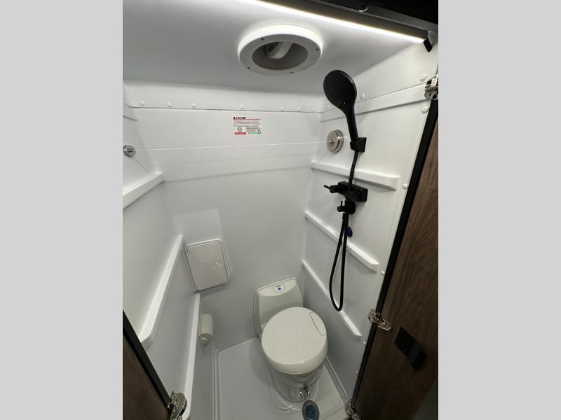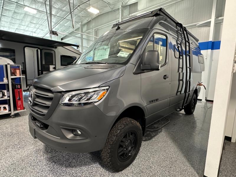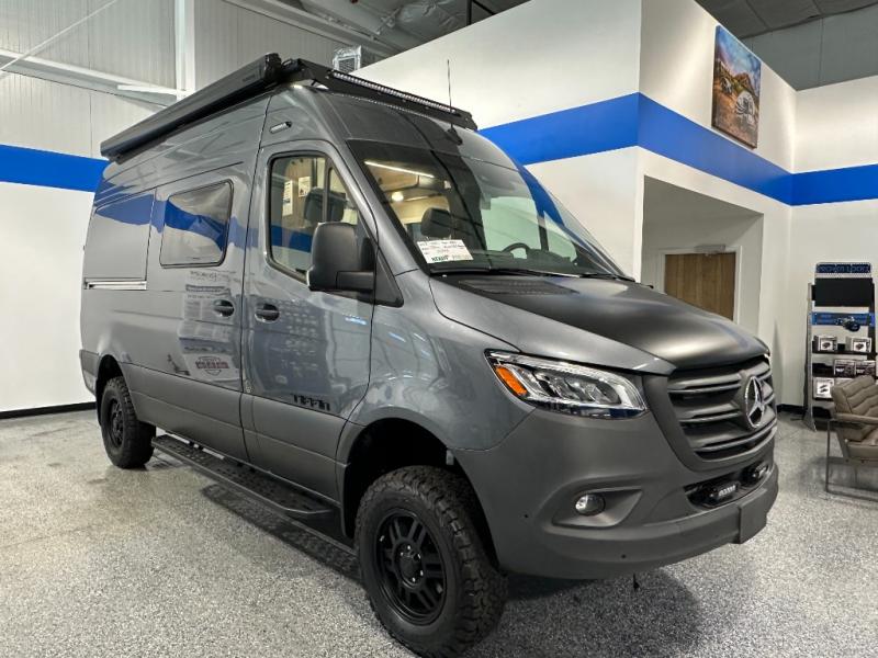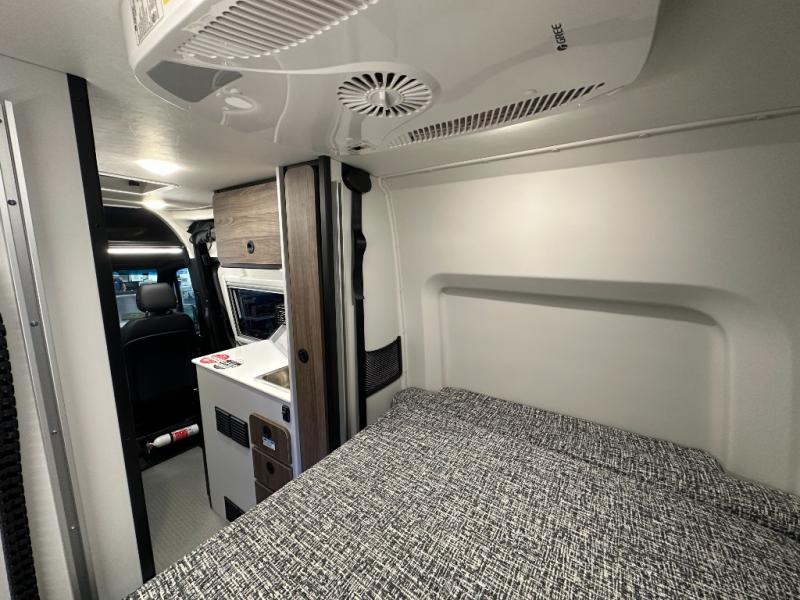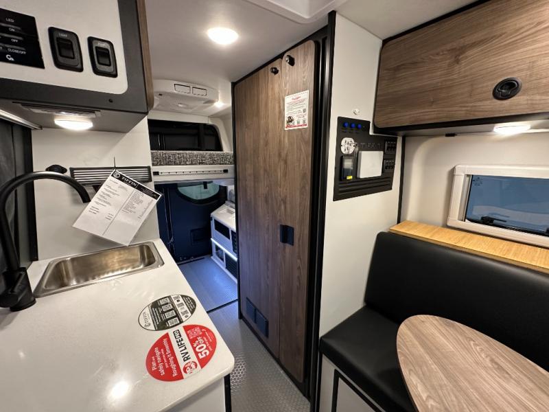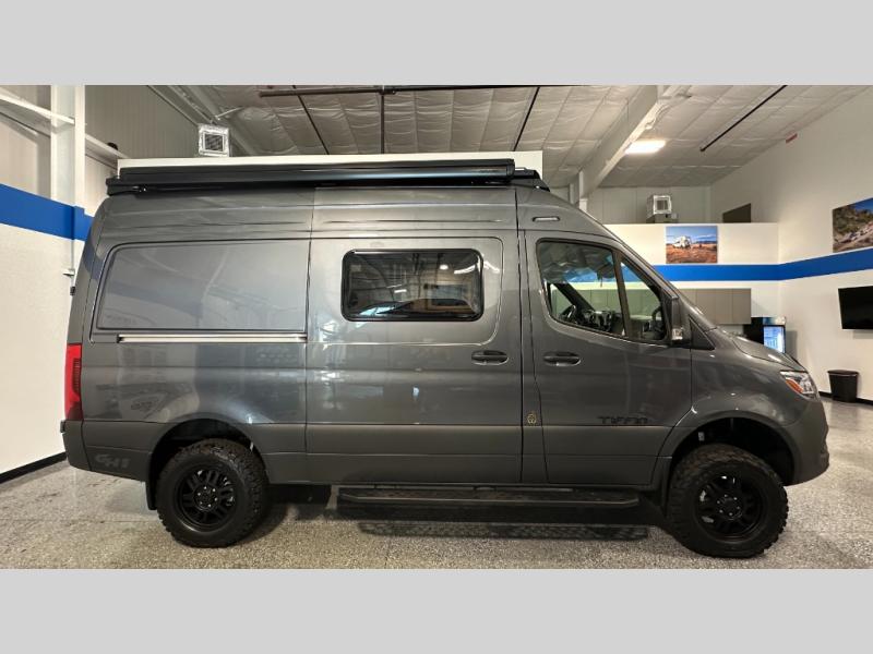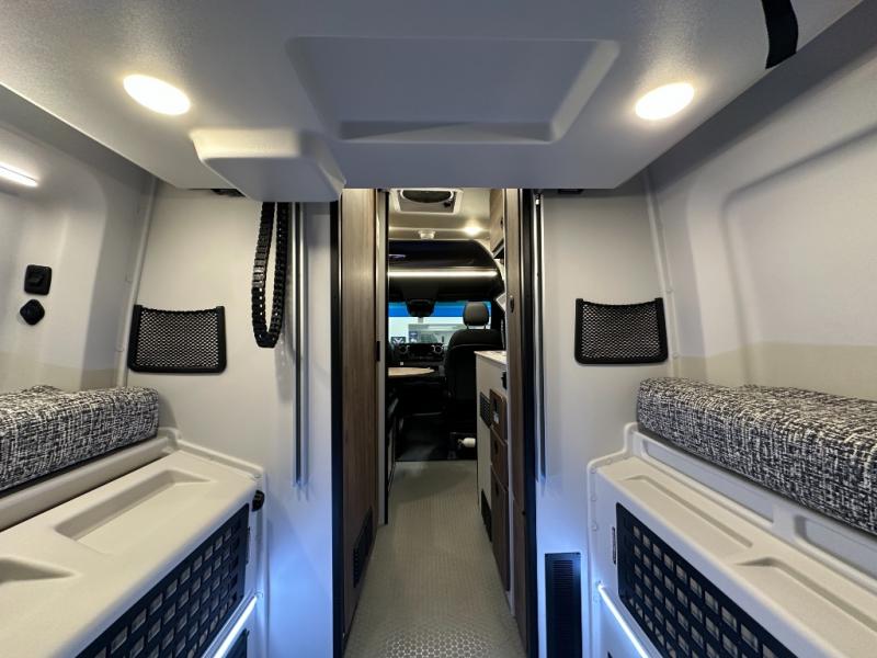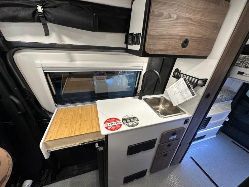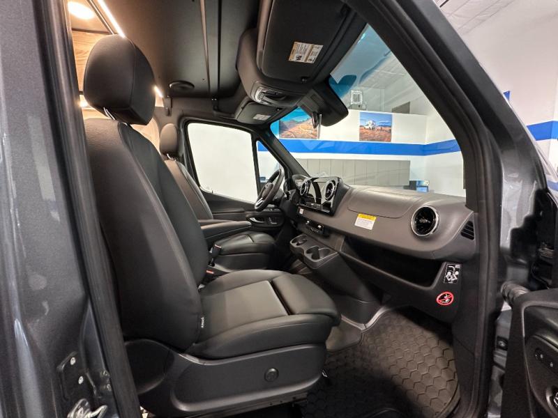 Pick a place, any place, and start packing. This off-road capable diesel van features a 49" x 79" gear garage beneath the power lift bed where you can store camp chairs, paddle boards for the lake, outdoor games and plenty of hiking gear. The on-board wet bath will keep you fresh and clean, and you can easily whip up meals and snacks in the kitchen with a single-burner induction cooktop and refrigerator beneath the counter for your perishables. There is also a sink for cleaning up and a removable counter extension. An optional jump seat and removable wall mounted swivel table behind the driver's seat can accommodate you for meals or a game of cards, or you can choose the optional adventure bar work/storage solution in place of the jump seat. Both front driver and passenger seats swivel to the back so you'll have plenty of seating even with company. At night, the power lift bed will allow you to get a great night's rest so you can enjoy it all again the next day!