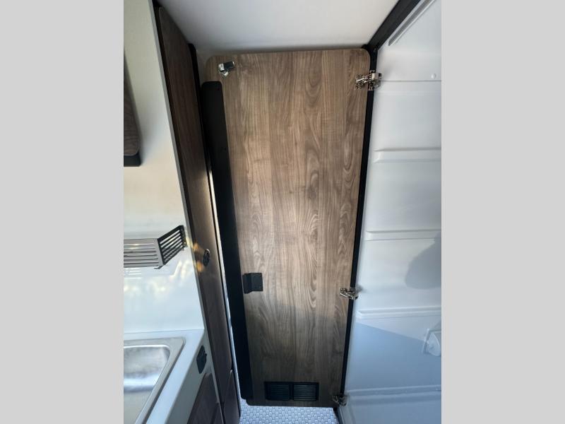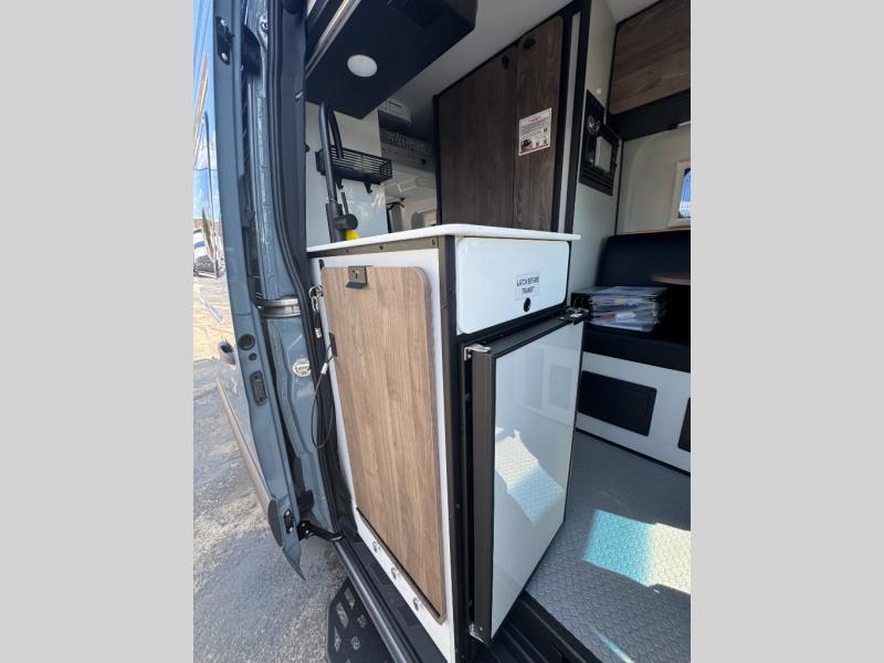 Pick a place, any place, and start packing. This off-road capable diesel van features a 49" x 79" gear garage beneath the power lift bed where you can store camp chairs, paddle boards for the lake, outdoor games and plenty of hiking gear. The on-board wet bath will keep you fresh and clean, and you can easily whip up meals and snacks in the kitchen with a single-burner induction cooktop and refrigerator beneath the counter for your perishables. There is also a sink for cleaning up and a removable counter extension. An optional jump seat and removable wall mounted swivel table behind the driver's seat can accommodate you for meals or a game of cards, or you can choose the optional adventure bar work/storage solution in place of the jump seat. Both front driver and passenger seats swivel to the back so you'll have plenty of seating even with company. At night, the power lift bed will allow you to get a great night's rest so you can enjoy it all again the next day!