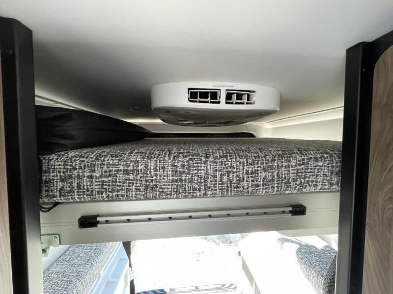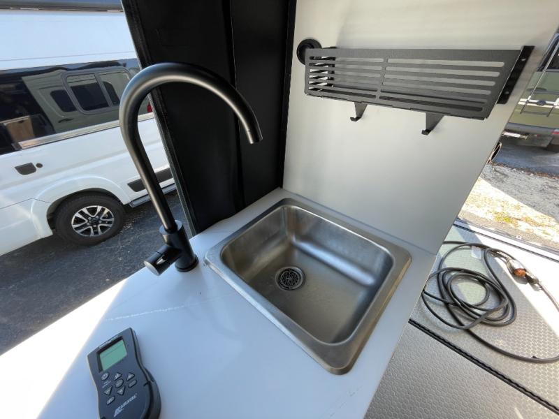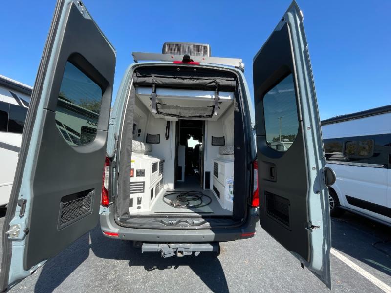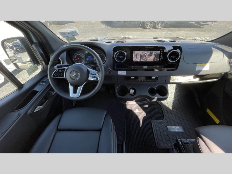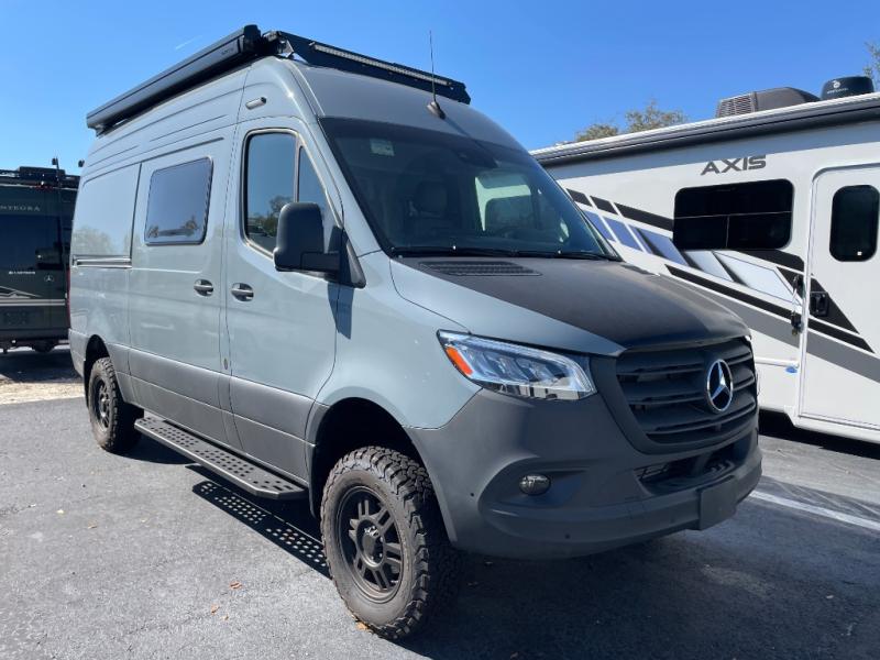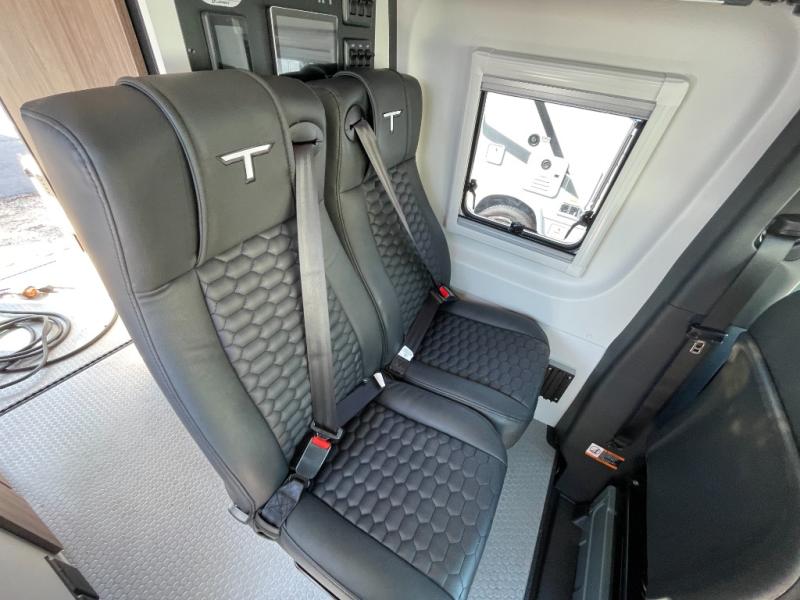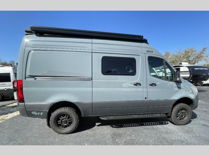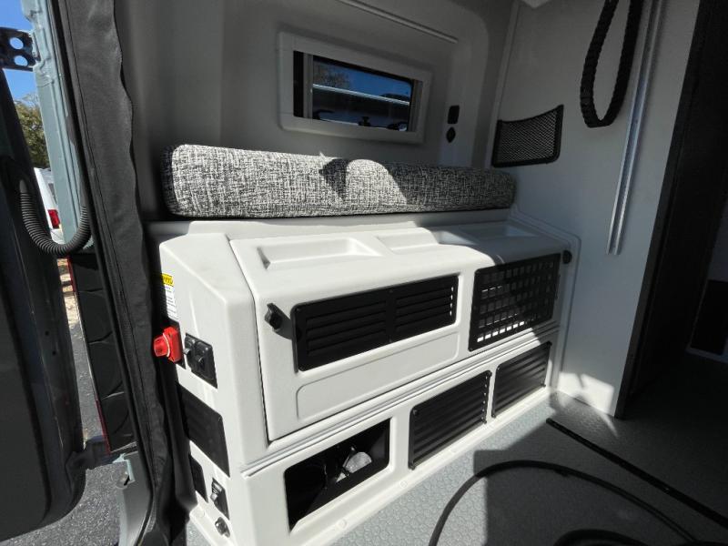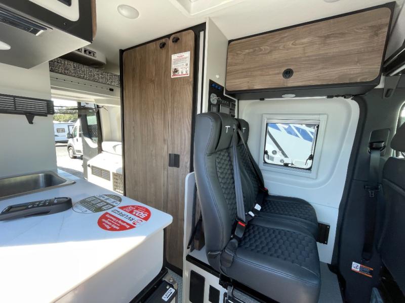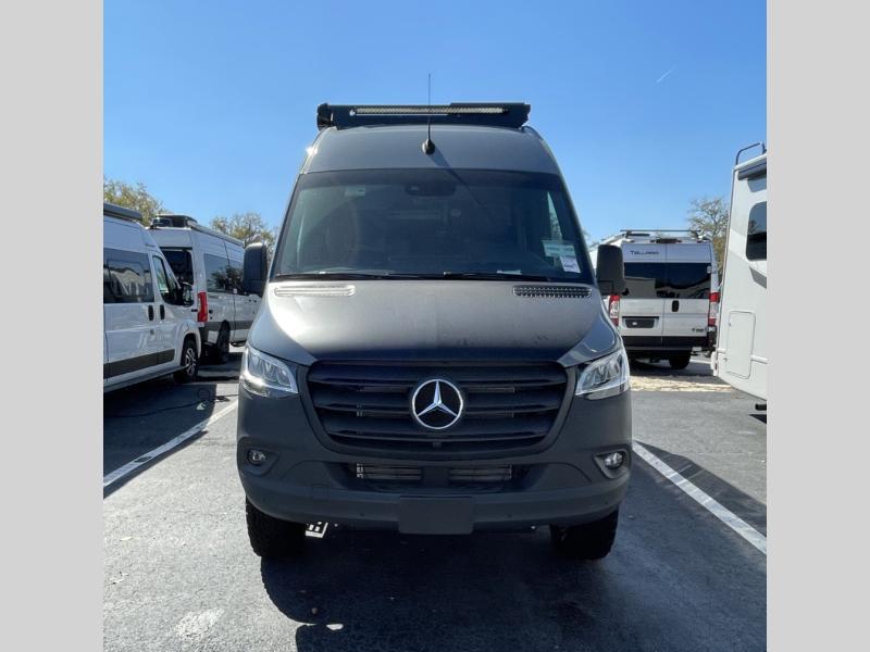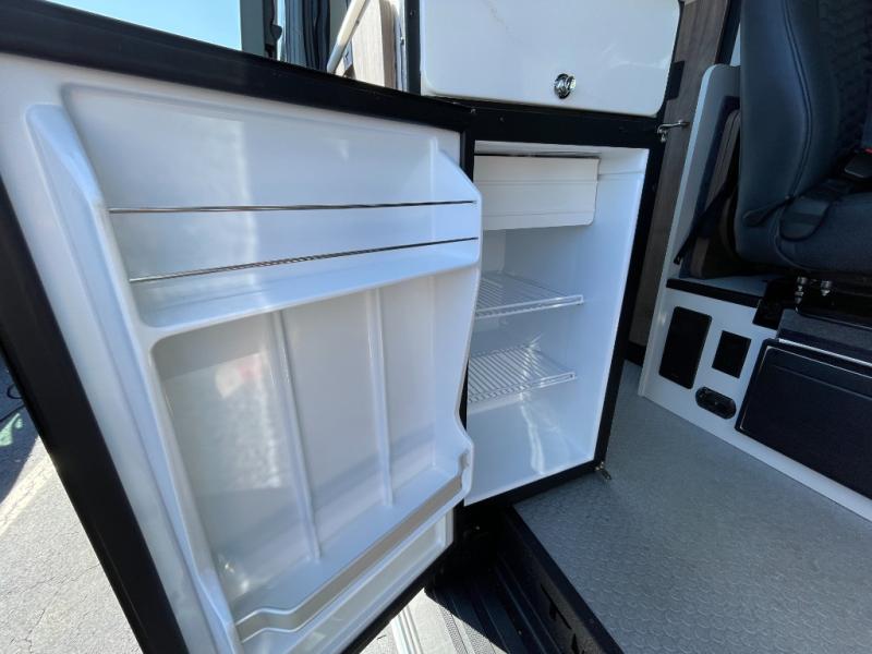 Pick a place, any place, and start packing. This off-road capable diesel van features a 49" x 79" gear garage beneath the power lift bed where you can store camp chairs, paddle boards for the lake, outdoor games and plenty of hiking gear. The on-board wet bath will keep you fresh and clean, and you can easily whip up meals and snacks in the kitchen with a single-burner induction cooktop and refrigerator beneath the counter for your perishables. There is also a sink for cleaning up and a removable counter extension. An optional jump seat and removable wall mounted swivel table behind the driver's seat can accommodate you for meals or a game of cards, or you can choose the optional adventure bar work/storage solution in place of the jump seat. Both front driver and passenger seats swivel to the back so you'll have plenty of seating even with company. At night, the power lift bed will allow you to get a great night's rest so you can enjoy it all again the next day!