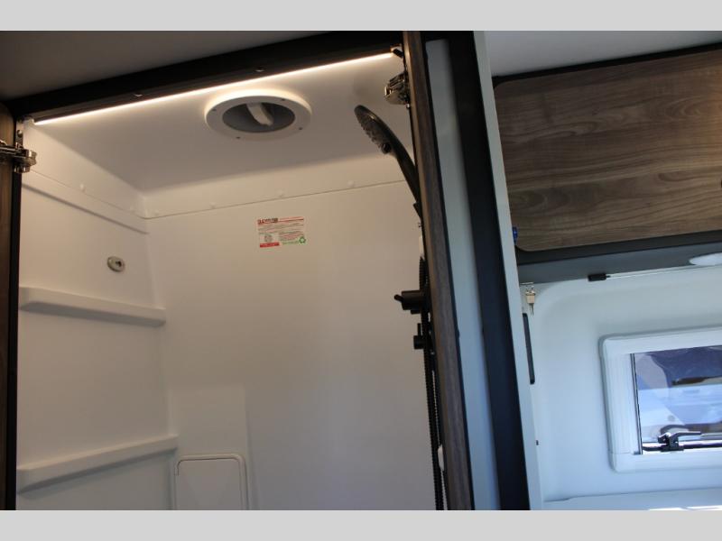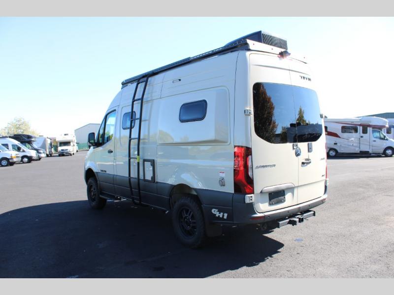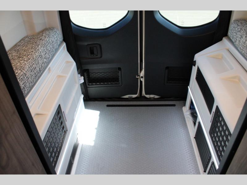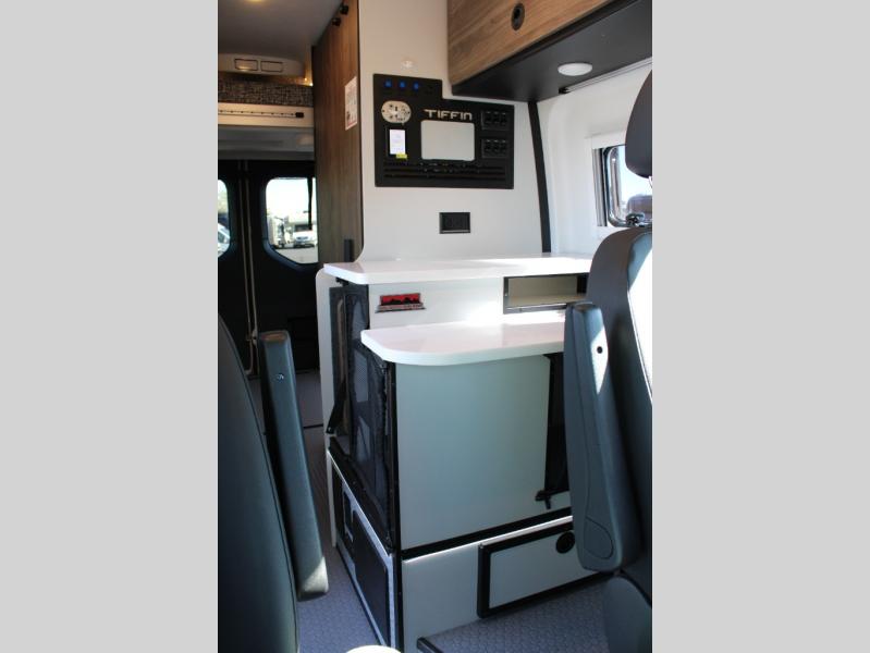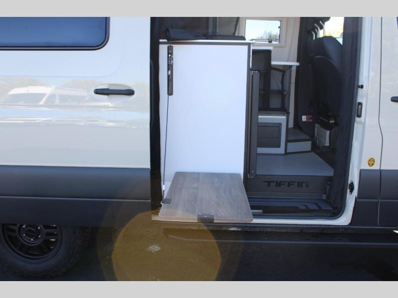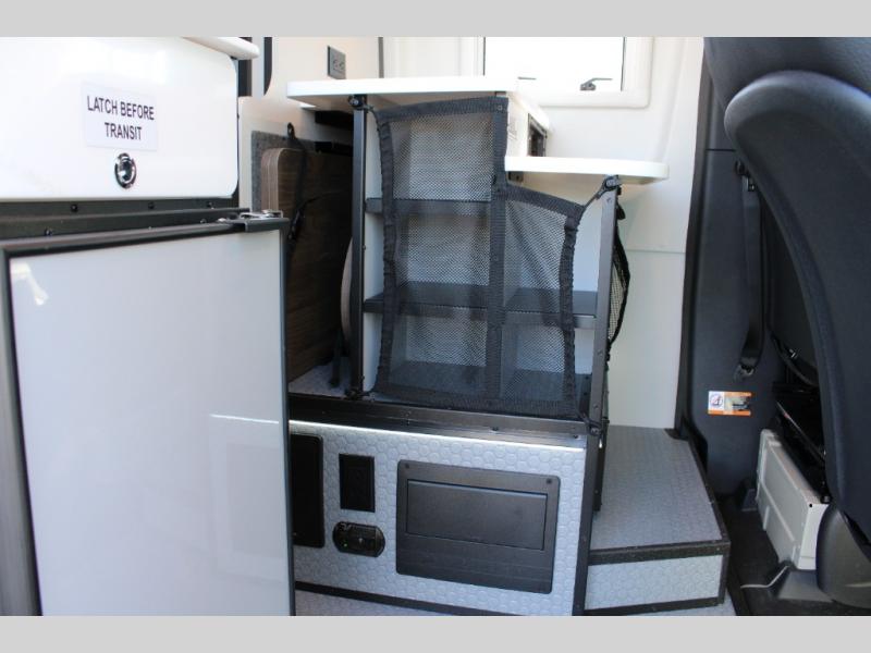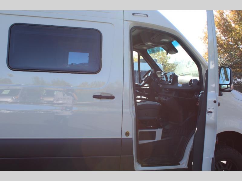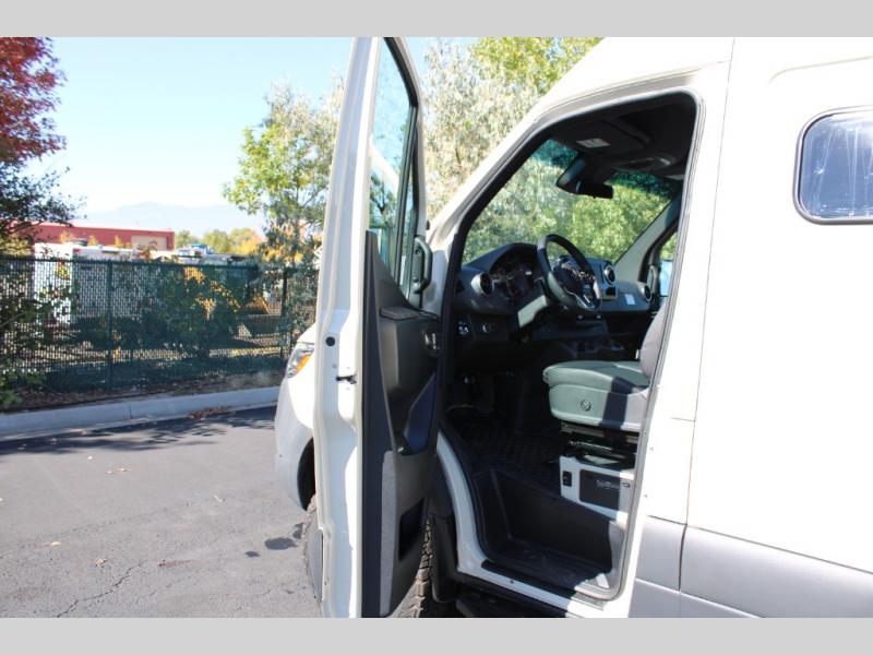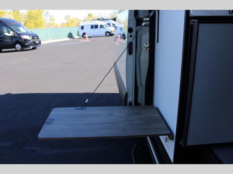 Pick a place, any place, and start packing. This off-road capable diesel van features a 49" x 79" gear garage beneath the power lift bed where you can store camp chairs, paddle boards for the lake, outdoor games and plenty of hiking gear. The on-board wet bath will keep you fresh and clean, and you can easily whip up meals and snacks in the kitchen with a single-burner induction cooktop and refrigerator beneath the counter for your perishables. There is also a sink for cleaning up and a removable counter extension. An optional jump seat and removable wall mounted swivel table behind the driver's seat can accommodate you for meals or a game of cards, or you can choose the optional adventure bar work/storage solution in place of the jump seat. Both front driver and passenger seats swivel to the back so you'll have plenty of seating even with company. At night, the power lift bed will allow you to get a great night's rest so you can enjoy it all again the next day!