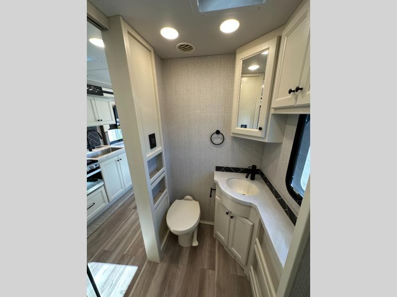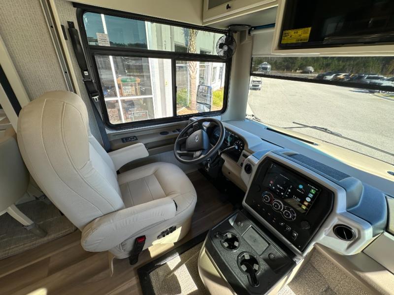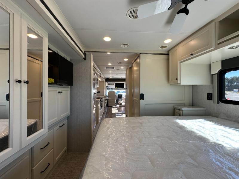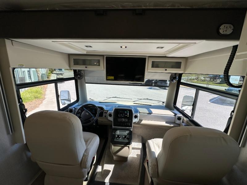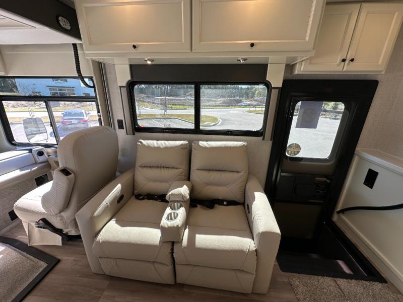 You'll love how easy it will be to maneuver this coach since it comes in at only 32-feet in length! The full-wall slide will open up your space so you can cook on the three burner range and dine at the booth dinette-sleeper. There is also a residential refrigerator and a pantry for food storage plus a bedroom wardrobe with drawers within the slide to keep your thing tidy. Once dinner is cleaned up, you can relax on the theater seating across from the wall mounted TV, or head outdoors to visit under the Girard power awning with LED lights. You're sure to get a great night's rest on the king bed, while your guests sleep on the booth dinette-sleeper. And if you're needing additional sleeping space, just choose the optional drop-down cab bunk!