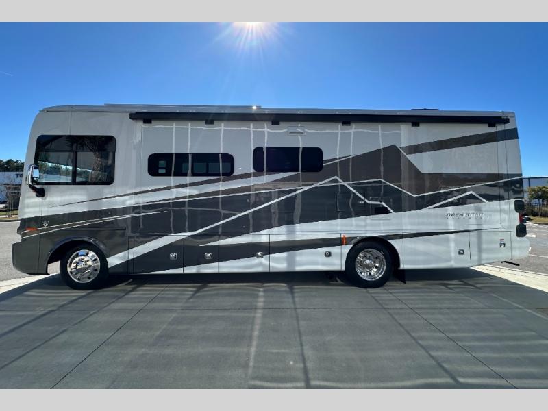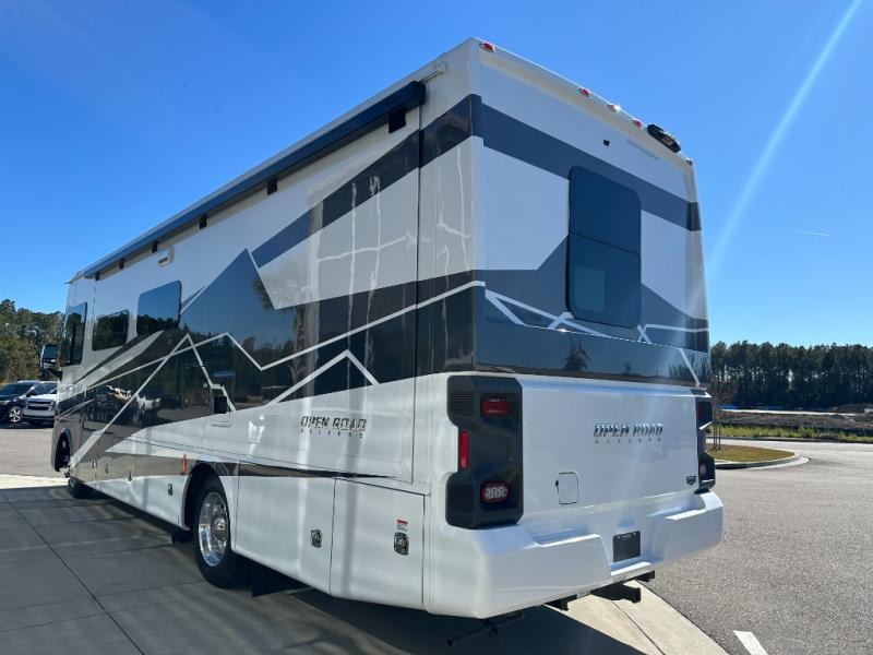 Every one of these Tiffin Motorhomes Open Road Allegro Class A gas motorhomes are ready to go when ever you are! A Ford 7.3L V8 engine powers these units and a durable, yet lightweight, tubular aluminum wall skeleton holds them together. They are beautifully designed with handcrafted cabinetry and a panoramic kitchen galley window for breathtaking views. A couple electronic features you will appreciate include an exterior TV with a soundbar and a Spyder multiplex system, plus there are two 13.5k BUT AC units to keep you cool on those hot summer days. The color back-up camera and side-view cameras will make parking easier than ever, and you'll appreciate hydraulic leveling jacks with a control panel for hassle-free set up. You'll love the new decor options, along with the new Generation 12 exterior color paint options, plus a 10" detachable touchscreen with a media center!