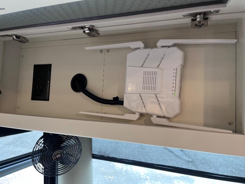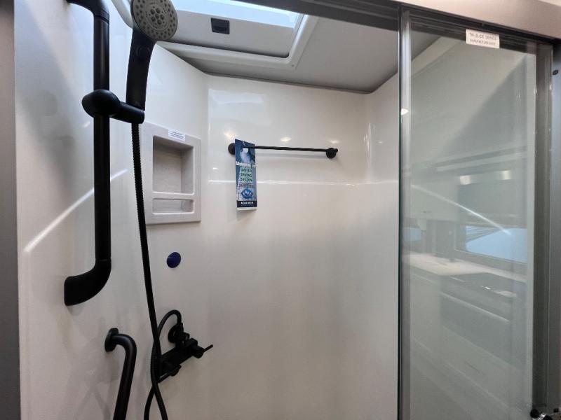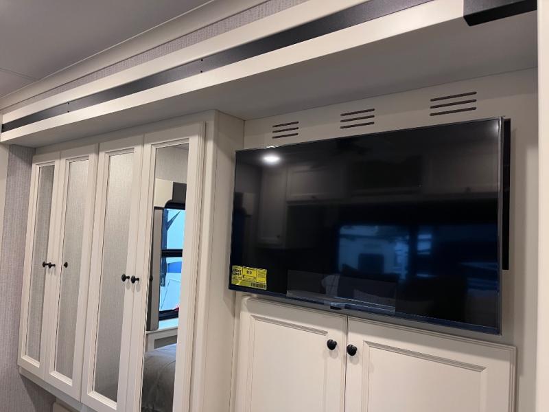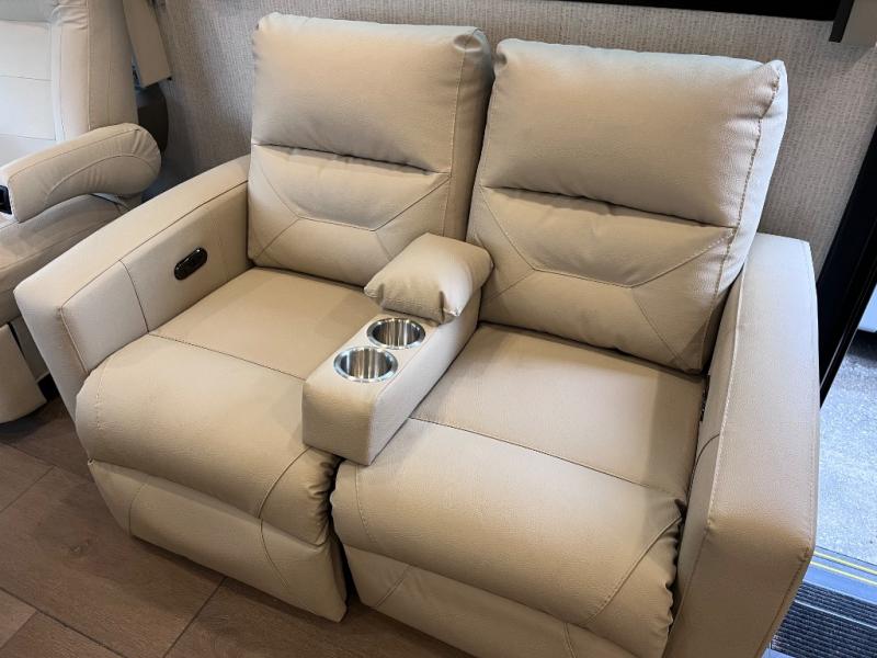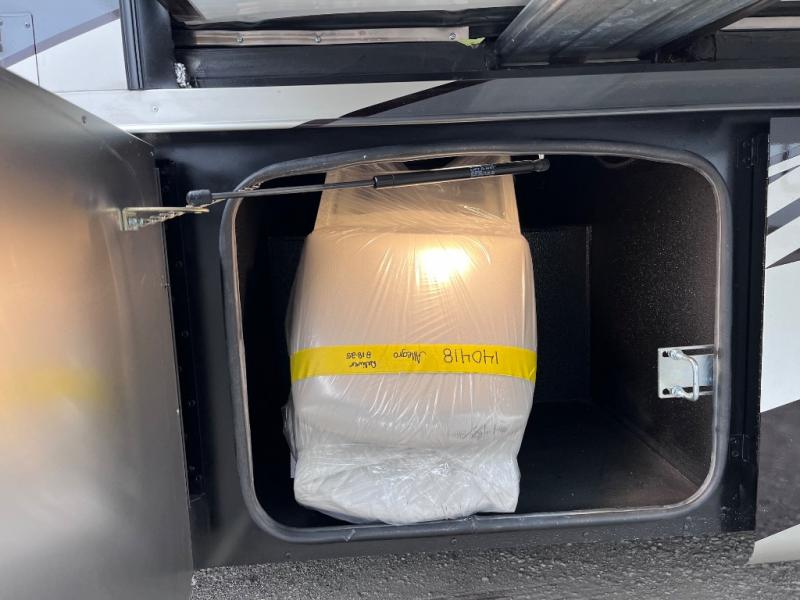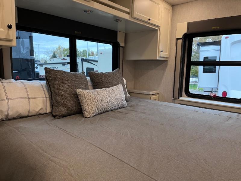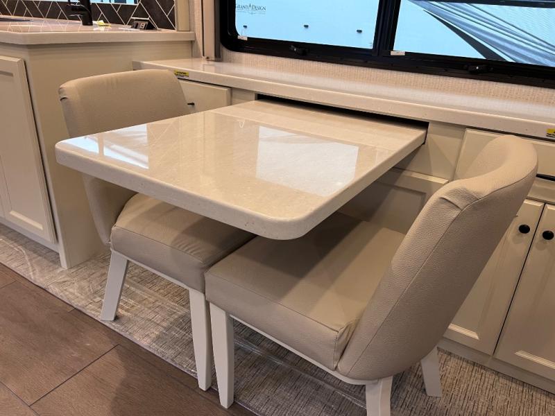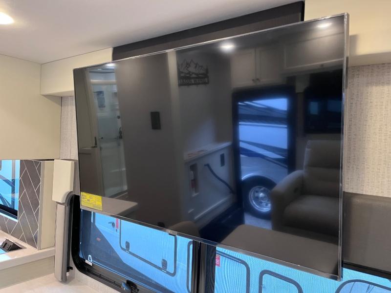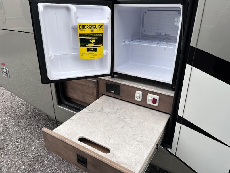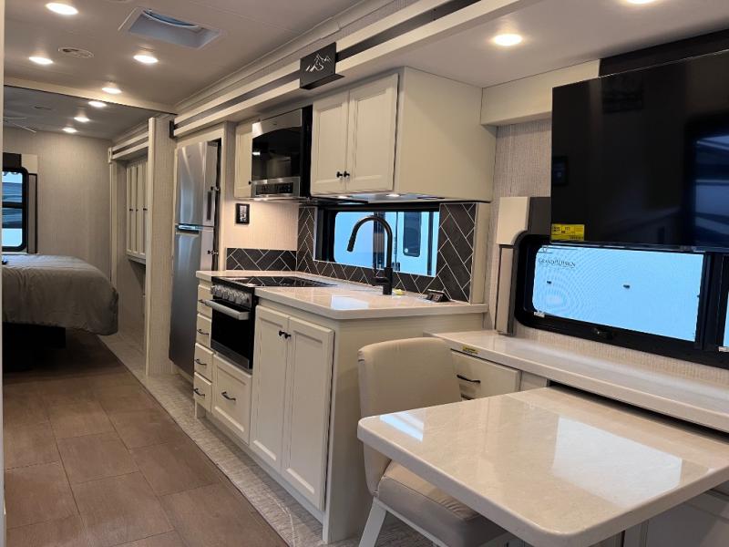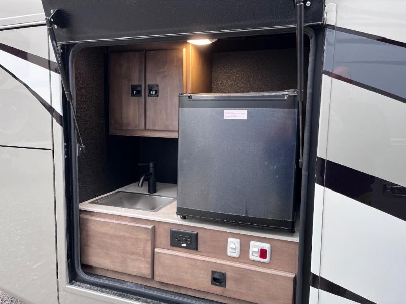 You'll love how easy it will be to maneuver this coach since it comes in at only 32-feet in length! The full-wall slide will open up your space so you can cook on the three burner range and dine at the booth dinette-sleeper. There is also a residential refrigerator and a pantry for food storage plus a bedroom wardrobe with drawers within the slide to keep your thing tidy. Once dinner is cleaned up, you can relax on the theater seating across from the wall mounted TV, or head outdoors to visit under the Girard power awning with LED lights. You're sure to get a great night's rest on the king bed, while your guests sleep on the booth dinette-sleeper. And if you're needing additional sleeping space, just choose the optional drop-down cab bunk!