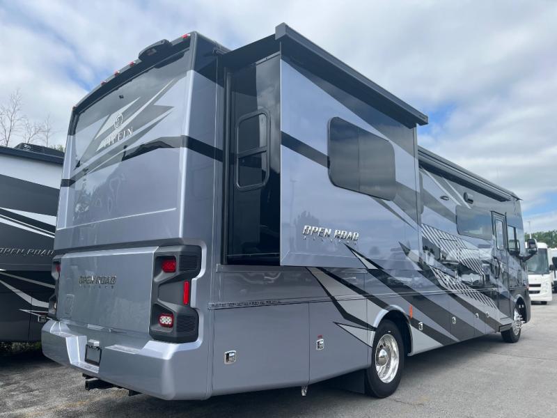 Every one of these Tiffin Motorhomes Open Road Allegro Class A gas motorhomes are ready to go when ever you are! A Ford 7.3L V8 engine powers these units and a durable, yet lightweight, tubular aluminum wall skeleton holds them together. They are beautifully designed with handcrafted cabinetry, Ultrafabrics, and a panoramic kitchen galley window for breathtaking views. A couple electronic features you will appreciate include an exterior TV with a soundbar and a Spyder multiplex system, plus there are two 13.5k BUT AC units to keep you cool on those hot summer days. The color back-up camera and side-view cameras will make parking easier than ever, and you'll appreciate hydraulic leveling jacks with a control panel for hassle-free set up. New features include an exterior ladder now standard, new Generation 11 paint schemes, optional Starlink prep, and more!
