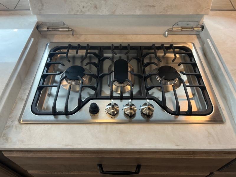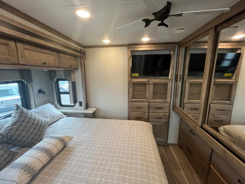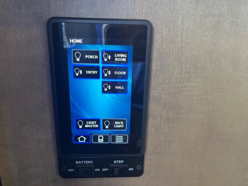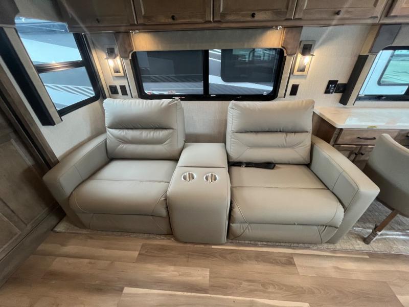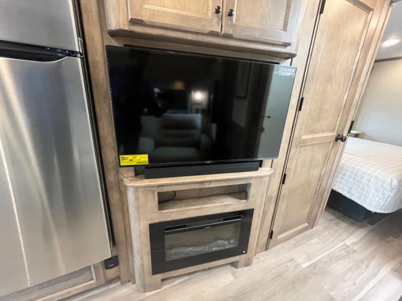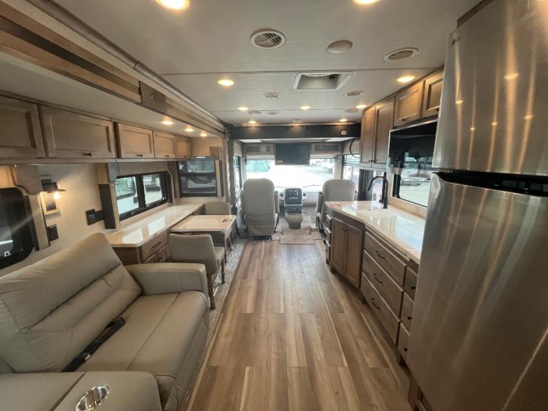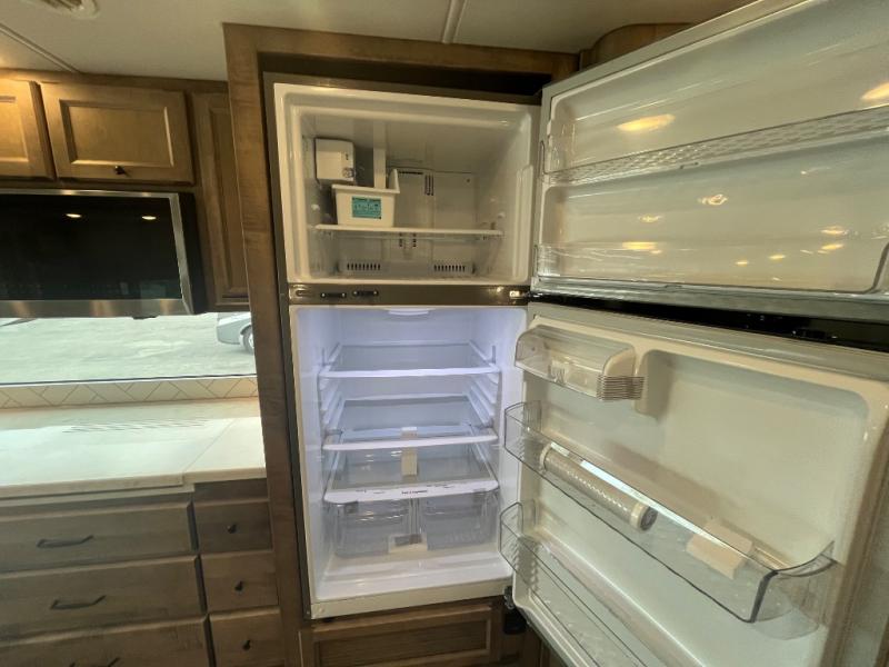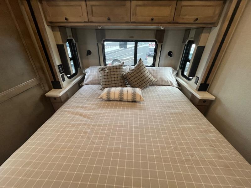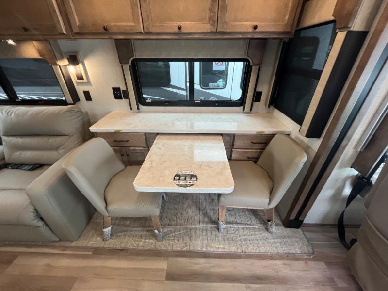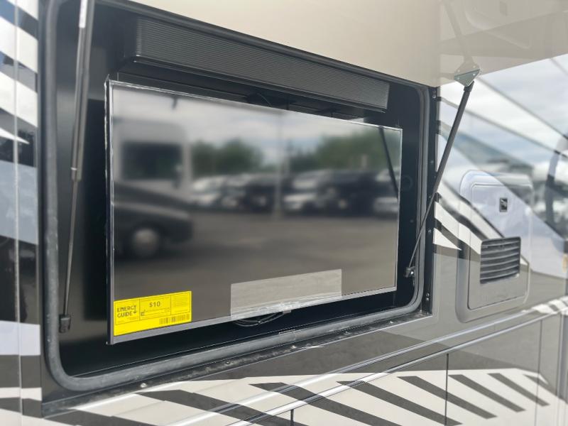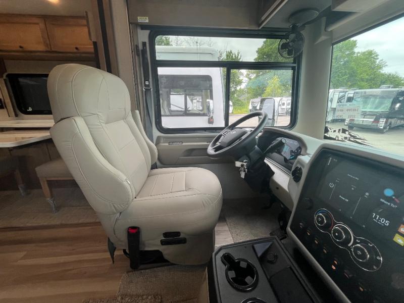 You will feel right at home in this motorhome! This RV features a rear private bedroom with a king bed slide that has an egress window behind it, a wardrobe with drawers, and an optional combo washer/dryer. Just outside the bedroom is the split-style bath where one person can freshen up in the shower while another uses the private toilet and sink. After you have prepared a delicious meal with the three burner liquid propane cooktop, you can enjoy it at the booth dinette-sleeper. The dinette can become your guests' sleeping space at night, along with the flip and fold sofa bed or the optional drop-down front bunk! You can also choose the optional theater seating if you don't need the additional sleeping space. This model also includes a living area TV with an optional fireplace below, a 20 cu. ft. stainless steel residential refrigerator with a top freezer, and many more interior comforts!