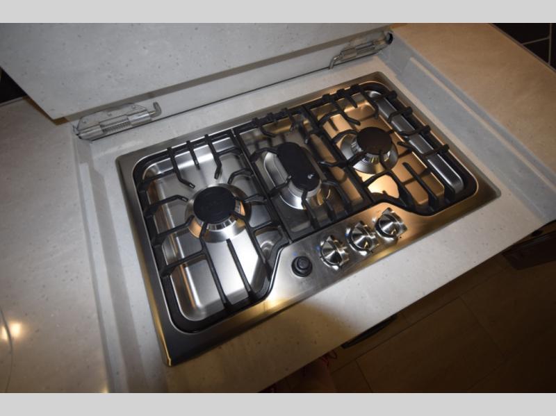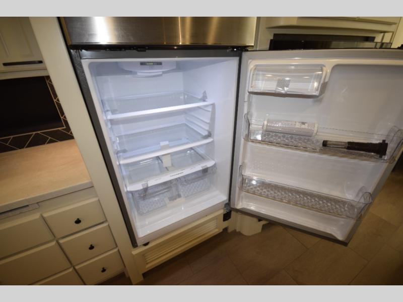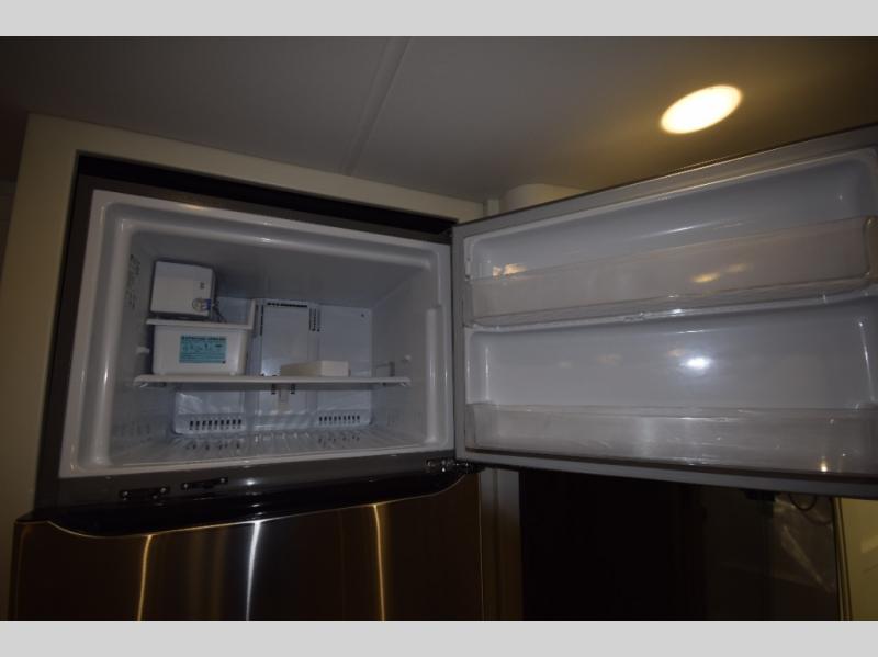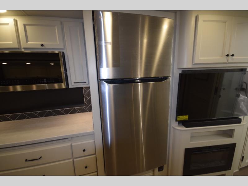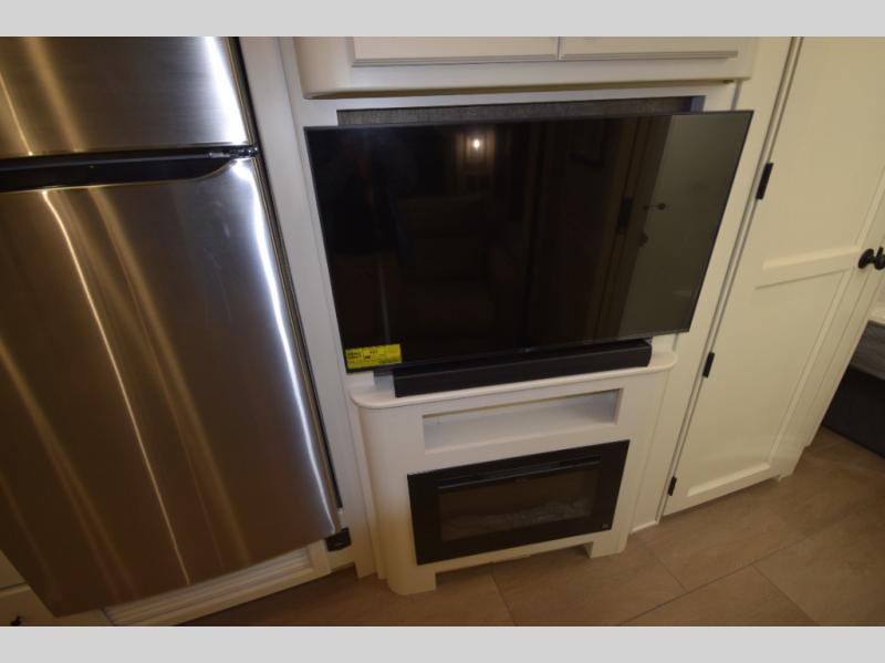 Cook delicious meals with ease thanks to the three-burner liquid propane cooktop and the 20 cu. ft. stainless steel residential refrigerator with a top freezer. This kitchen is perfect for preparing meals on the go. The living area features a TV with an optional fireplace below, offering warmth and ambiance for those chilly evenings.