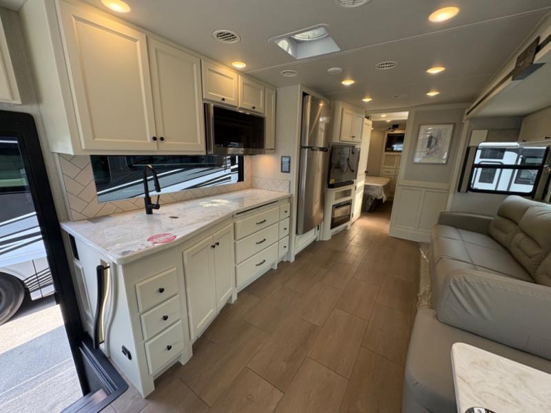 Every one of these Tiffin Motorhomes Open Road Allegro Class A gas motorhomes are ready to go when ever you are! A Ford 7.3L V8 engine powers these units and a durable, yet lightweight, tubular aluminum wall skeleton holds them together. They are beautifully designed with handcrafted cabinetry and a panoramic kitchen galley window for breathtaking views. A couple electronic features you will appreciate include an exterior TV with a soundbar and a Spyder multiplex system, plus there are two 13.5k BUT AC units to keep you cool on those hot summer days. The color back-up camera and side-view cameras will make parking easier than ever, and you'll appreciate hydraulic leveling jacks with a control panel for hassle-free set up. You'll love the new decor options, along with the new Generation 12 exterior color paint options, plus a 10" detachable touchscreen with a media center!