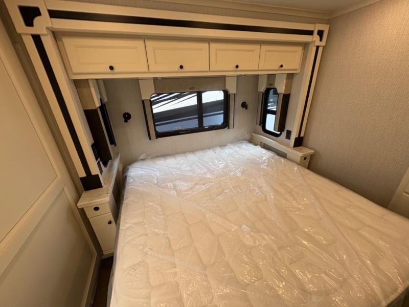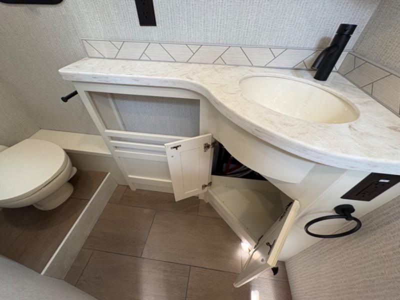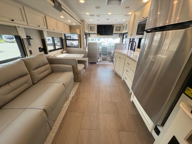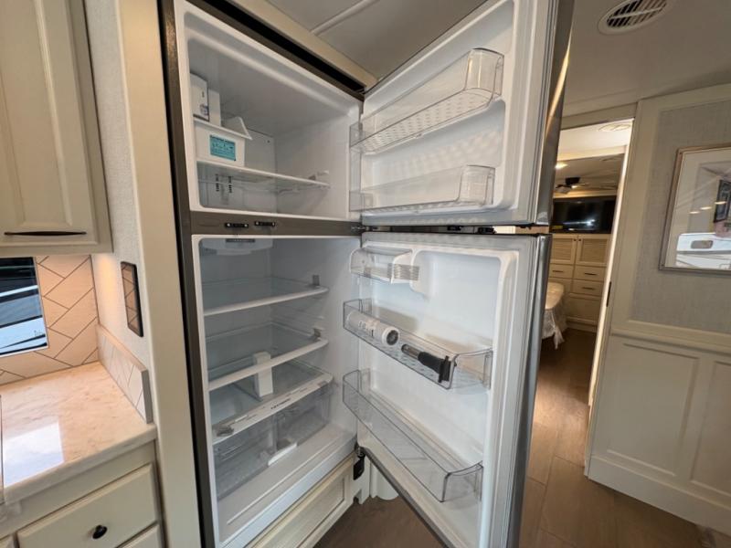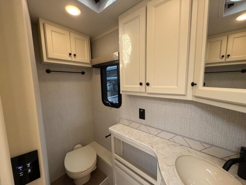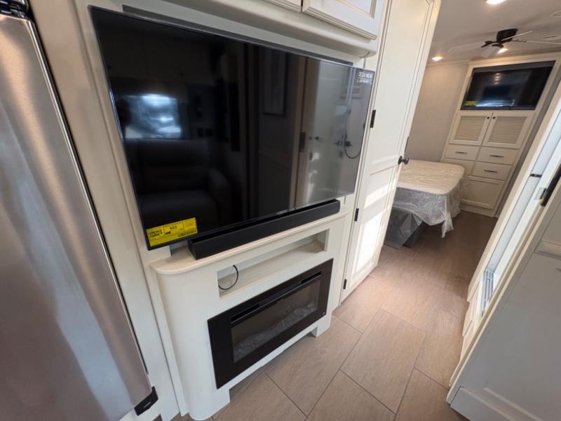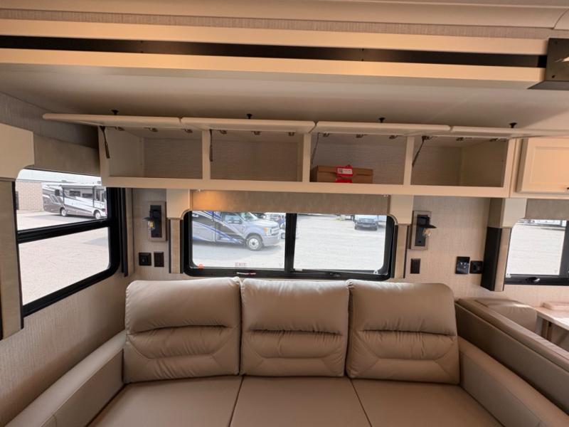 You will feel right at home in this motorhome! It features a rear private bedroom with a king bed slide that has an egress window behind it, a wardrobe with drawers, and an optional combo washer/dryer. Just outside the bedroom is the split-style bath where one person can freshen up in the shower while another uses the private toilet and sink. After you have prepared a delicious meal with the three burner liquid propane cooktop, you can enjoy it at the booth dinette-sleeper. The dinette can become your guests' sleeping space at night, along with the flip and fold sofa bed or the optional drop-down front bunk! You can also choose the optional theater seating if you don't need the additional sleeping space. This model also includes a living area TV with an optional fireplace below, a 20 cu. ft. stainless steel residential refrigerator with a top freezer, and many more interior comforts!