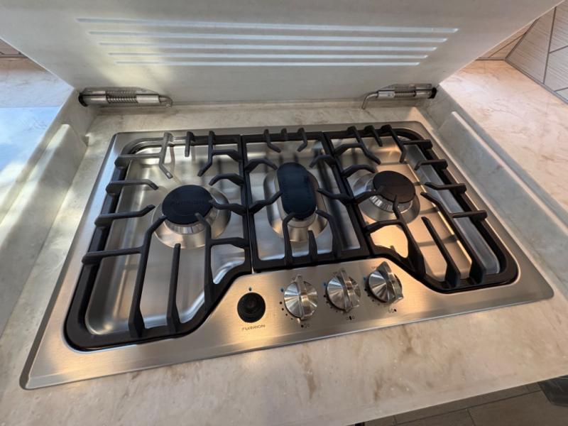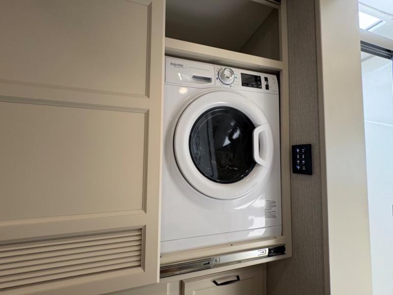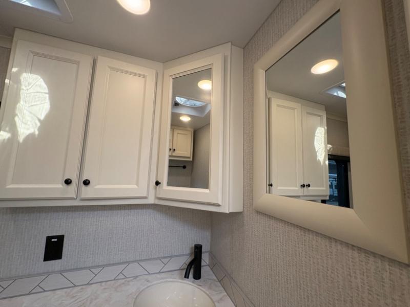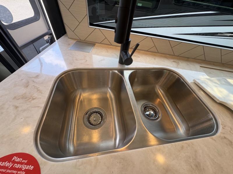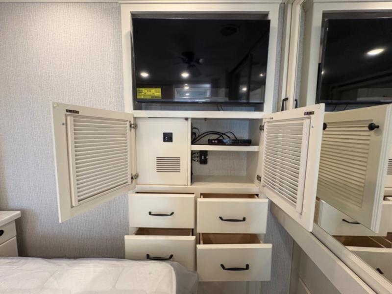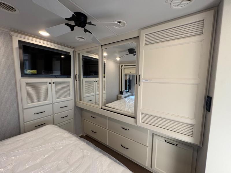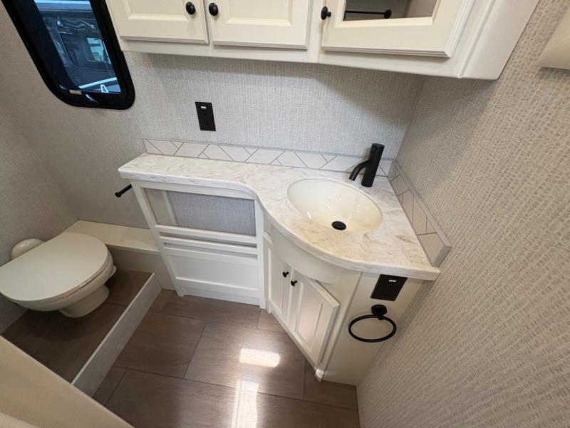 You will feel right at home in this motorhome! It features a rear private bedroom with a king bed slide that has an egress window behind it, a wardrobe with drawers, and an optional combo washer/dryer. Just outside the bedroom is the split-style bath where one person can freshen up in the shower while another uses the private toilet and sink. After you have prepared a delicious meal with the three burner liquid propane cooktop, you can enjoy it at the booth dinette-sleeper. The dinette can become your guests' sleeping space at night, along with the flip and fold sofa bed or the optional drop-down front bunk! You can also choose the optional theater seating if you don't need the additional sleeping space. This model also includes a living area TV with an optional fireplace below, a 20 cu. ft. stainless steel residential refrigerator with a top freezer, and many more interior comforts!
