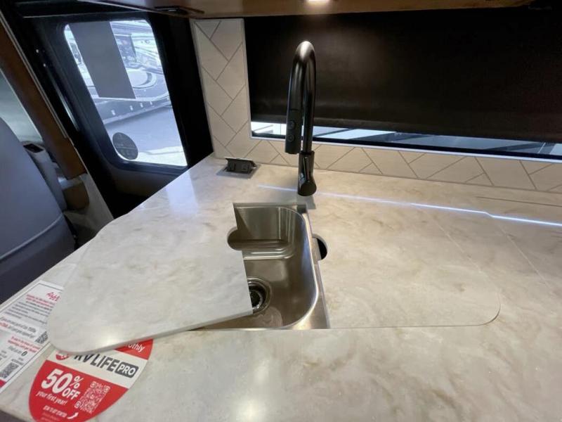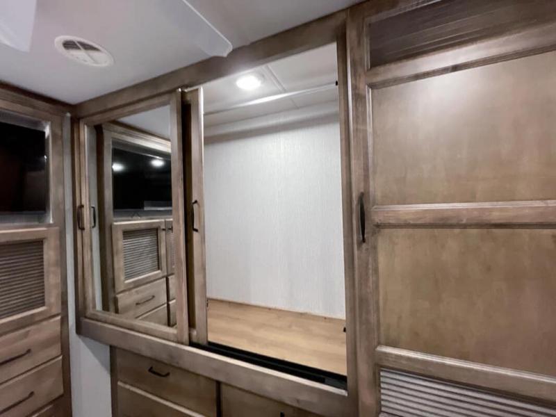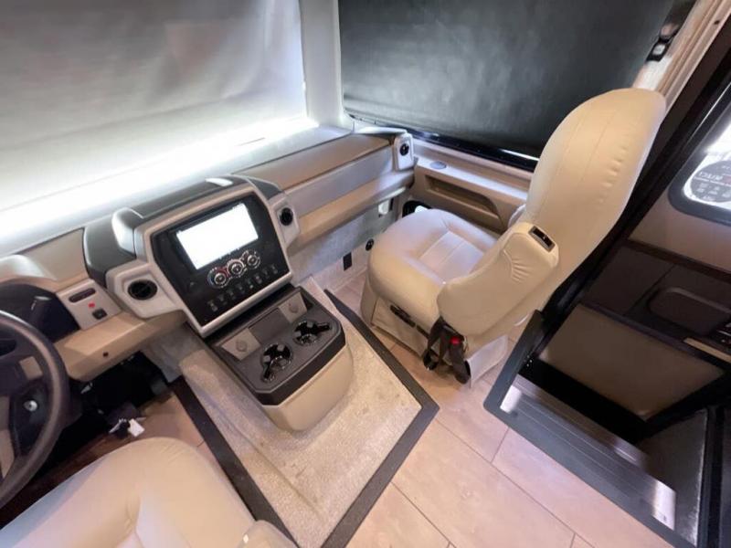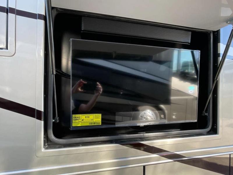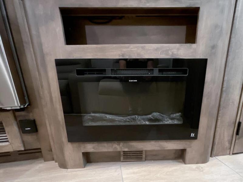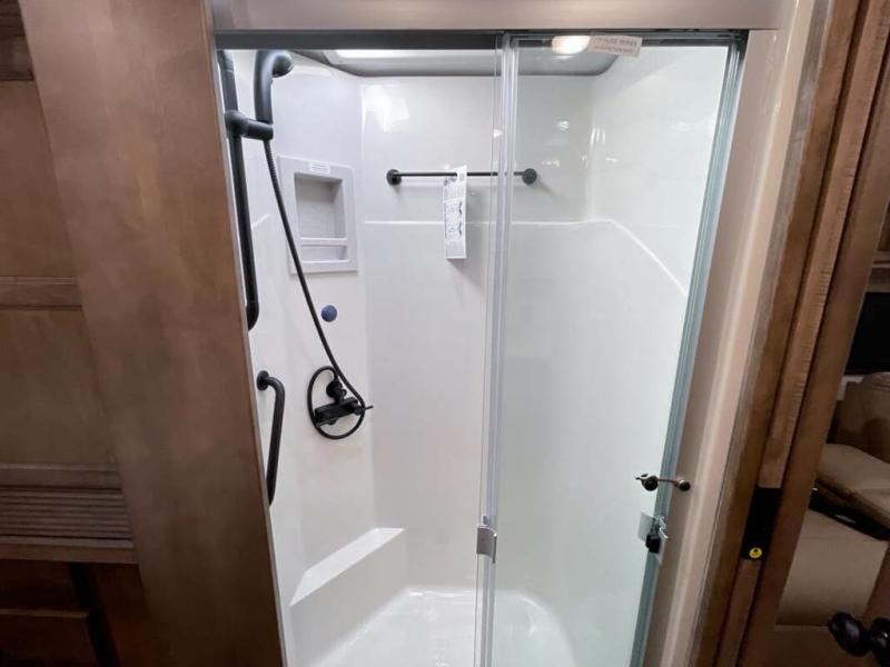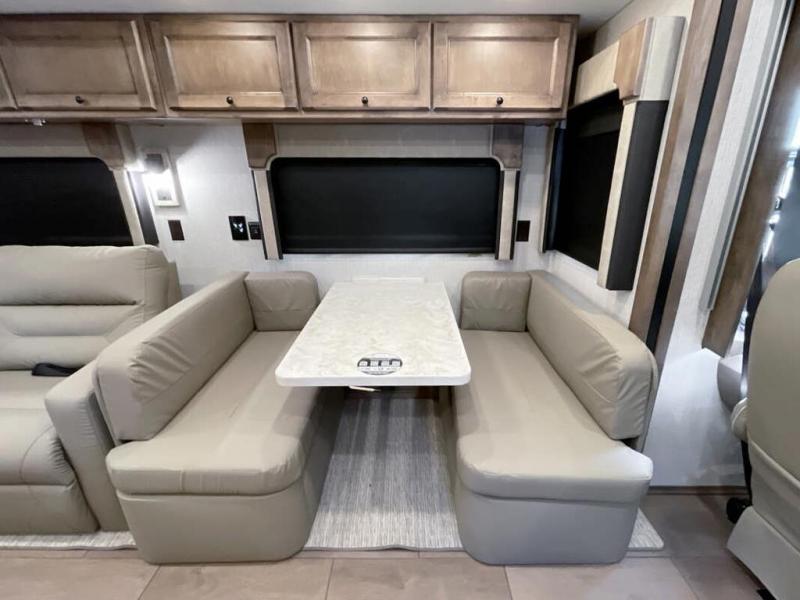 You will feel right at home in this motorhome! It features a rear private bedroom with a king bed slide that has an egress window behind it, a wardrobe with drawers, and an optional combo washer/dryer. Just outside the bedroom is the split-style bath where one person can freshen up in the shower while another uses the private toilet and sink. After you have prepared a delicious meal with the three burner liquid propane cooktop, you can enjoy it at the booth dinette-sleeper. The dinette can become your guests' sleeping space at night, along with the flip and fold sofa bed or the optional drop-down front bunk! You can also choose the optional theater seating if you don't need the additional sleeping space. This model also includes a living area TV with an optional fireplace below, a 20 cu. ft. stainless steel residential refrigerator with a top freezer, and many more interior comforts!