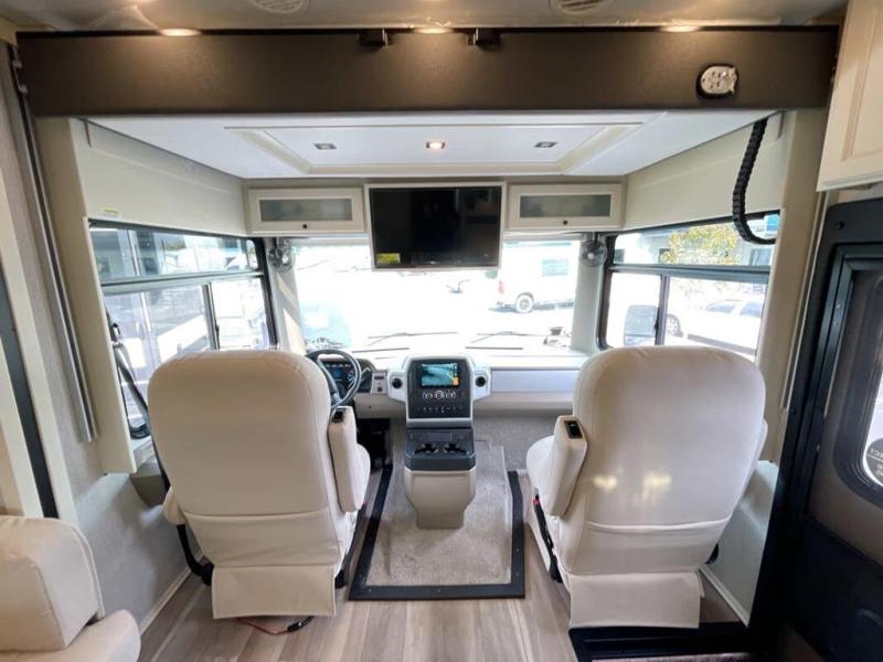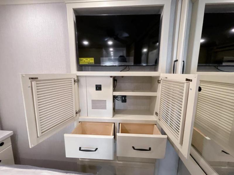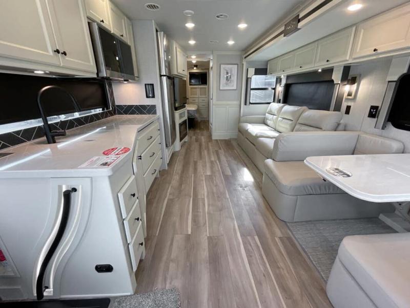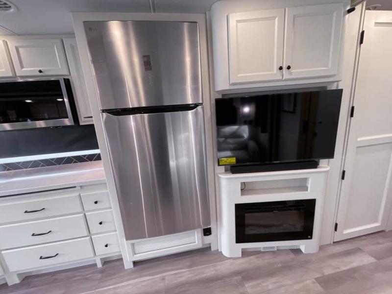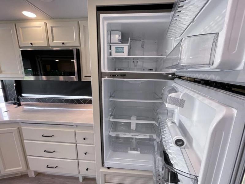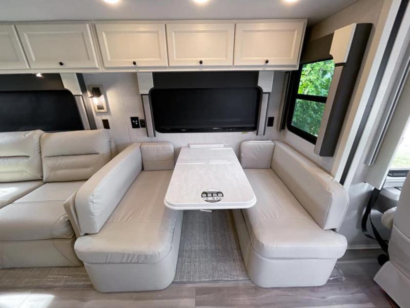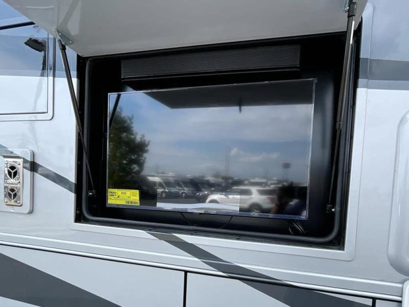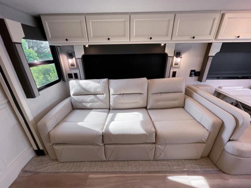 You will feel right at home in this motorhome! It features a rear private bedroom with a king bed slide that has an egress window behind it, a wardrobe with drawers, and an optional combo washer/dryer. Just outside the bedroom is the split-style bath where one person can freshen up in the shower while another uses the private toilet and sink. After you have prepared a delicious meal with the three burner liquid propane cooktop, you can enjoy it at the booth dinette-sleeper. The dinette can become your guests' sleeping space at night, along with the flip and fold sofa bed or the optional drop-down front bunk! You can also choose the optional theater seating if you don't need the additional sleeping space. This model also includes a living area TV with an optional fireplace below, a 20 cu. ft. stainless steel residential refrigerator with a top freezer, and many more interior comforts!
