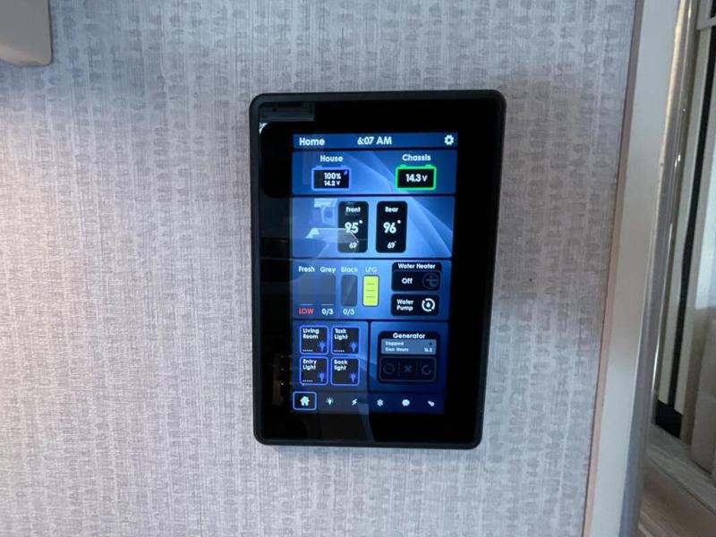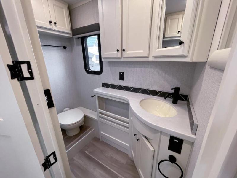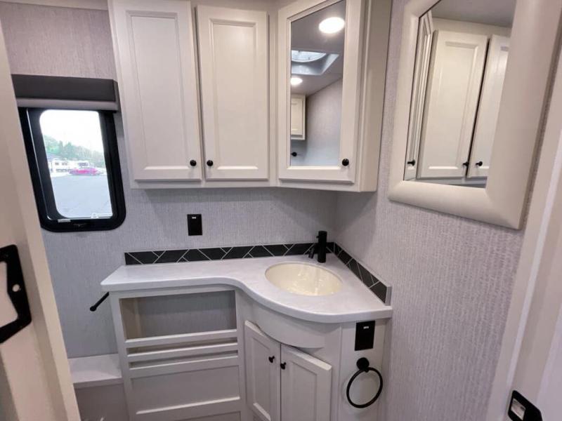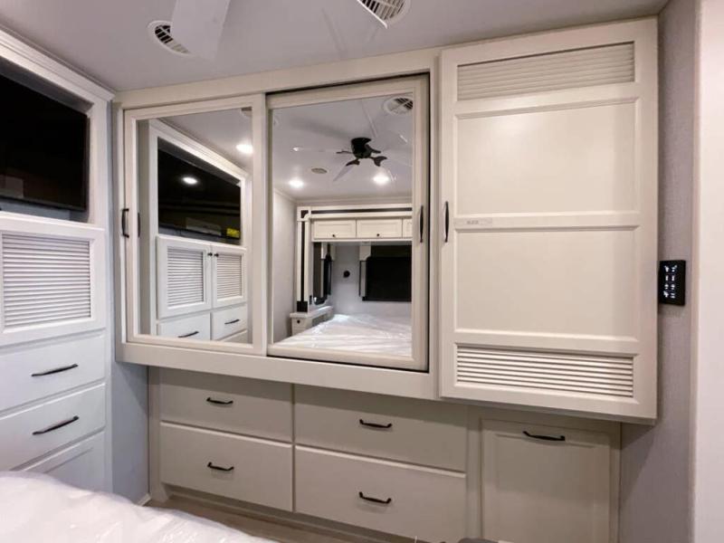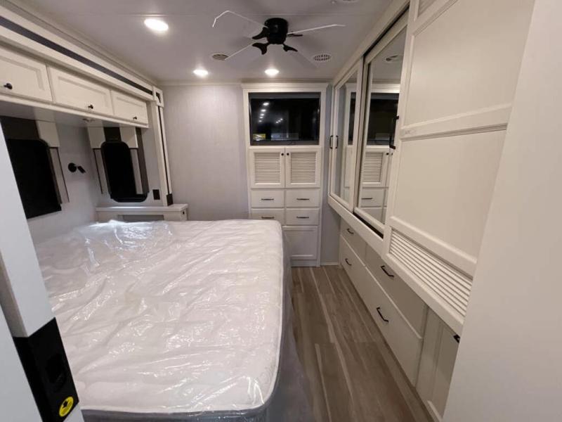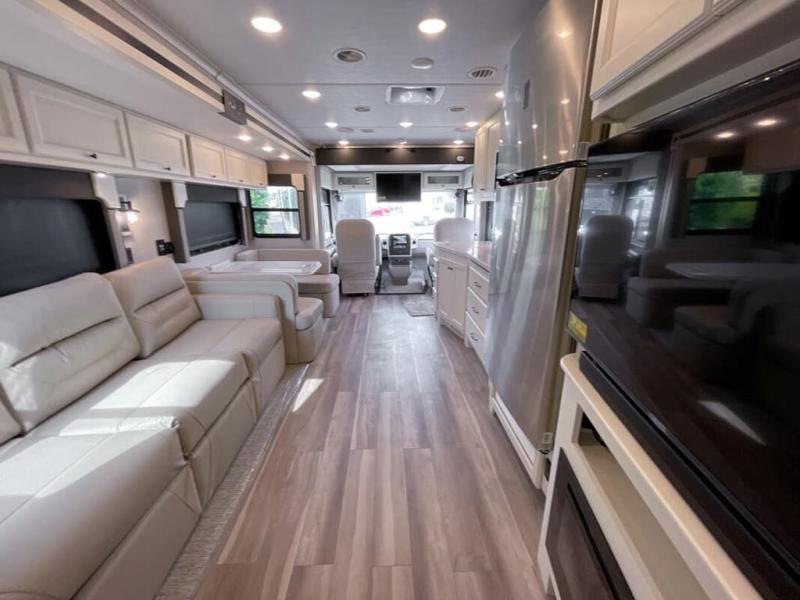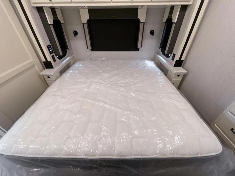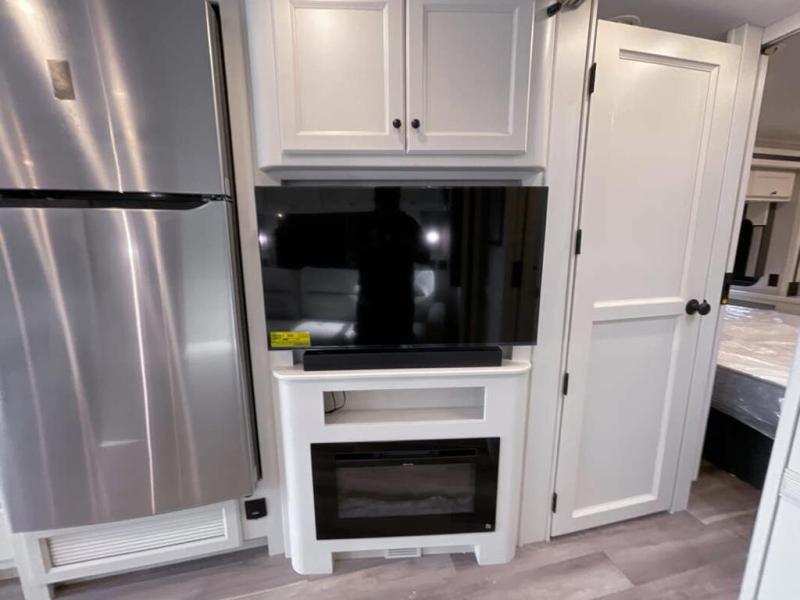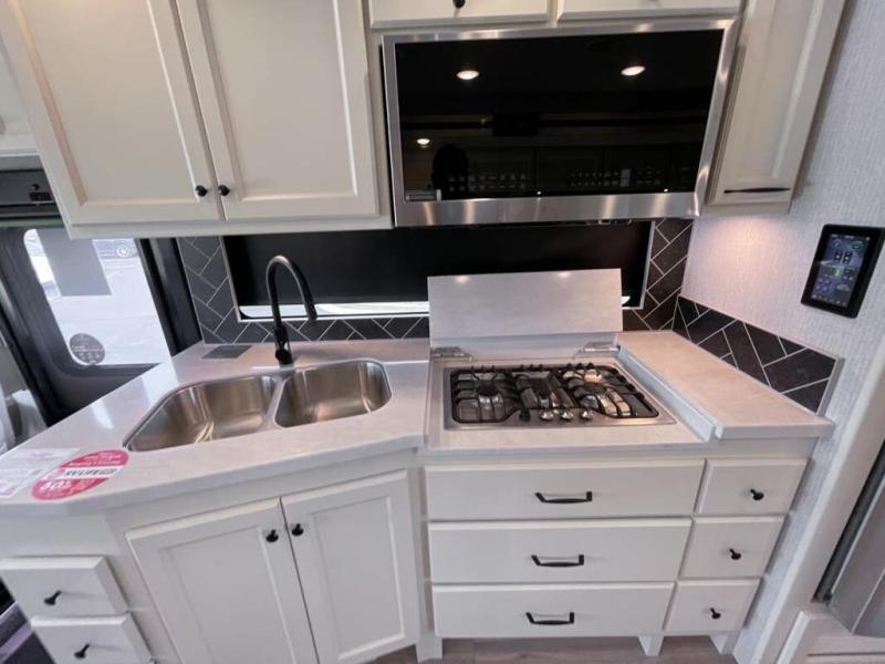 You will feel right at home in this motorhome! It features a rear private bedroom with a king bed slide that has an egress window behind it, a wardrobe with drawers, and an optional combo washer/dryer. Just outside the bedroom is the split-style bath where one person can freshen up in the shower while another uses the private toilet and sink. After you have prepared a delicious meal with the three burner liquid propane cooktop, you can enjoy it at the booth dinette-sleeper. The dinette can become your guests' sleeping space at night, along with the flip and fold sofa bed or the optional drop-down front bunk! You can also choose the optional theater seating if you don't need the additional sleeping space. This model also includes a living area TV with an optional fireplace below, a 20 cu. ft. stainless steel residential refrigerator with a top freezer, and many more interior comforts!