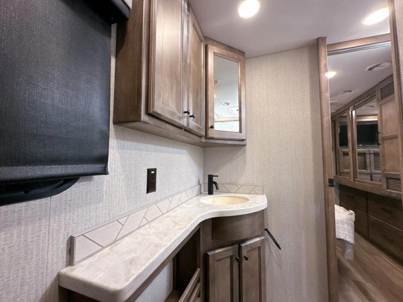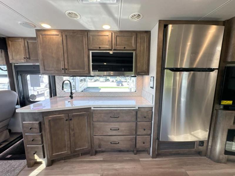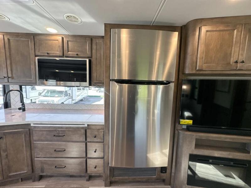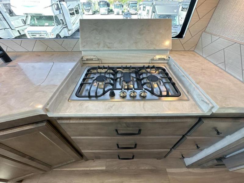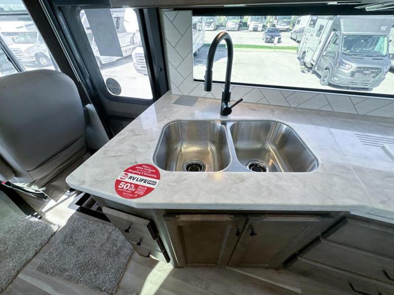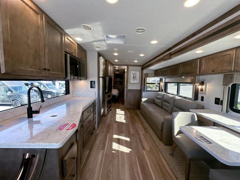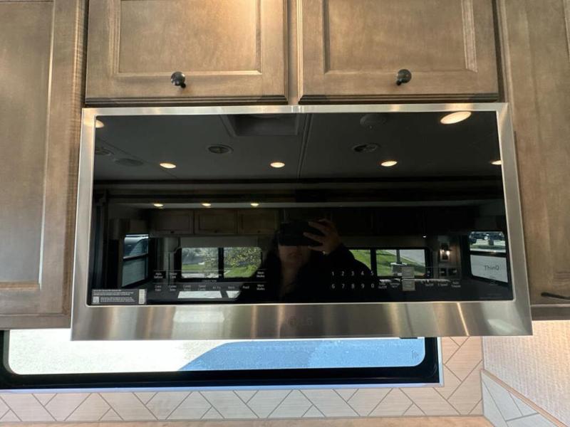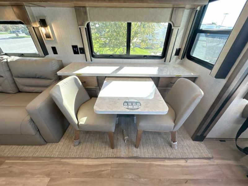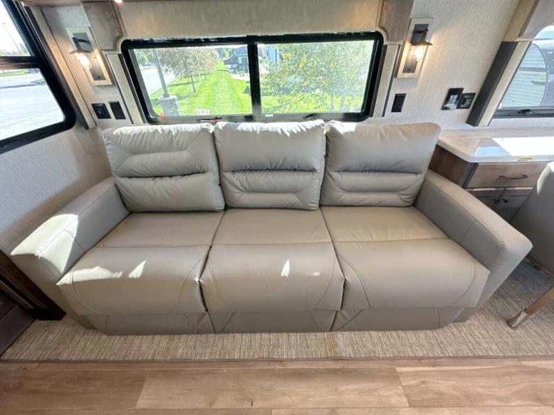 You will feel right at home in this motorhome! It features a rear private bedroom with a king bed slide that has an egress window behind it, a wardrobe with drawers, and an optional combo washer/dryer. Just outside the bedroom is the split-style bath where one person can freshen up in the shower while another uses the private toilet and sink. After you have prepared a delicious meal with the three burner liquid propane cooktop, you can enjoy it at the booth dinette-sleeper. The dinette can become your guests' sleeping space at night, along with the flip and fold sofa bed or the optional drop-down front bunk! You can also choose the optional theater seating if you don't need the additional sleeping space. This model also includes a living area TV with an optional fireplace below, a 20 cu. ft. stainless steel residential refrigerator with a top freezer, and many more interior comforts!