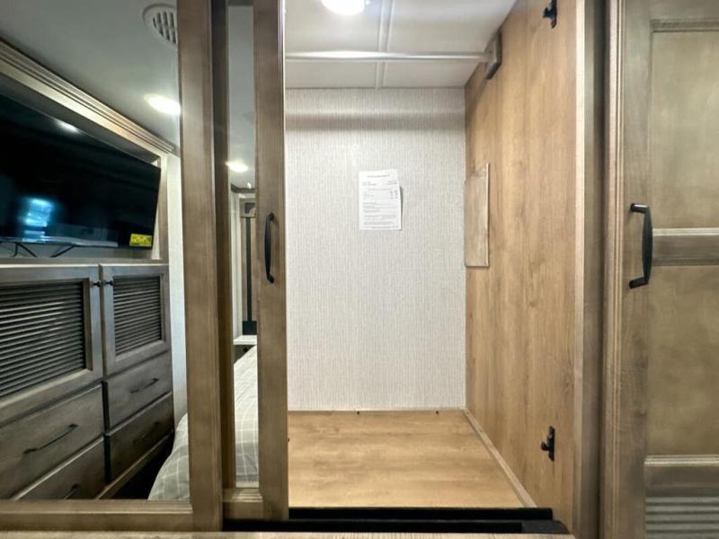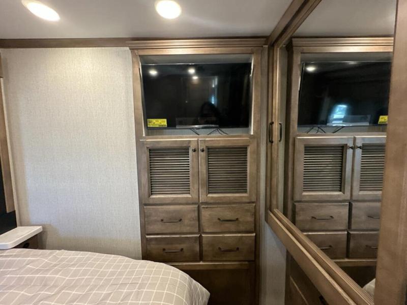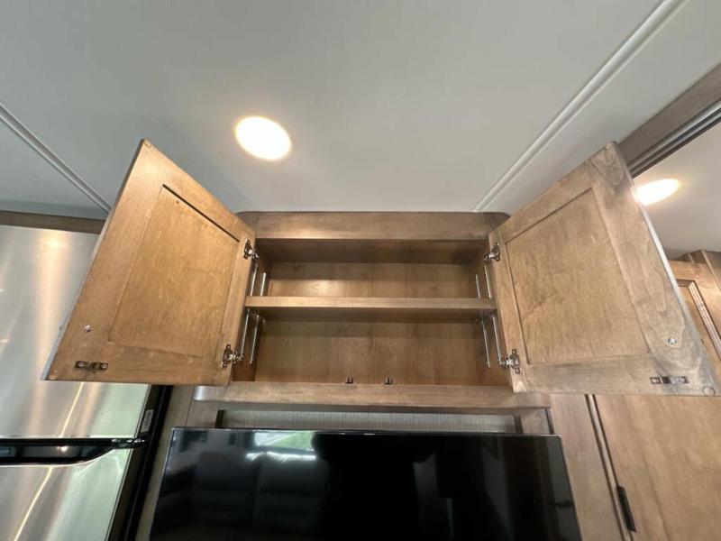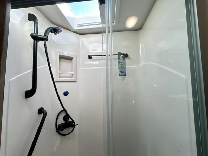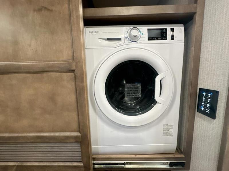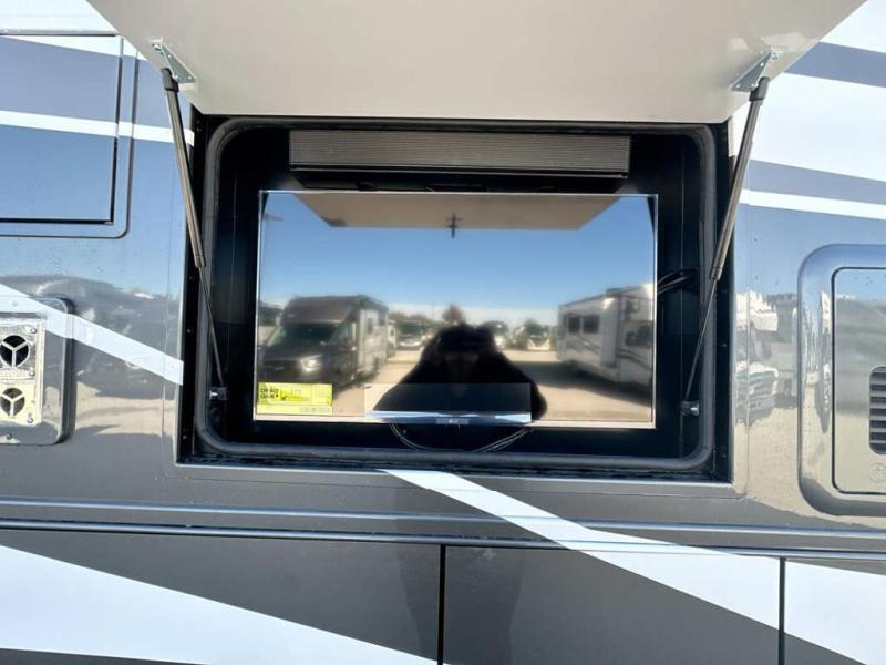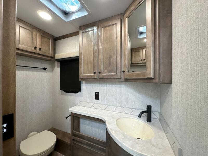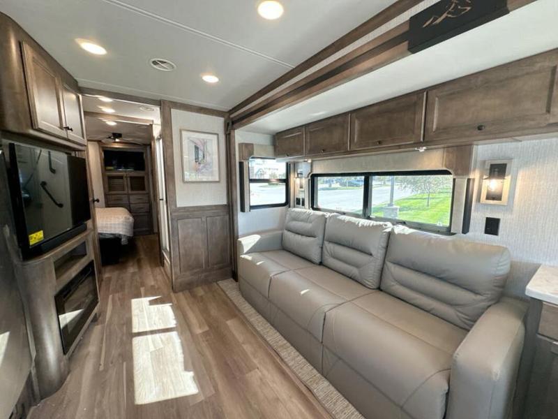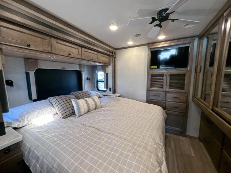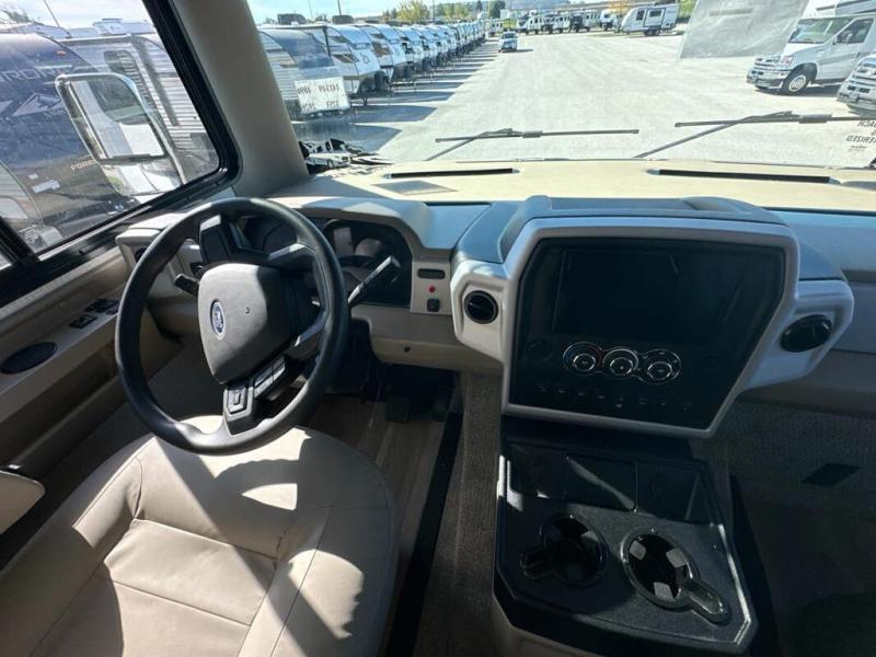 You will feel right at home in this motorhome! It features a rear private bedroom with a king bed slide that has an egress window behind it, a wardrobe with drawers, and an optional combo washer/dryer. Just outside the bedroom is the split-style bath where one person can freshen up in the shower while another uses the private toilet and sink. After you have prepared a delicious meal with the three burner liquid propane cooktop, you can enjoy it at the booth dinette-sleeper. The dinette can become your guests' sleeping space at night, along with the flip and fold sofa bed or the optional drop-down front bunk! You can also choose the optional theater seating if you don't need the additional sleeping space. This model also includes a living area TV with an optional fireplace below, a 20 cu. ft. stainless steel residential refrigerator with a top freezer, and many more interior comforts!