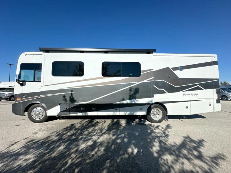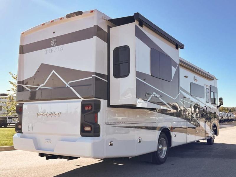Every one of these Tiffin Motorhomes Open Road Allegro Class A gas motorhomes are ready to go when ever you are! A Ford 7.3L V8 engine powers these units and a durable, yet lightweight, tubular aluminum wall skeleton holds them together. They are beautifully designed with handcrafted cabinetry and a panoramic kitchen galley window for breathtaking views. A couple electronic features you will appreciate include an exterior TV with a soundbar and a Spyder multiplex system, plus there are two 13.5k BUT AC units to keep you cool on those hot summer days. The color back-up camera and side-view cameras will make parking easier than ever, and you'll appreciate hydraulic leveling jacks with a control panel for hassle-free set up. You'll love the new decor options, along with the new Generation 12 exterior color paint options, plus a 10" detachable touchscreen with a media center!