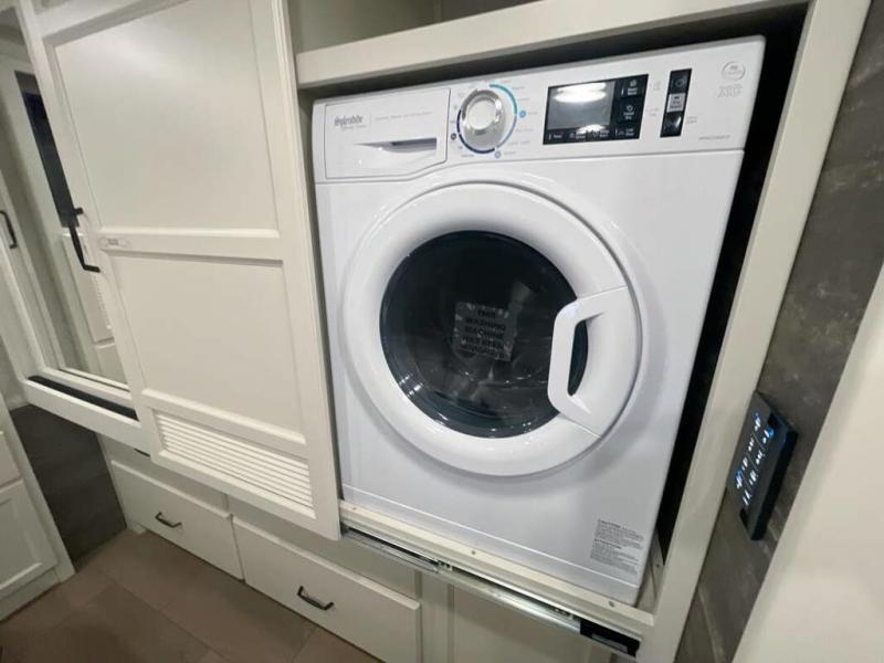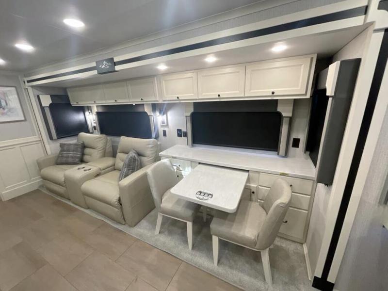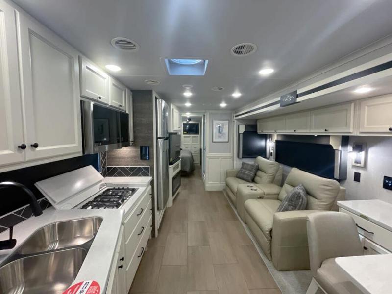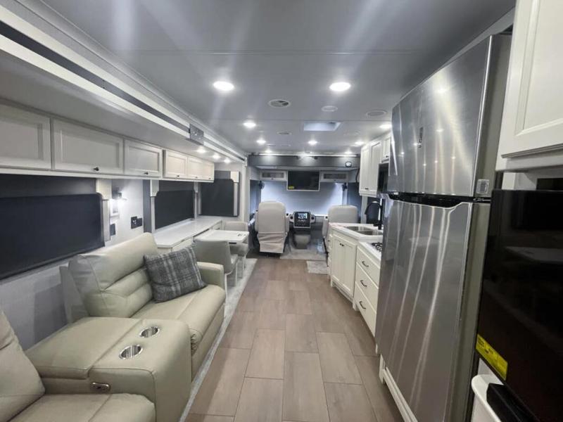 You will feel right at home in this motorhome! It features a rear private bedroom with a king bed slide that has an egress window behind it, a wardrobe with drawers, and an optional combo washer/dryer. Just outside the bedroom is the split-style bath where one person can freshen up in the shower while another uses the private toilet and sink. After you have prepared a delicious meal with the three burner liquid propane cooktop, you can enjoy it at the booth dinette-sleeper. The dinette can become your guests' sleeping space at night, along with the flip and fold sofa bed or the optional drop-down front bunk! You can also choose the optional theater seating if you don't need the additional sleeping space. This model also includes a living area TV with an optional fireplace below, a 20 cu. ft. stainless steel residential refrigerator with a top freezer, and many more interior comforts!