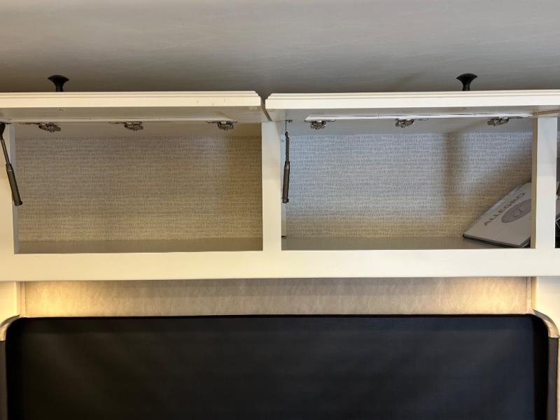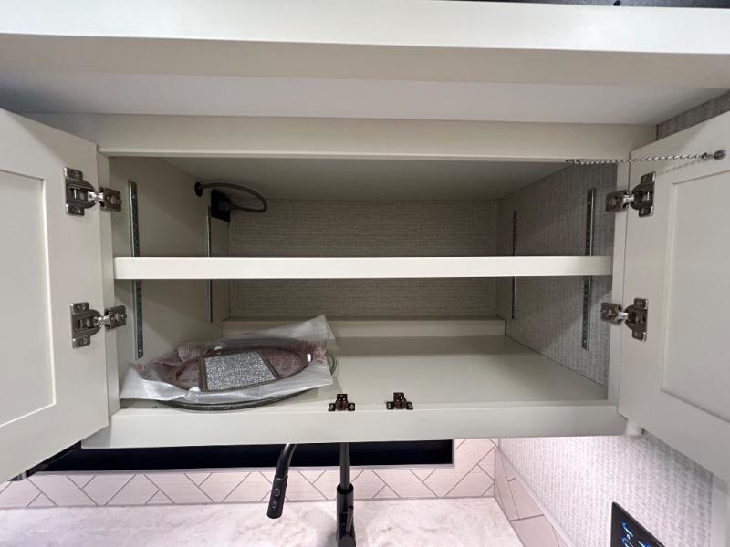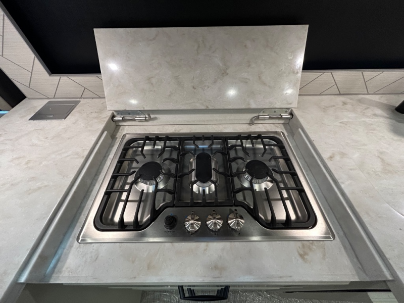 You’ll love cooking in the Allegro’s gourmet kitchen, featuring solid-surface countertops, a residential refrigerator, convection microwave, three-burner cooktop, and ample pantry space. Whether you're whipping up a quick snack or hosting a campground cookout, you’ll have everything you need.
