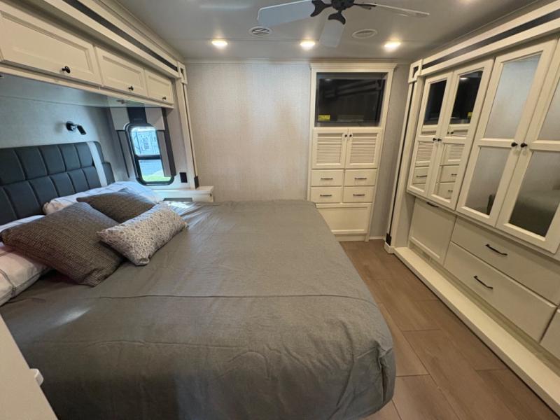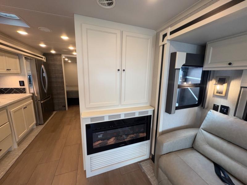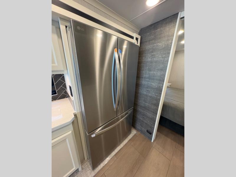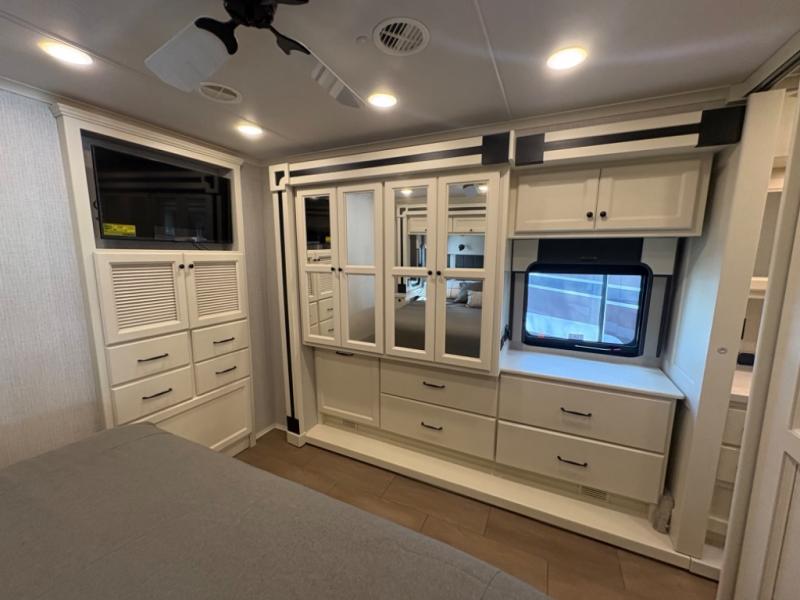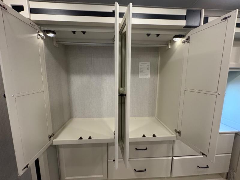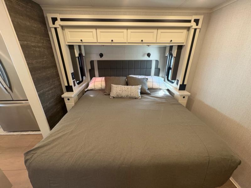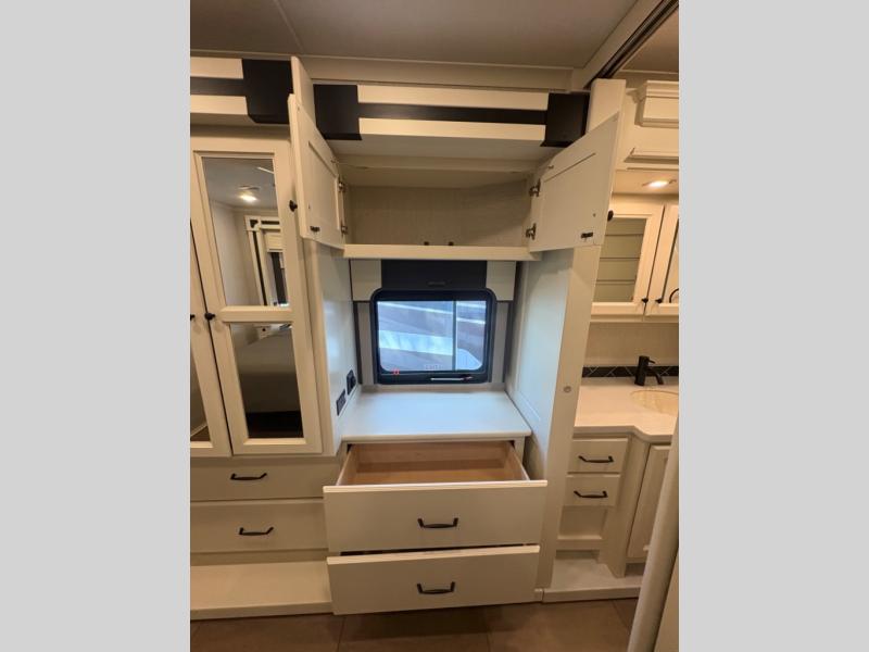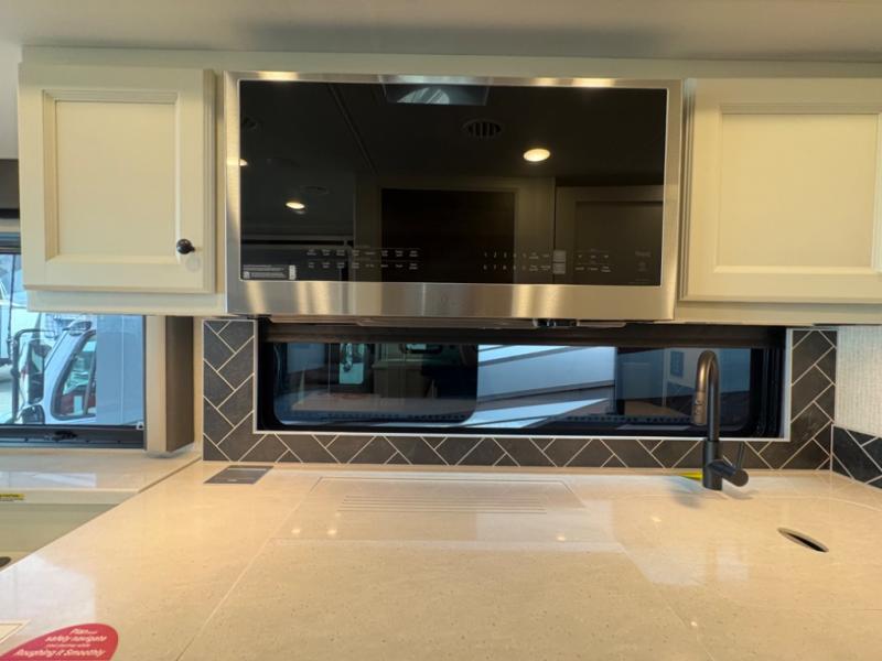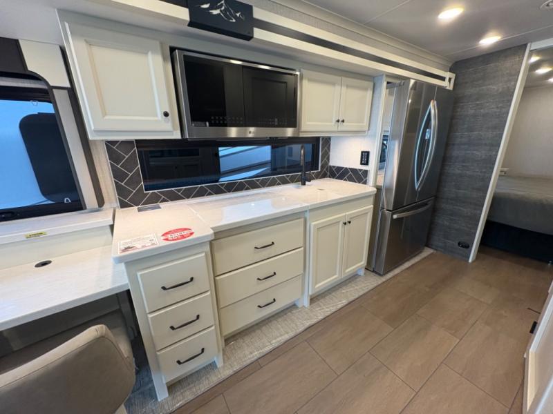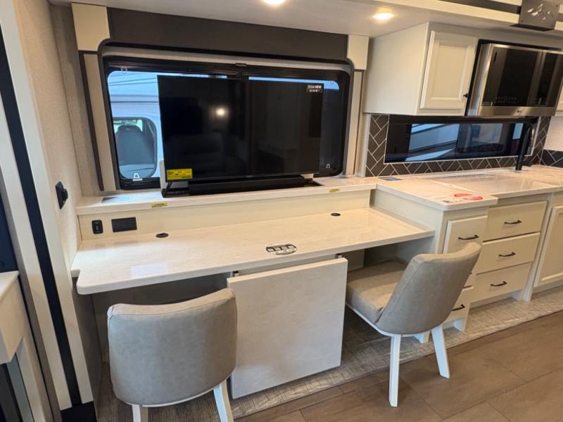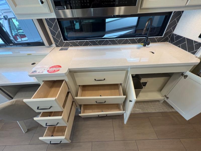 There are many standard luxurious features you will love about this motorhome! It also has many optional features you can add like the optional drop-down front bunk, the optional super sofa and the optional theater seating. The queen bed slide in the rear private bedroom offers a comfortable place to sleep, as well as the flip and fold sofa bed in the living area. You will love the dinette bar with a lift TV, a flip-up countertop, and two chairs that will make this the perfect place to get some work done while you're on the road. The kitchen includes everything you need to prepare meals each day, including a 1.7 cu. ft. smart convection microwave with an air fryer, a three burner liquid propane cooktop, and a 23 cu. ft. stainless steel residential refrigerator with French doors and a bottom freezer. Head to the rear master bedroom with a queen bed slide out, a large wardrobe, a cabinet with a TV and drawers below, plus a private entrance into the dual entry bath!