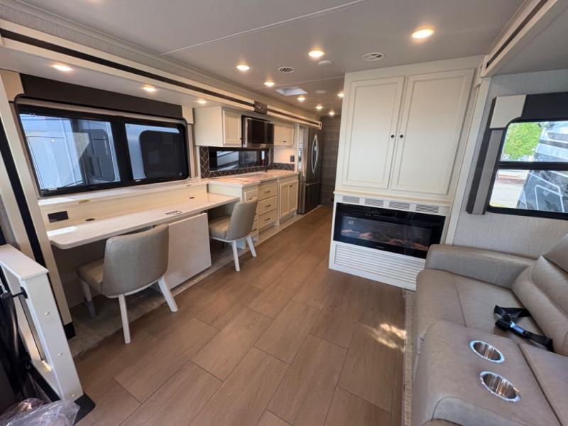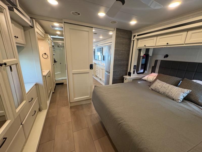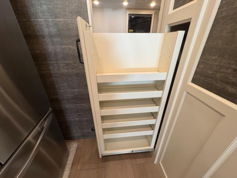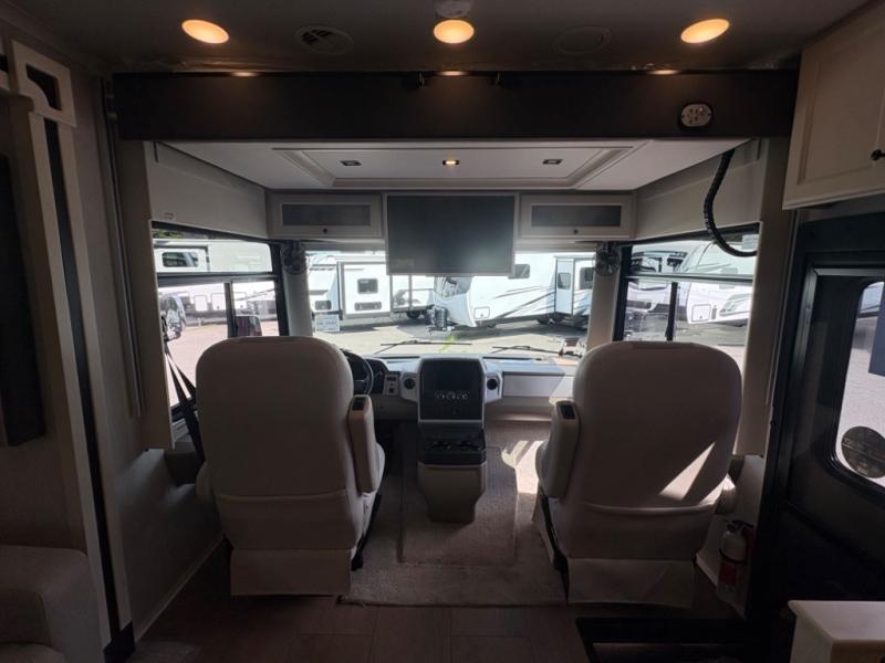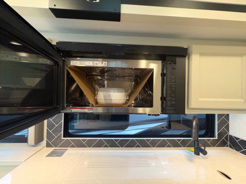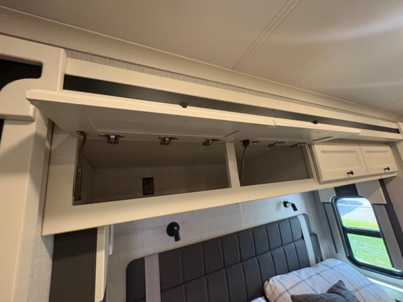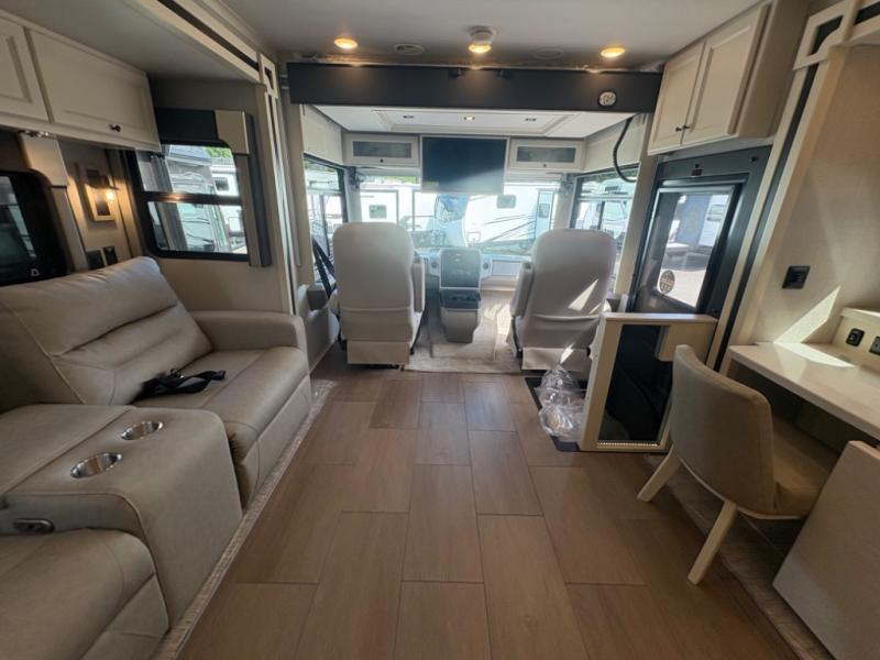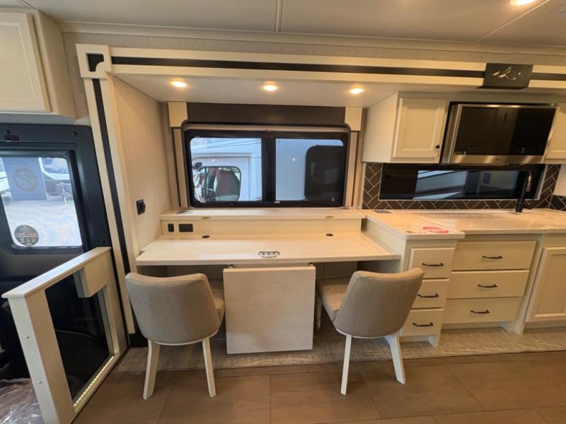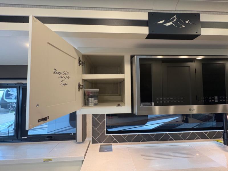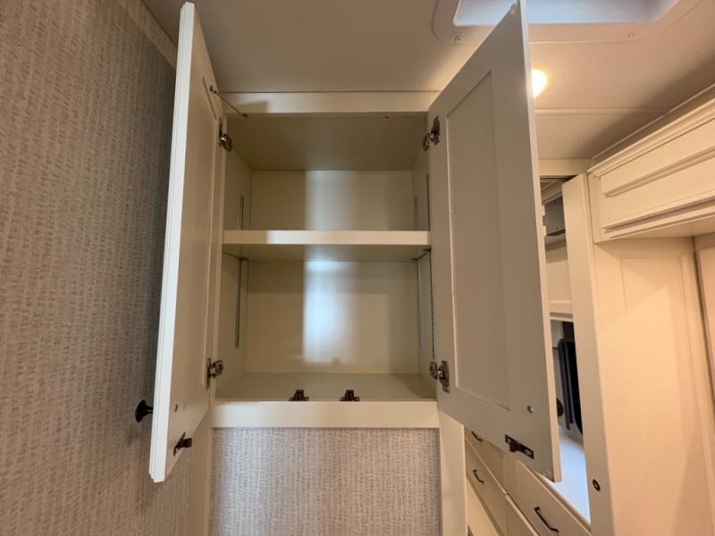 There are many standard luxurious features you will love about this motorhome! It also has many optional features you can add like the optional drop-down front bunk, the optional super sofa and the optional theater seating. The queen bed slide in the rear private bedroom offers a comfortable place to sleep, as well as the flip and fold sofa bed in the living area. You will love the dinette bar with a lift TV, a flip-up countertop, and two chairs that will make this the perfect place to get some work done while you're on the road. The kitchen includes everything you need to prepare meals each day, including a 1.7 cu. ft. smart convection microwave with an air fryer, a three burner liquid propane cooktop, and a 23 cu. ft. stainless steel residential refrigerator with French doors and a bottom freezer. Head to the rear master bedroom with a queen bed slide out, a large wardrobe, a cabinet with a TV and drawers below, plus a private entrance into the dual entry bath!
