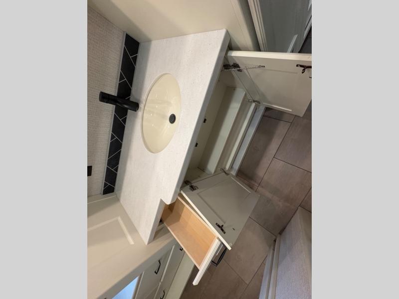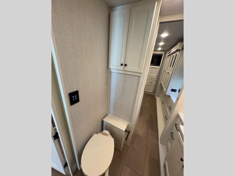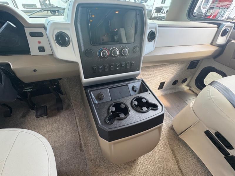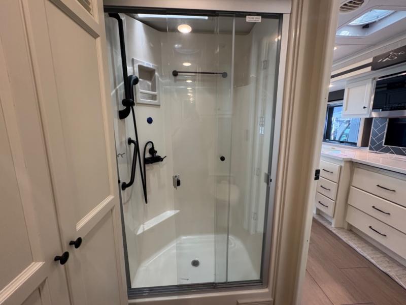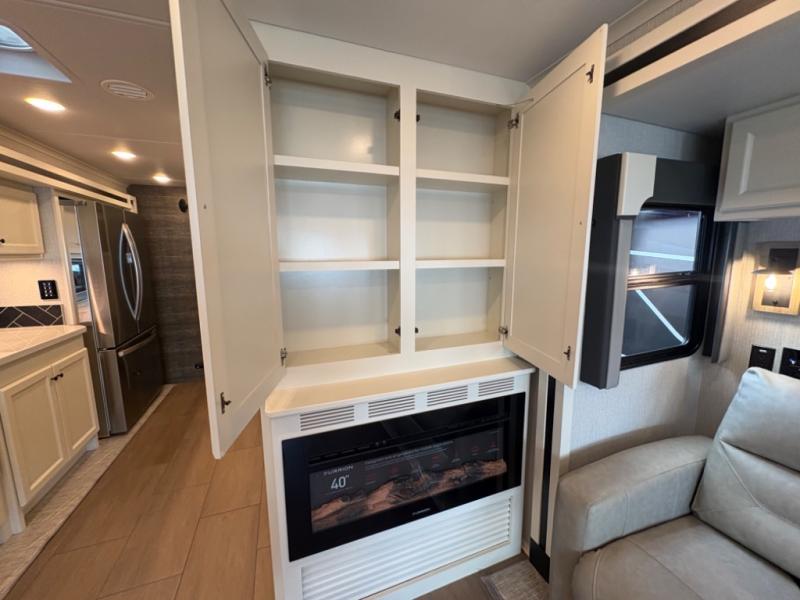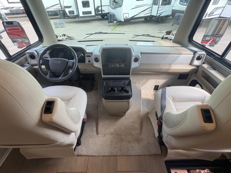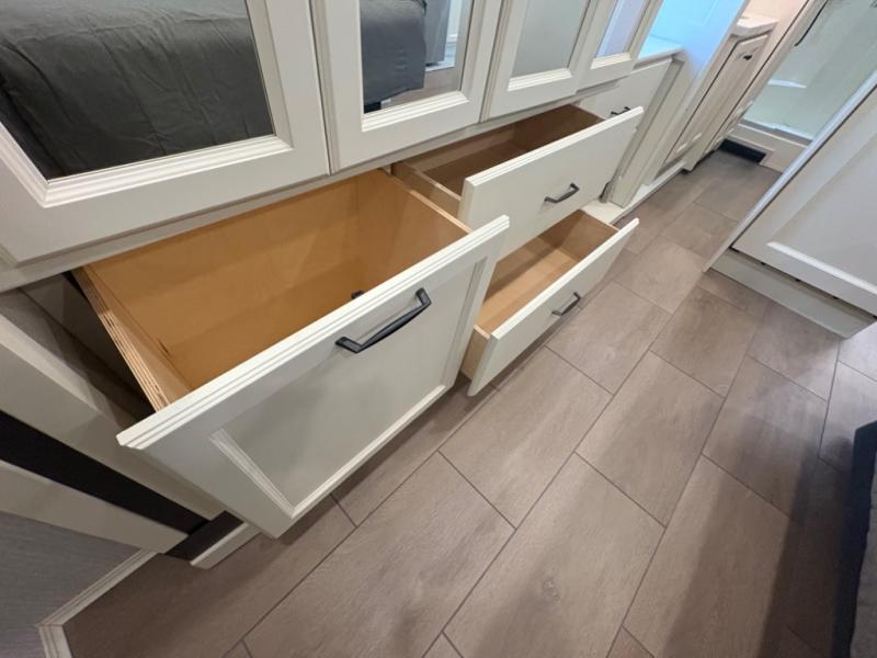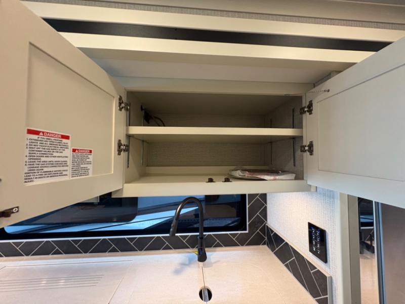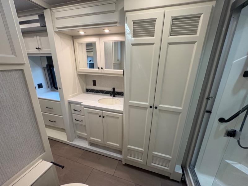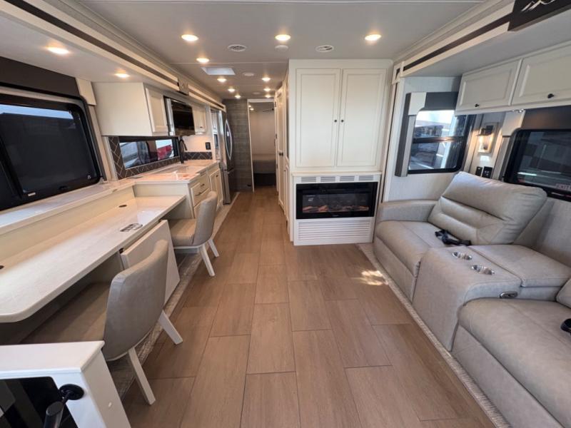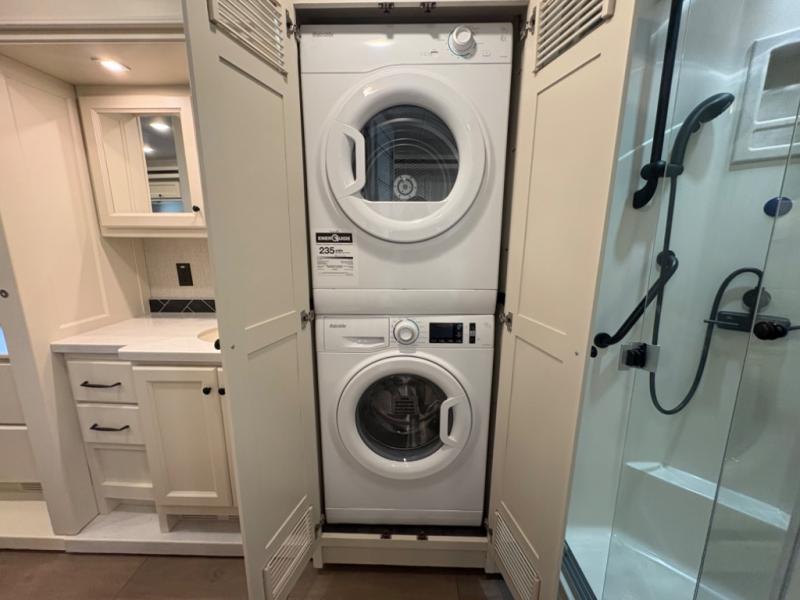 There are many standard luxurious features you will love about this motorhome! It also has many optional features you can add like the optional drop-down front bunk, the optional super sofa and the optional theater seating. The queen bed slide in the rear private bedroom offers a comfortable place to sleep, as well as the flip and fold sofa bed in the living area. You will love the dinette bar with a lift TV, a flip-up countertop, and two chairs that will make this the perfect place to get some work done while you're on the road. The kitchen includes everything you need to prepare meals each day, including a 1.7 cu. ft. smart convection microwave with an air fryer, a three burner liquid propane cooktop, and a 23 cu. ft. stainless steel residential refrigerator with French doors and a bottom freezer. Head to the rear master bedroom with a queen bed slide out, a large wardrobe, a cabinet with a TV and drawers below, plus a private entrance into the dual entry bath!