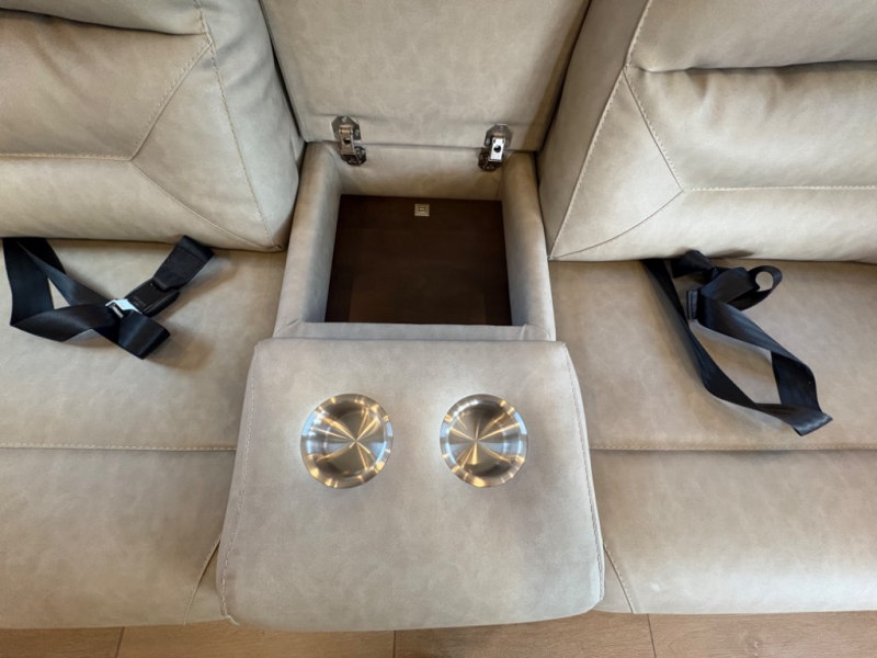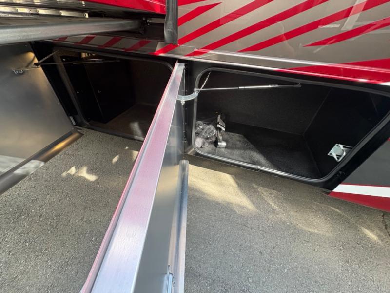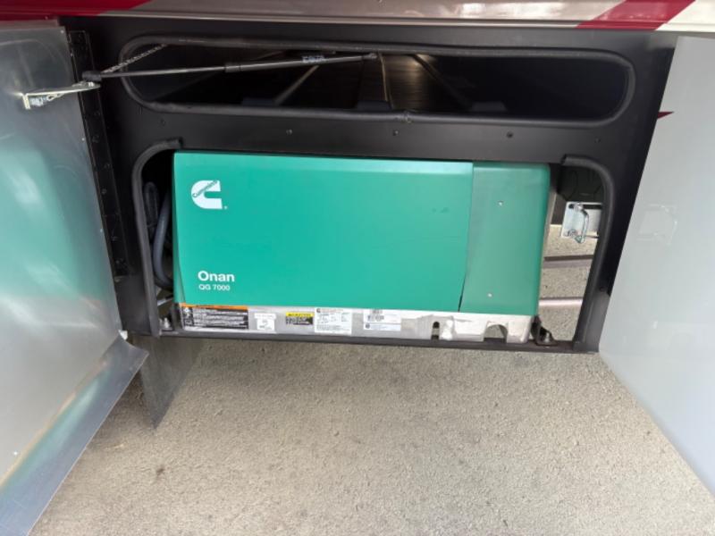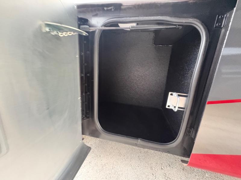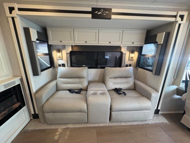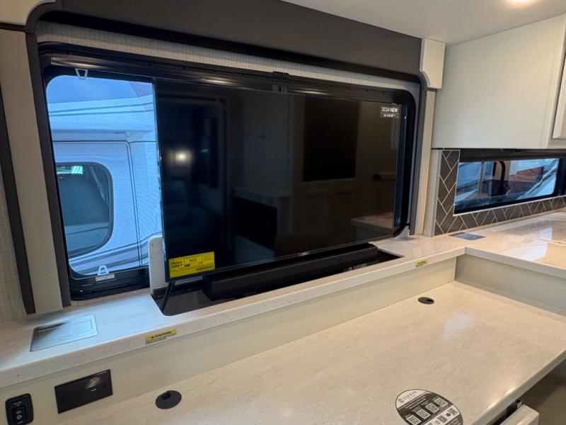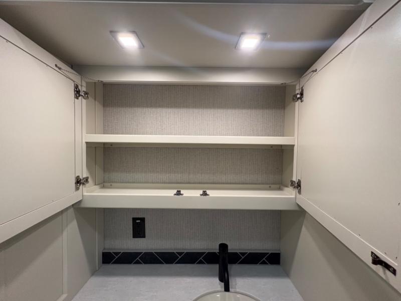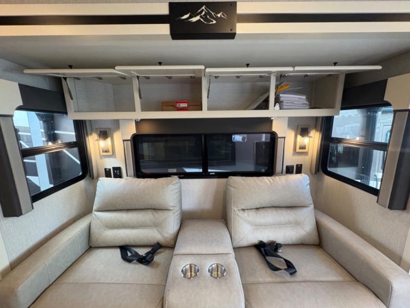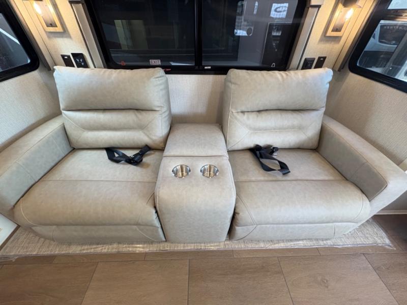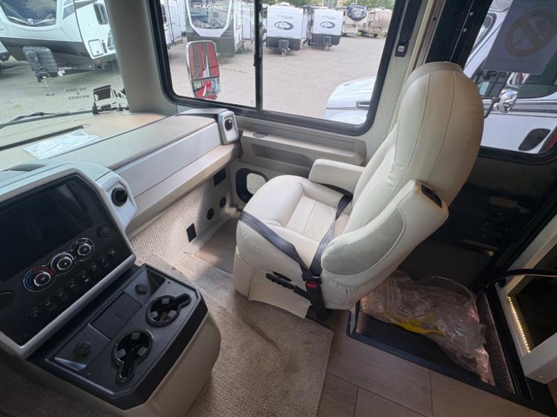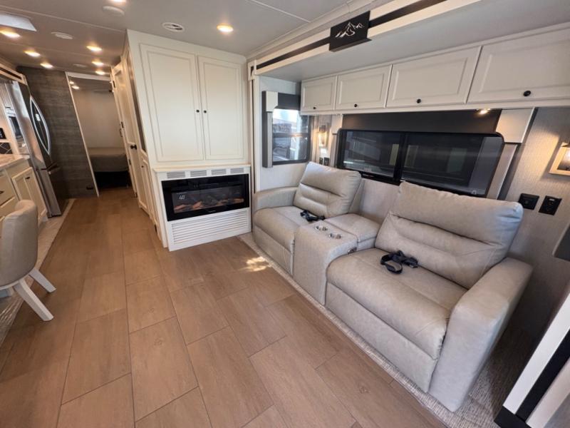 There are many standard luxurious features you will love about this motorhome! It also has many optional features you can add like the optional drop-down front bunk, the optional super sofa and the optional theater seating. The queen bed slide in the rear private bedroom offers a comfortable place to sleep, as well as the flip and fold sofa bed in the living area. You will love the dinette bar with a lift TV, a flip-up countertop, and two chairs that will make this the perfect place to get some work done while you're on the road. The kitchen includes everything you need to prepare meals each day, including a 1.7 cu. ft. smart convection microwave with an air fryer, a three burner liquid propane cooktop, and a 23 cu. ft. stainless steel residential refrigerator with French doors and a bottom freezer. Head to the rear master bedroom with a queen bed slide out, a large wardrobe, a cabinet with a TV and drawers below, plus a private entrance into the dual entry bath!