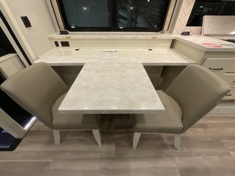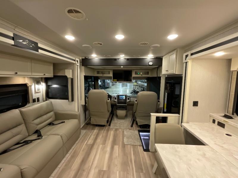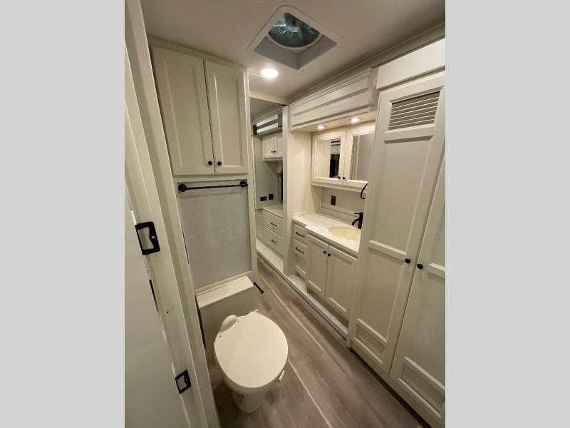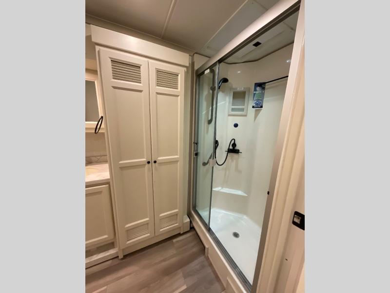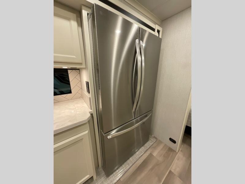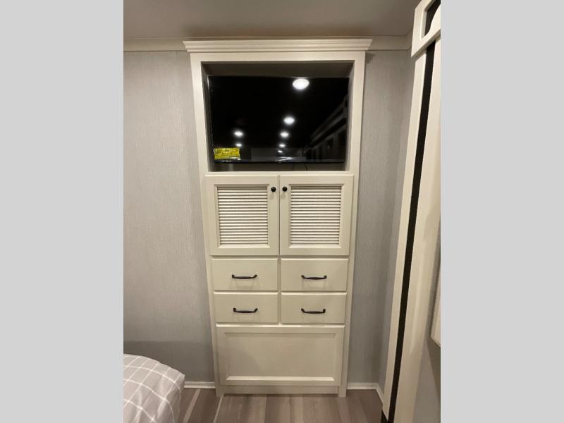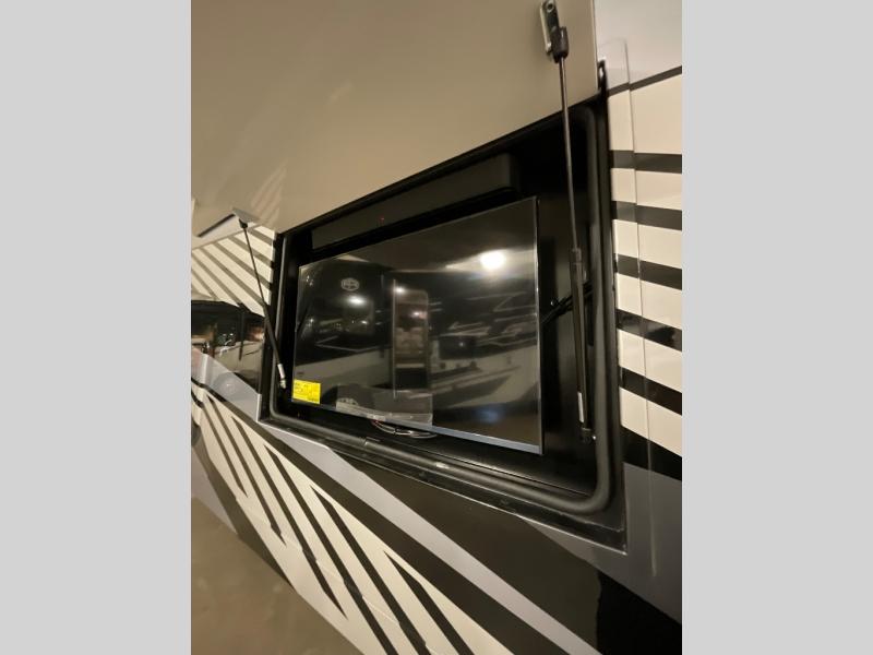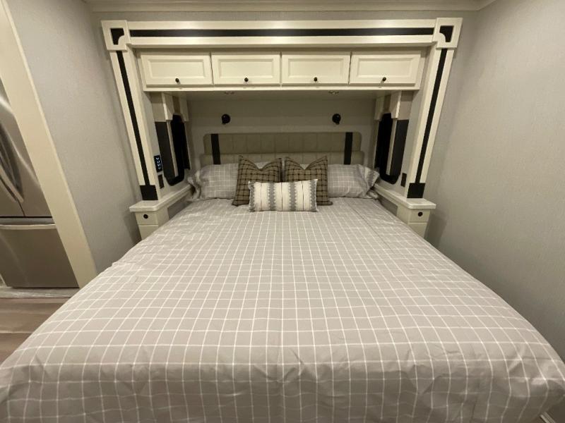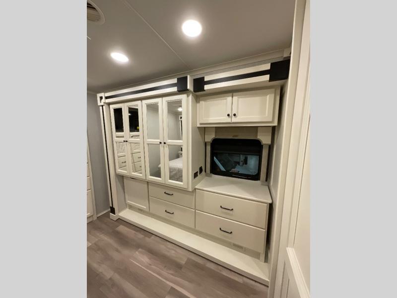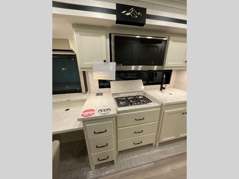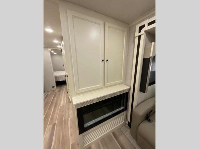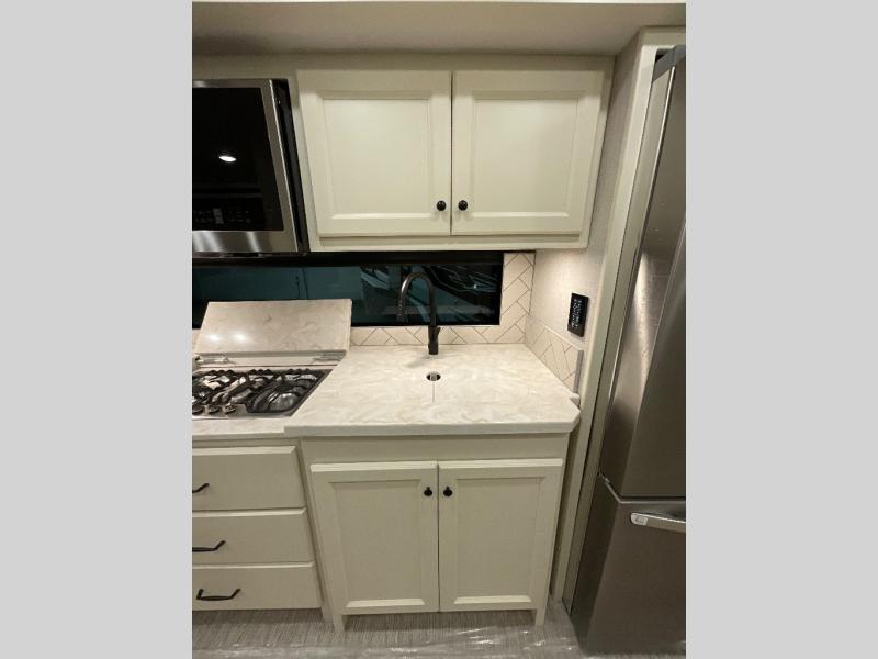 There are many standard luxurious features you will love about this motorhome! It also has many optional features you can add like the optional drop-down front bunk, the optional super sofa and the optional theater seating. The queen bed slide in the rear private bedroom offers a comfortable place to sleep, as well as the flip and fold sofa bed in the living area. You will love the dinette bar with a lift TV, a flip-up countertop, and two chairs that will make this the perfect place to get some work done while you're on the road. The kitchen includes everything you need to prepare meals each day, including a 1.7 cu. ft. smart convection microwave with an air fryer, a three burner liquid propane cooktop, and a 23 cu. ft. stainless steel residential refrigerator with French doors and a bottom freezer. Head to the rear master bedroom with a queen bed slide out, a large wardrobe, a cabinet with a TV and drawers below, plus a private entrance into the dual entry bath!