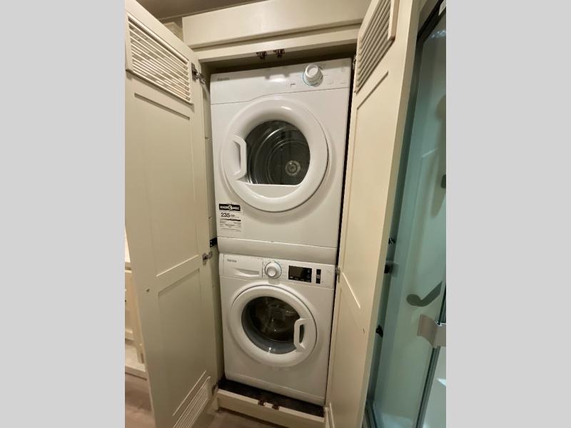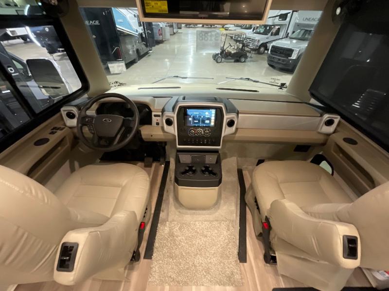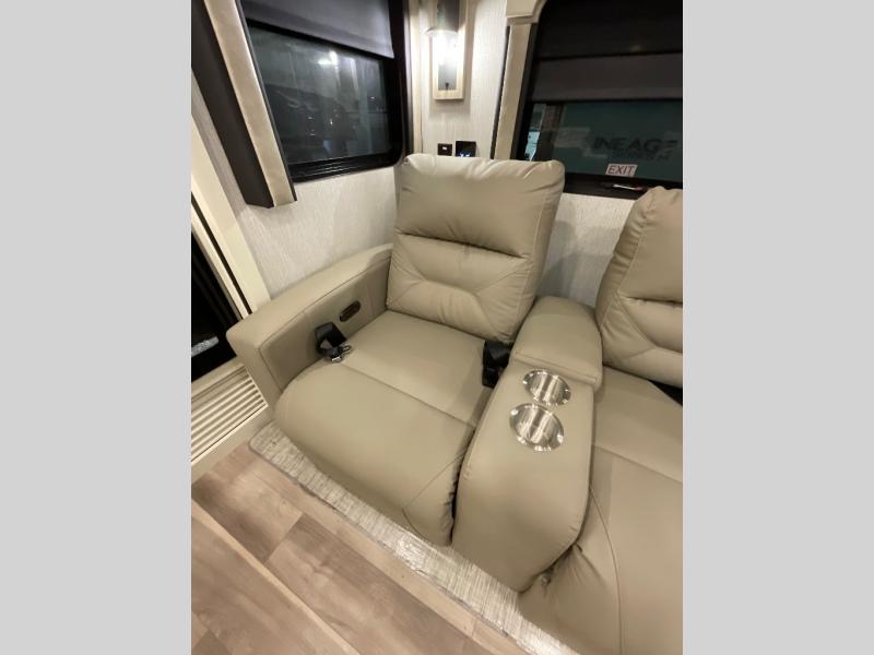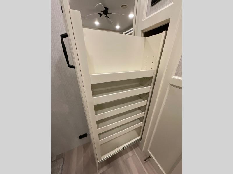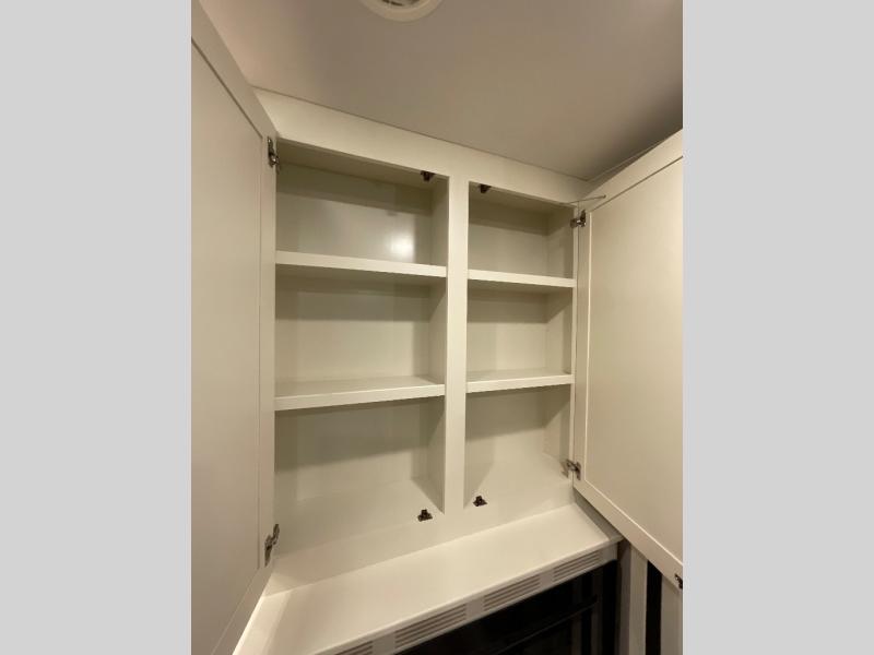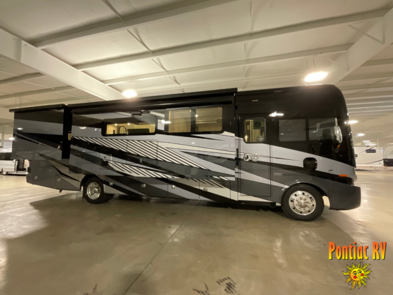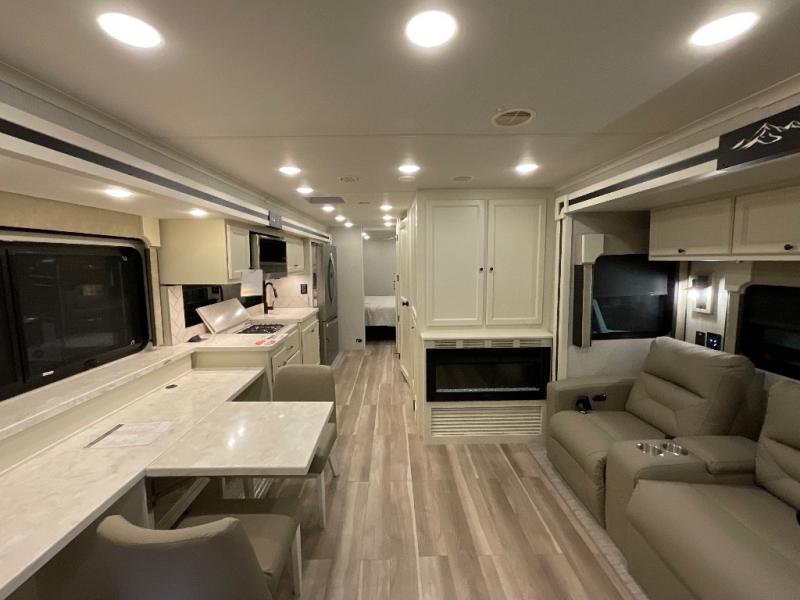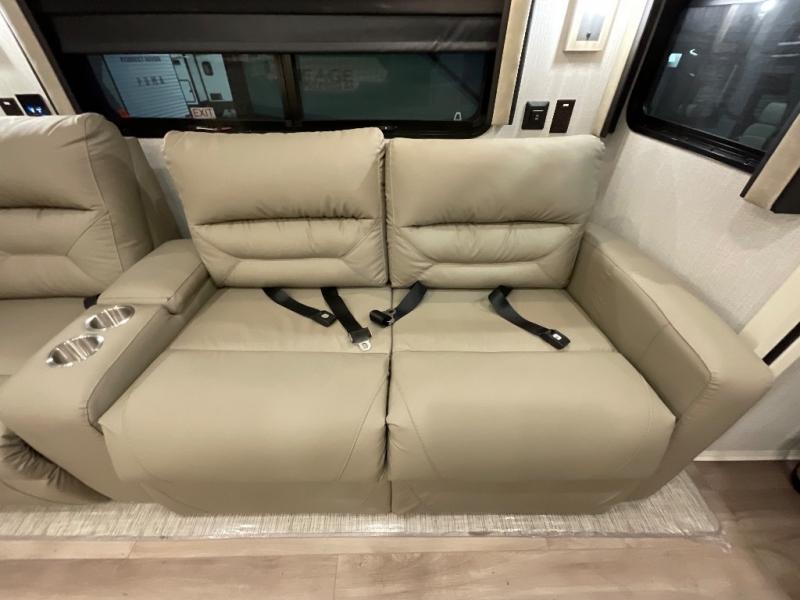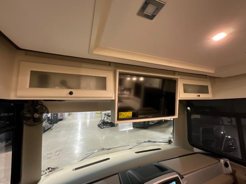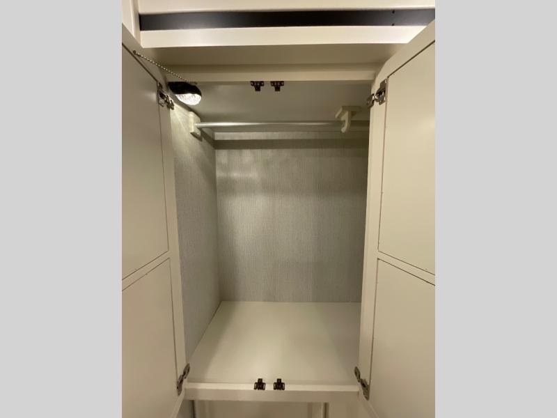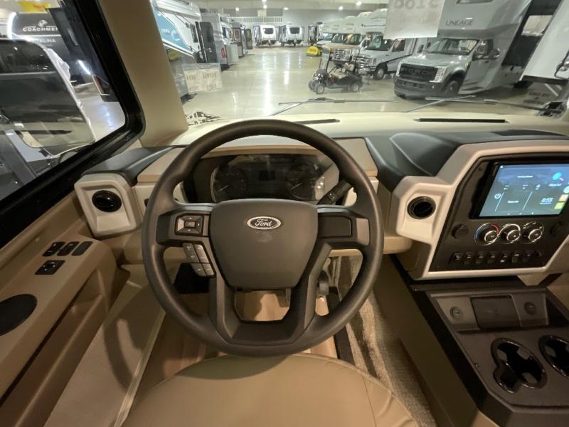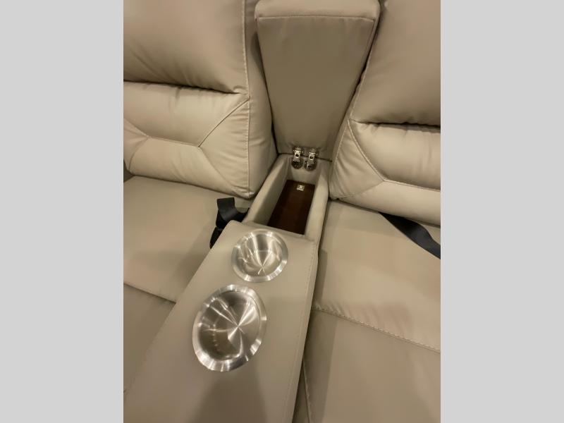 There are many standard luxurious features you will love about this motorhome! It also has many optional features you can add like the optional drop-down front bunk, the optional super sofa and the optional theater seating. The queen bed slide in the rear private bedroom offers a comfortable place to sleep, as well as the flip and fold sofa bed in the living area. You will love the dinette bar with a lift TV, a flip-up countertop, and two chairs that will make this the perfect place to get some work done while you're on the road. The kitchen includes everything you need to prepare meals each day, including a 1.7 cu. ft. smart convection microwave with an air fryer, a three burner liquid propane cooktop, and a 23 cu. ft. stainless steel residential refrigerator with French doors and a bottom freezer. Head to the rear master bedroom with a queen bed slide out, a large wardrobe, a cabinet with a TV and drawers below, plus a private entrance into the dual entry bath!