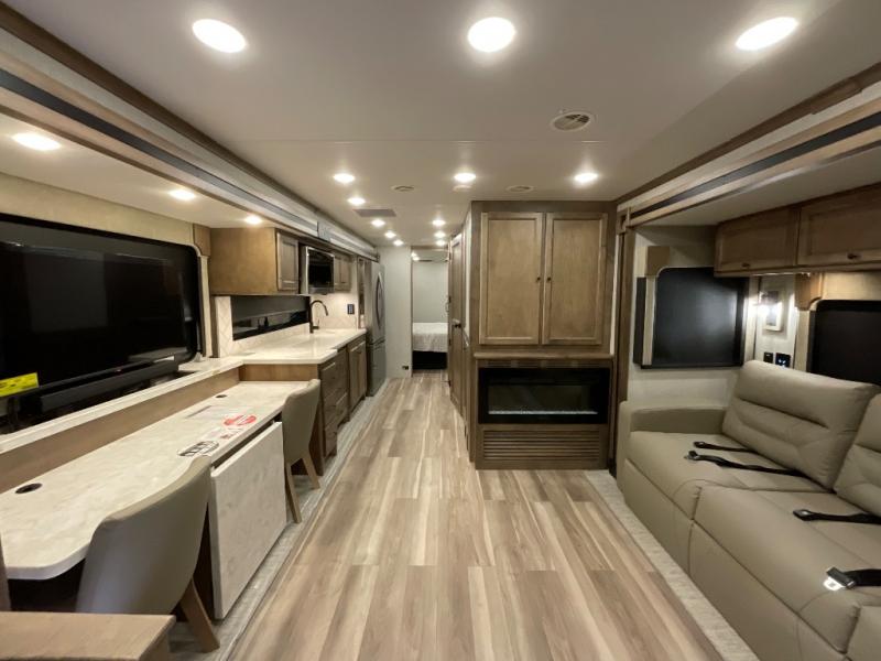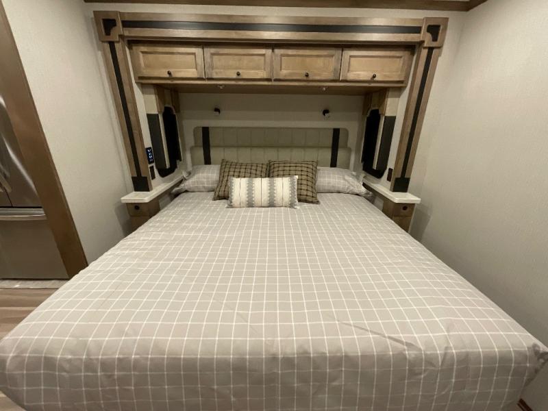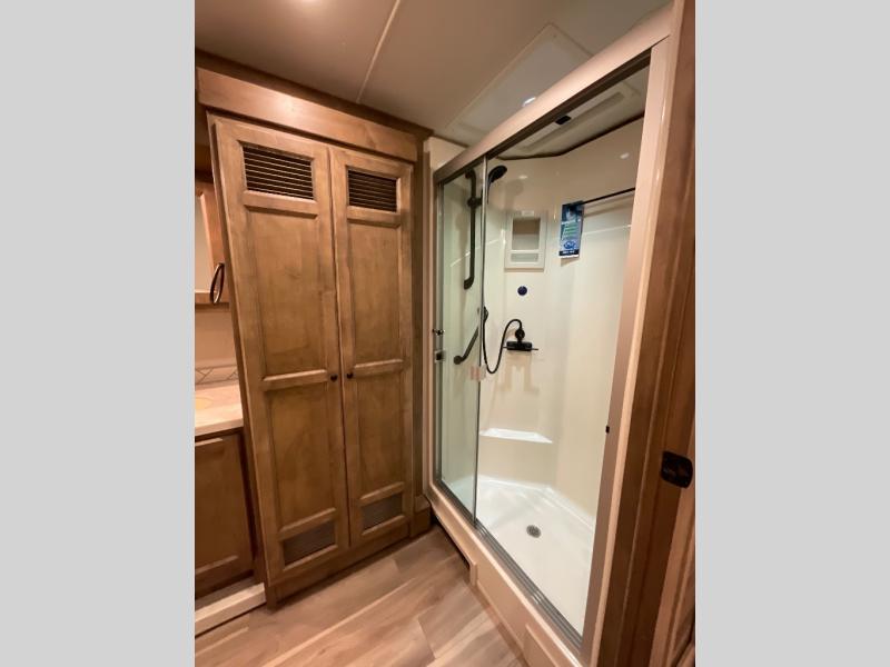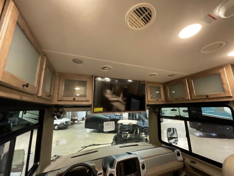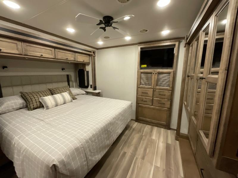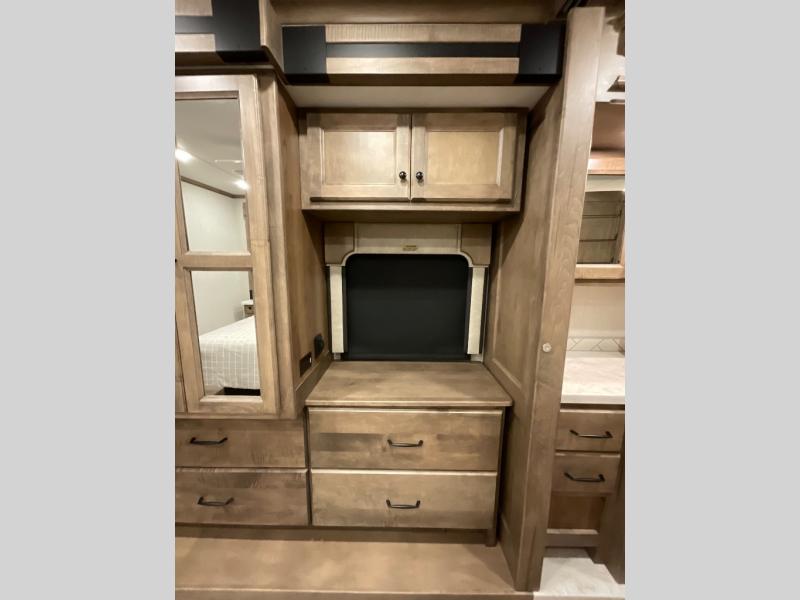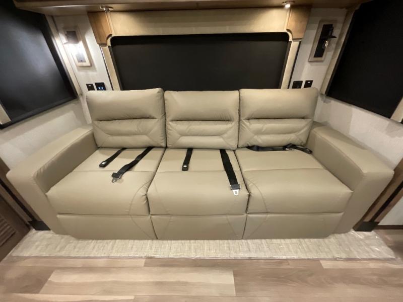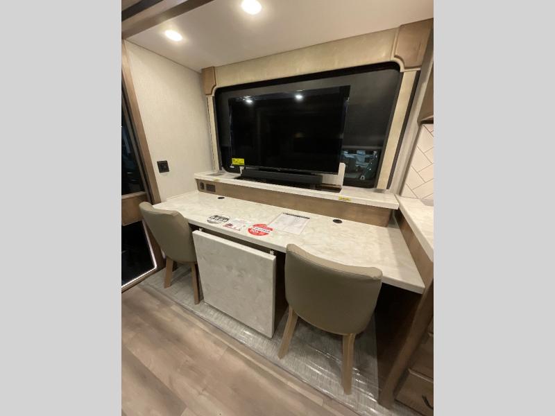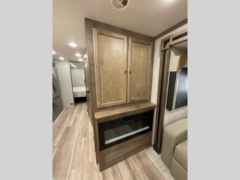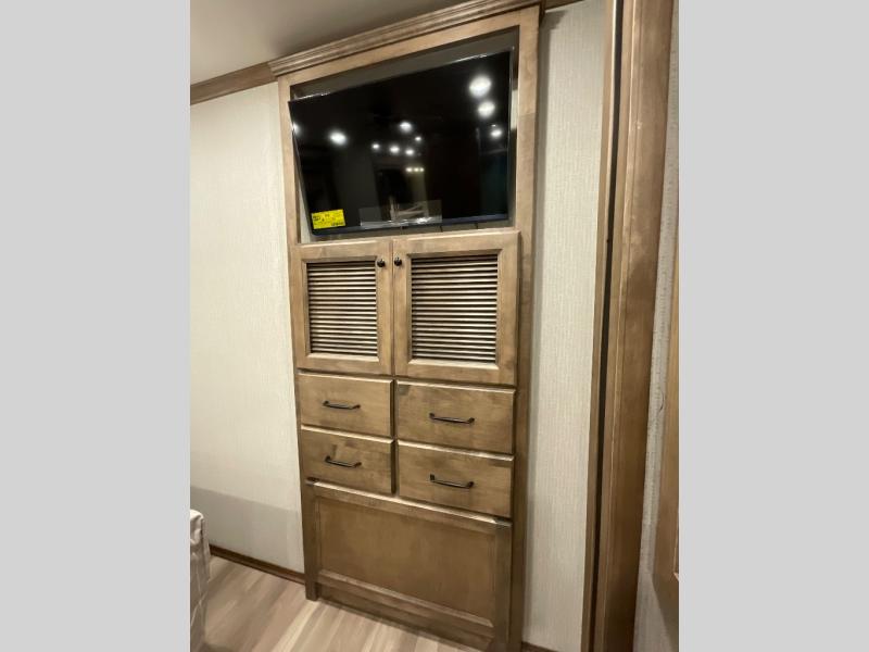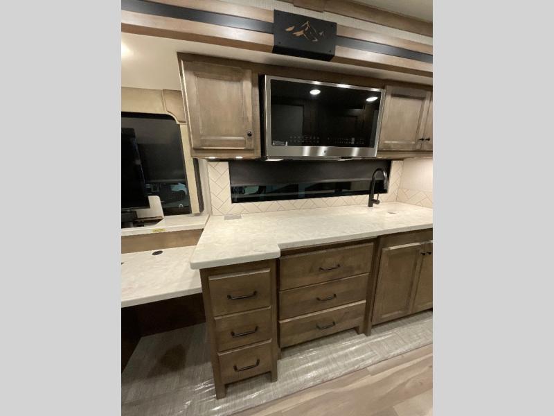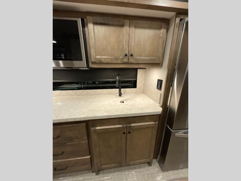 There are many standard luxurious features you will love about this motorhome! It also has many optional features you can add like the optional drop-down front bunk, the optional super sofa and the optional theater seating. The queen bed slide in the rear private bedroom offers a comfortable place to sleep, as well as the flip and fold sofa bed in the living area. You will love the dinette bar with a lift TV, a flip-up countertop, and two chairs that will make this the perfect place to get some work done while you're on the road. The kitchen includes everything you need to prepare meals each day, including a 1.7 cu. ft. smart convection microwave with an air fryer, a three burner liquid propane cooktop, and a 23 cu. ft. stainless steel residential refrigerator with French doors and a bottom freezer. Head to the rear master bedroom with a queen bed slide out, a large wardrobe, a cabinet with a TV and drawers below, plus a private entrance into the dual entry bath!