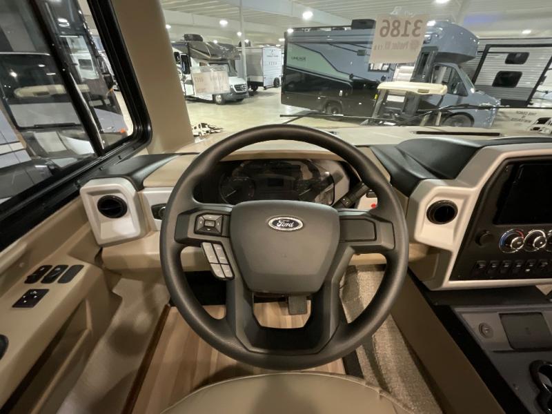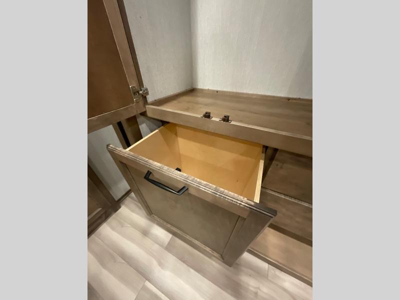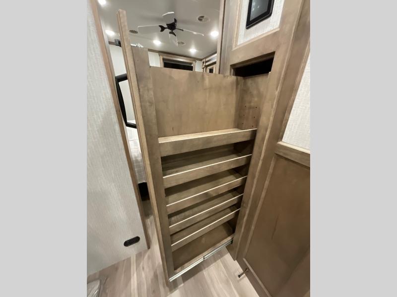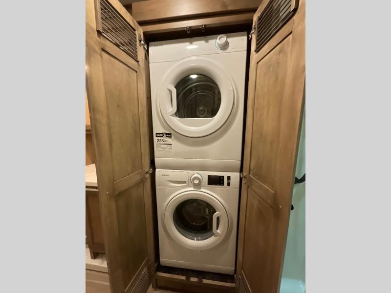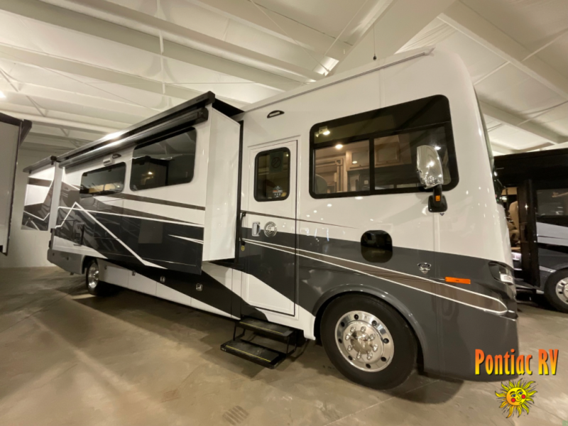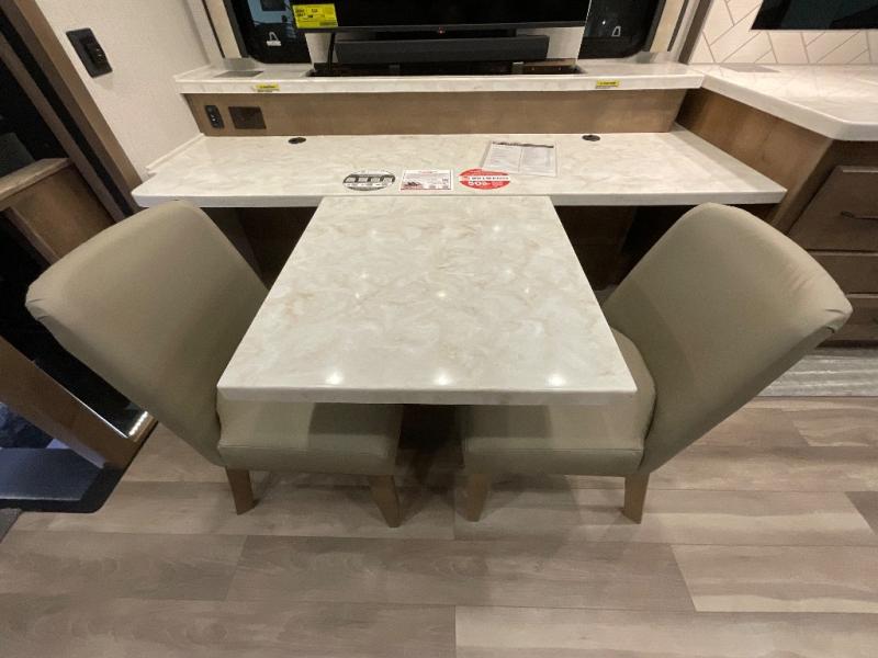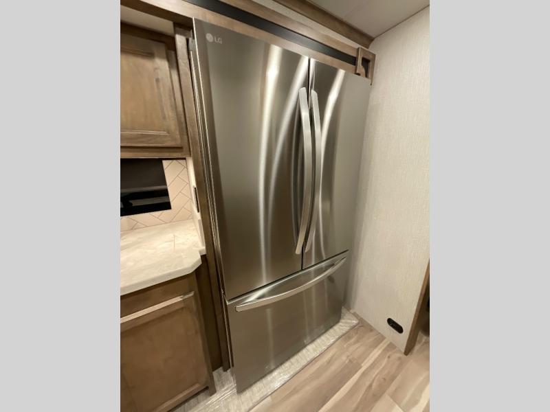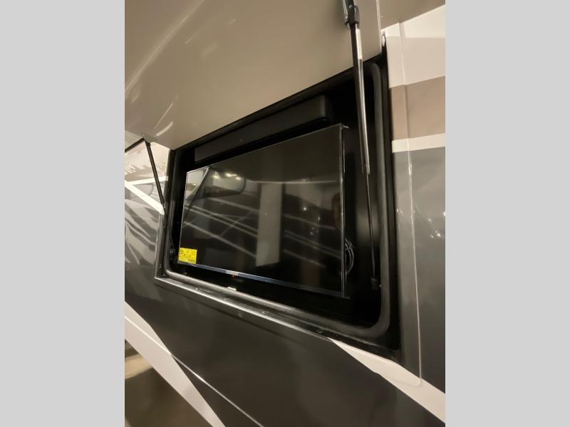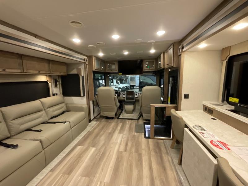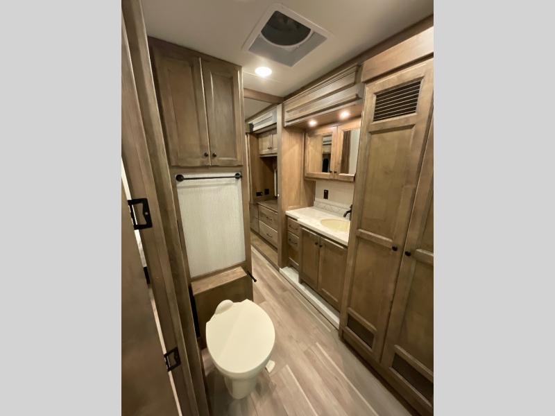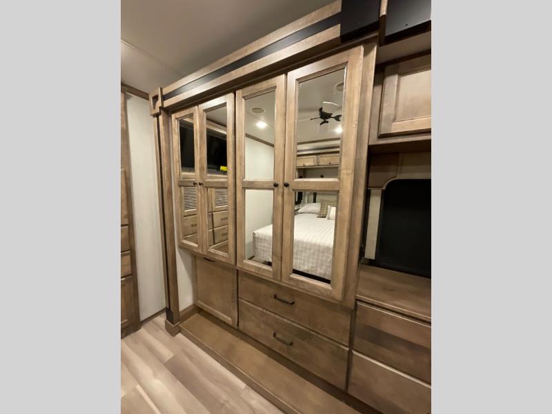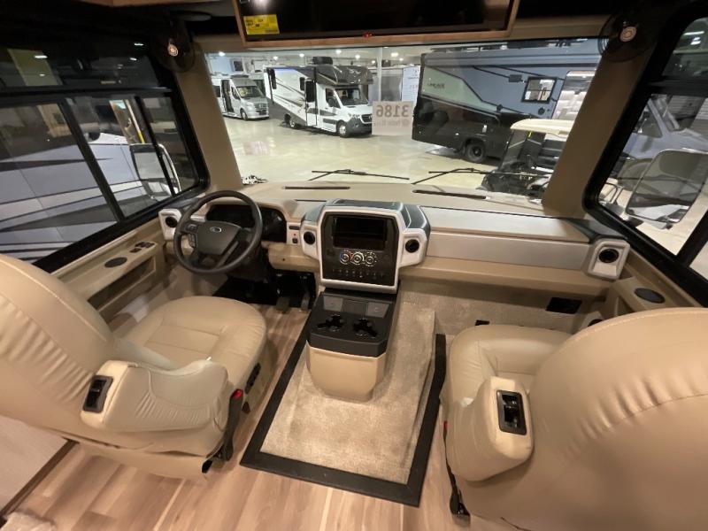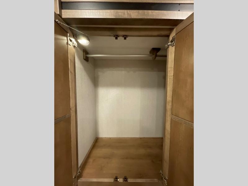 There are many standard luxurious features you will love about this motorhome! It also has many optional features you can add like the optional drop-down front bunk, the optional super sofa and the optional theater seating. The queen bed slide in the rear private bedroom offers a comfortable place to sleep, as well as the flip and fold sofa bed in the living area. You will love the dinette bar with a lift TV, a flip-up countertop, and two chairs that will make this the perfect place to get some work done while you're on the road. The kitchen includes everything you need to prepare meals each day, including a 1.7 cu. ft. smart convection microwave with an air fryer, a three burner liquid propane cooktop, and a 23 cu. ft. stainless steel residential refrigerator with French doors and a bottom freezer. Head to the rear master bedroom with a queen bed slide out, a large wardrobe, a cabinet with a TV and drawers below, plus a private entrance into the dual entry bath!