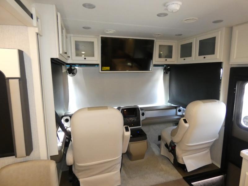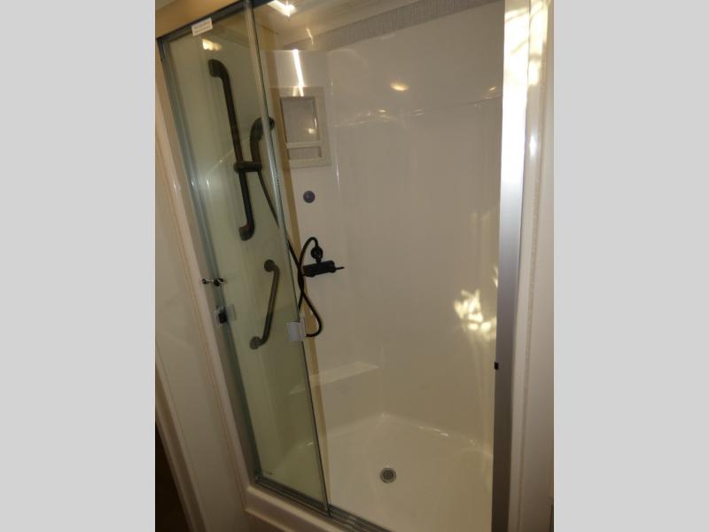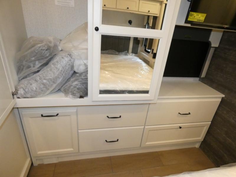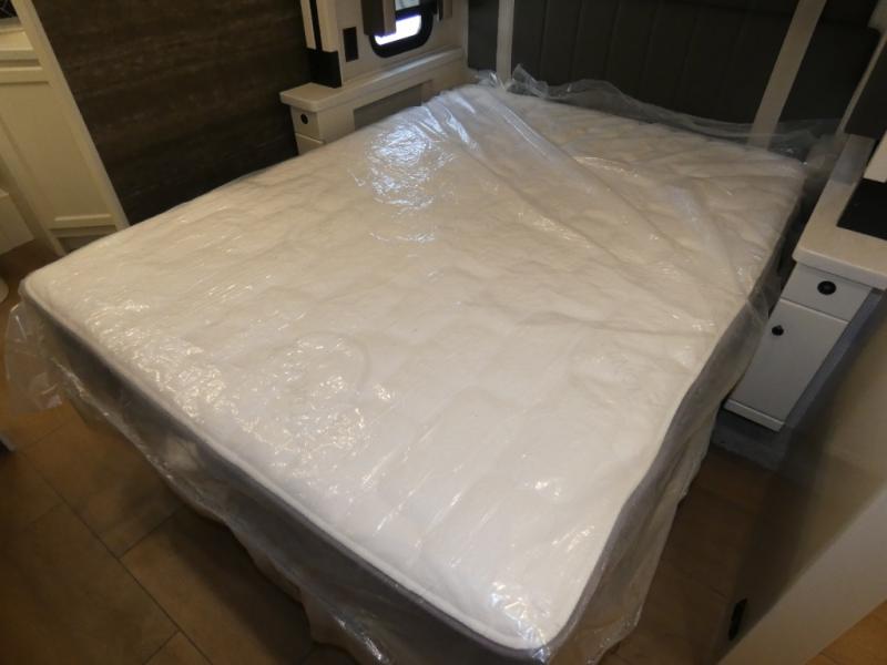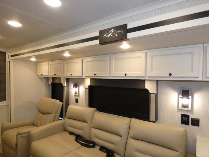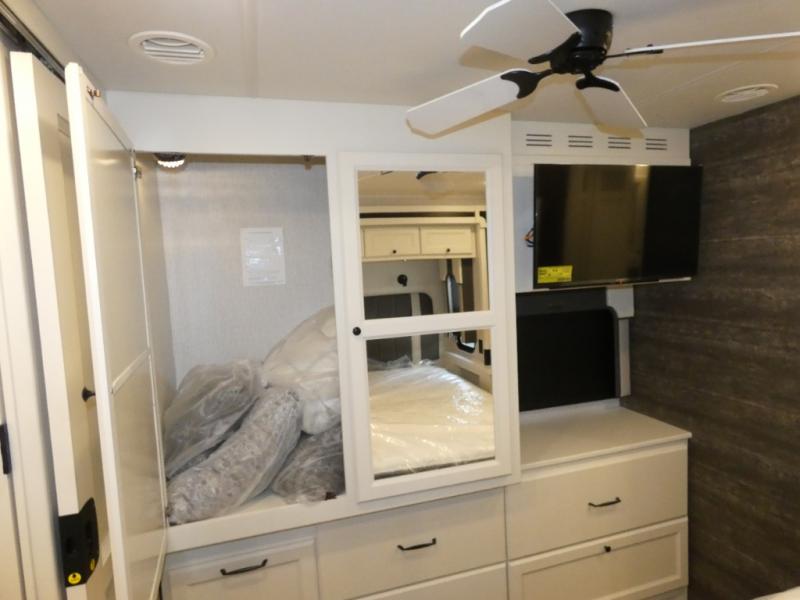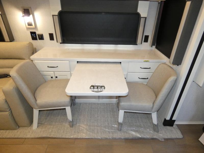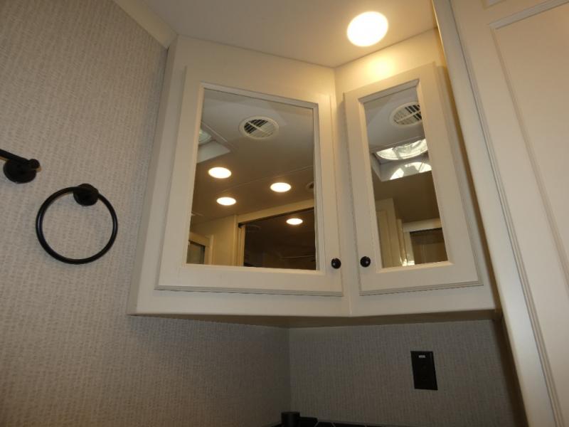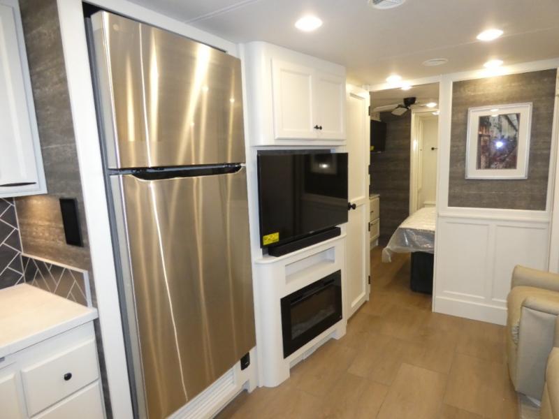 It's a clean decision with a bath and a half to choose this motorhome for your travels! The full rear bathroom has a shower, an overhead cabinet with linen storage, and a stacked washer and dryer so you can extend your trips with clean clothes. After a long day of traveling, you can relax on the recliner or the sofa bed across from the living room TV with a fireplace below it. There is also a dinette, and a recliner where you can dine or relax. The chef of your group will love the full kitchen with task lighting, a smart convection microwave with an air fryer, and a 20 cu. ft. stainless steel residential refrigerator with a top freezer.