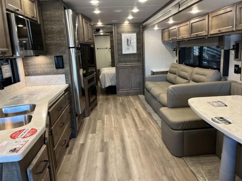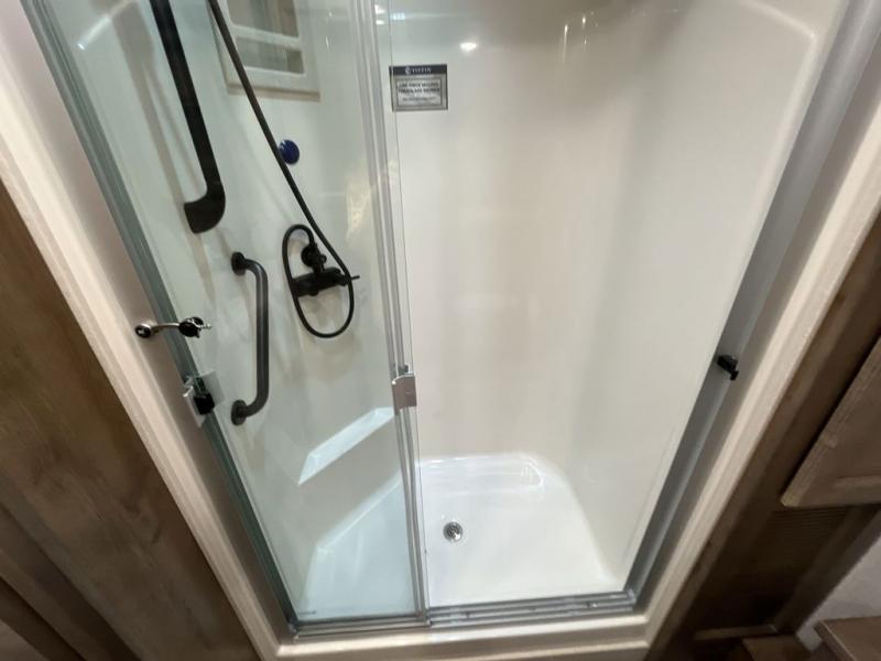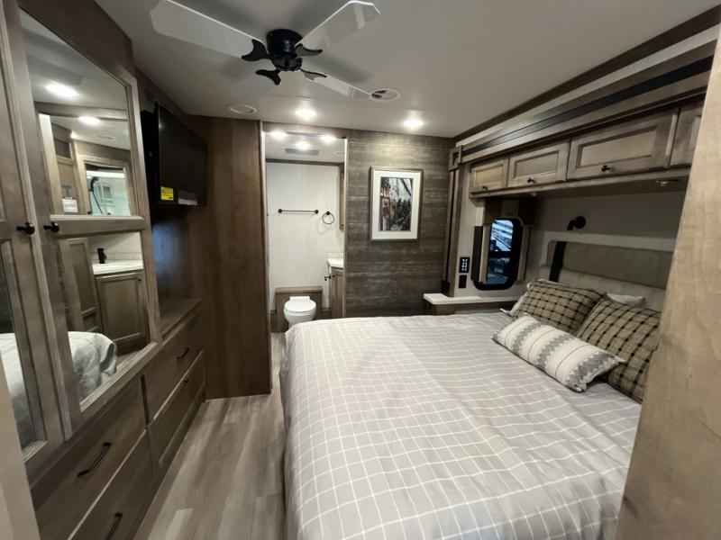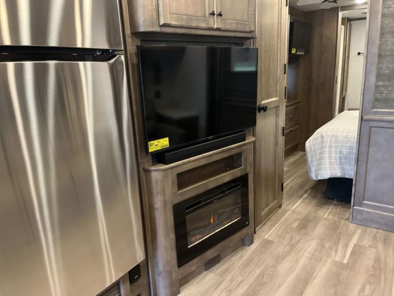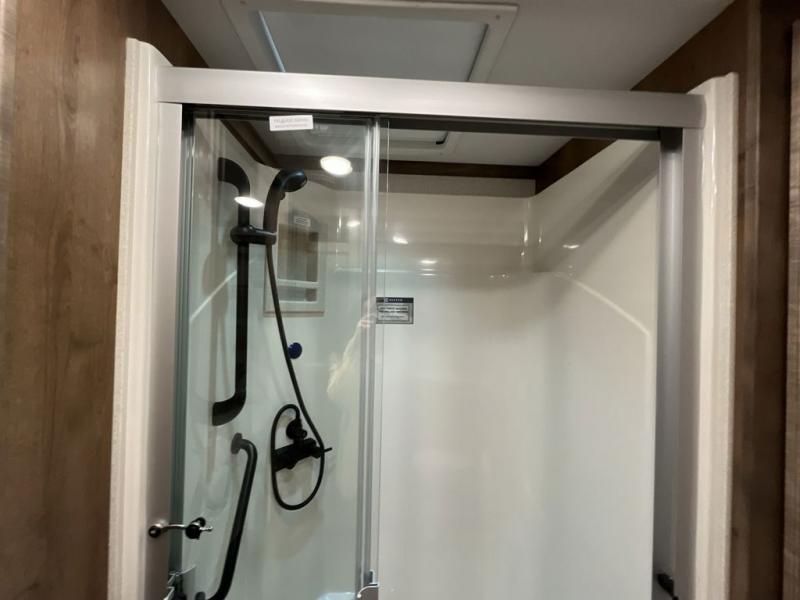 It's a clean decision with a bath and a half to choose this motorhome for your travels! The full rear bathroom has a shower, an overhead cabinet with linen storage, and an optional stacked washer and dryer so you can extend your trips with clean clothes. After a long day of traveling, you can relax on the recliner or the flip and fold sofa bed across from the living room TV with an optional fireplace below it. There is also a booth dinette-sleeper with a recliner where you can dine, relax, and house more overnight guests. Add the optional drop-down overhead bunk and the whole crew can tag along! The chef of your group will love the full kitchen with task lighting, a smart convection microwave with an airy fryer, and a 20 cu. ft. stainless steel residential refrigerator with a top freezer.
