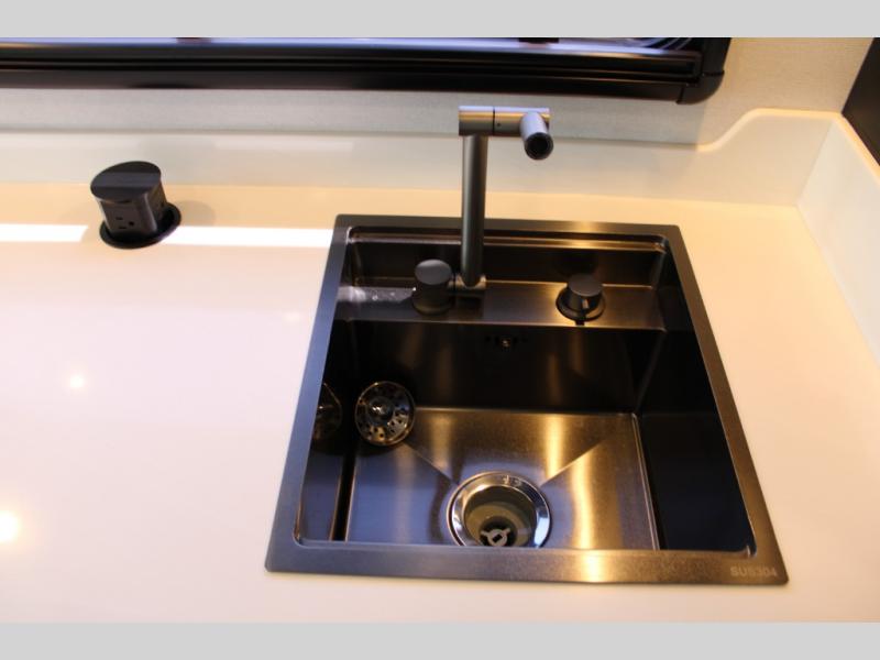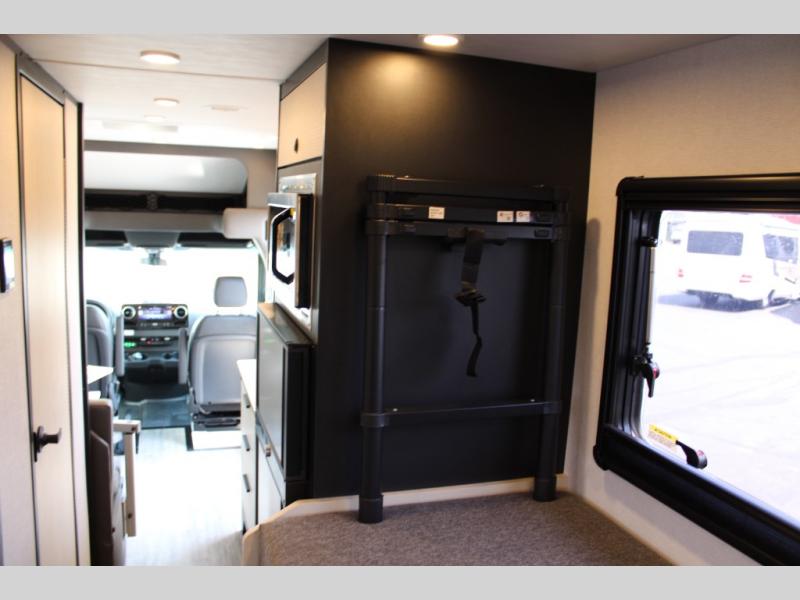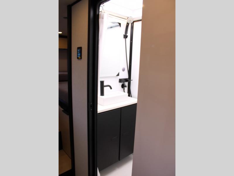 If you're an outdoor enthusiast who doesn't want to sacrifice comfort, this coach is for you! The premium Mercedes captain's seats include heat for added comfort plus they can swivel around to become part of the living area seating. You can make lunch on the single burner portable induction stove or in the stainless steel microwave/air fryer. There is a sleeper sofa for cozy seating and additional sleeping space for a guest, or you can choose the optional L-shaped lounge if you're wanting a table. The full residential-style wet bath includes a roof vent fan, towel and toilet paper holders, an oversized mirror, plus a large black aluminum under-sink cabinet with a GFCI outlet to plug in any accessories you may need. Head to the rear of this coach to find the 32" x 76" twin beds with a nightstand in between, or you can convert them into one king-size bed. There is also an overhead cabinet and dual pull-out closets so you both have a place for your things!