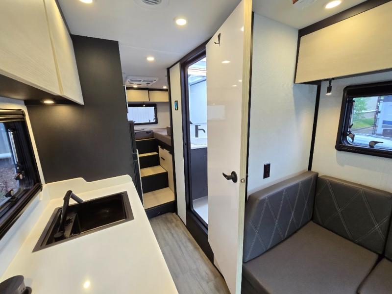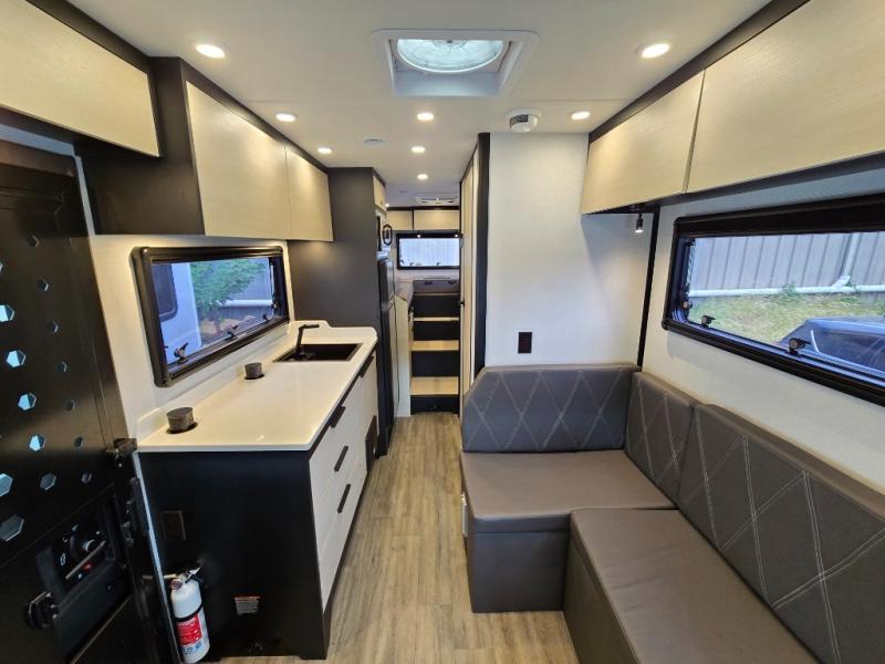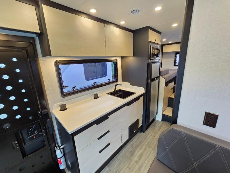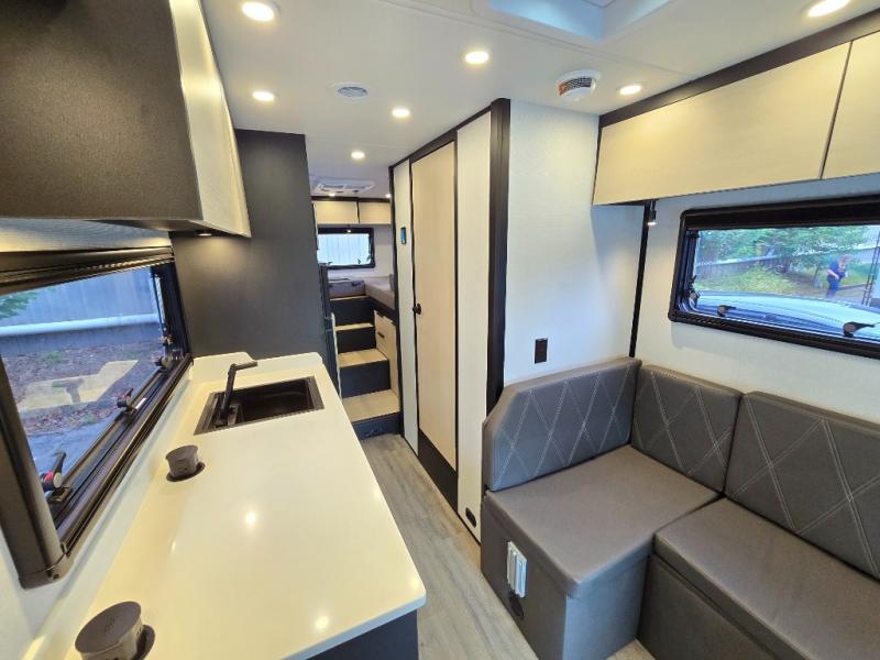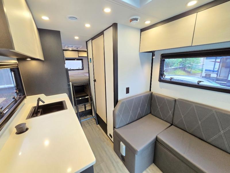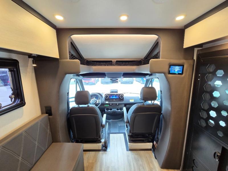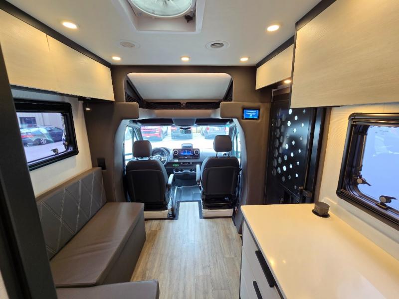 If you're an outdoor enthusiast who doesn't want to sacrifice comfort, this coach is for you! The premium Mercedes captain's seats include heat for added comfort plus they can swivel around to become part of the living area seating. You can make lunch on the single burner portable induction stove or in the stainless steel microwave/air fryer. There is a sleeper sofa for cozy seating and additional sleeping space for a guest, or you can choose the optional L-shaped lounge if you're wanting a table. The full residential-style wet bath includes a roof vent fan, towel and toilet paper holders, an oversized mirror, plus a large black aluminum under-sink cabinet with a GFCI outlet to plug in any accessories you may need. Head to the rear of this coach to find the 32" x 76" twin beds with a nightstand in between, or you can convert them into one king-size bed. There is also an overhead cabinet and dual pull-out closets so you both have a place for your things!