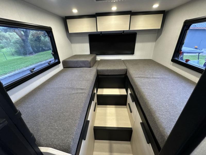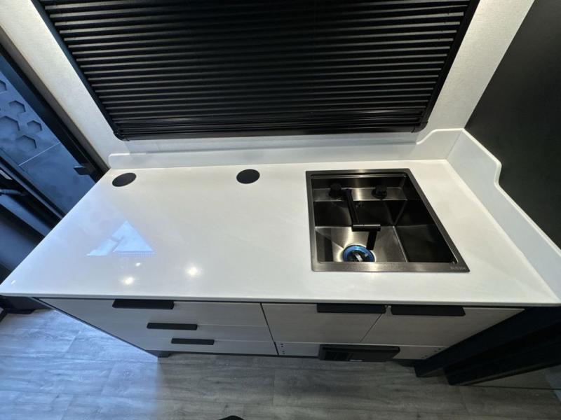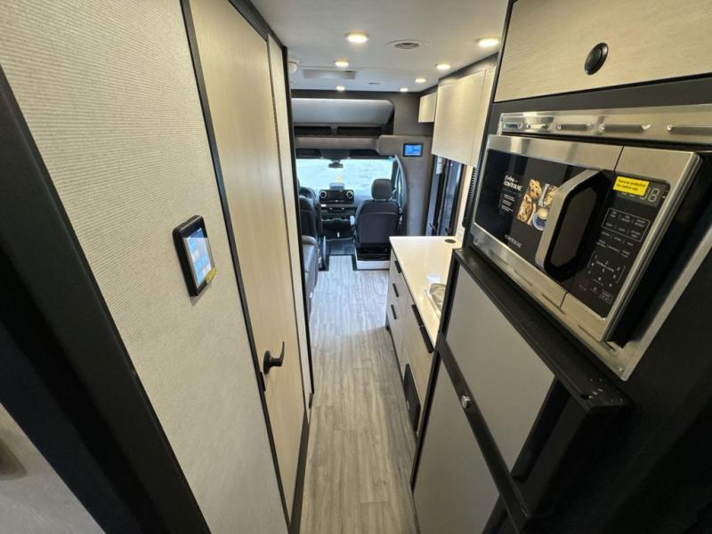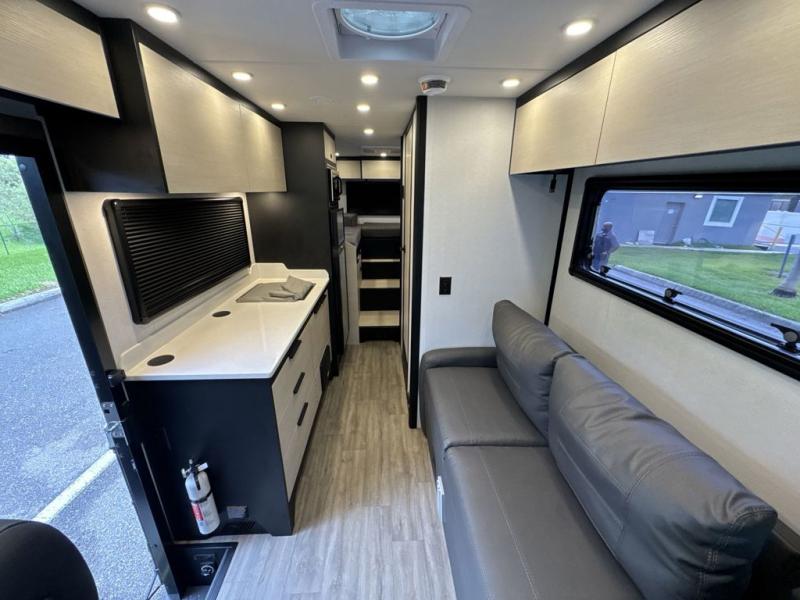 If you're an outdoor enthusiast who doesn't want to sacrifice comfort, this coach is for you! The premium Mercedes captain's seats include heat for added comfort plus they can swivel around to become part of the living area seating. You can make lunch on the single burner portable induction stove or in the stainless steel microwave/air fryer. There is a sleeper sofa for cozy seating and additional sleeping space for a guest, or you can choose the optional L-shaped lounge if you're wanting a table. The full residential-style wet bath includes a roof vent fan, towel and toilet paper holders, an oversized mirror, plus a large black aluminum under-sink cabinet with a GFCI outlet to plug in any accessories you may need. Head to the rear of this coach to find the 32" x 76" twin beds with a nightstand in between, or you can convert them into one king-size bed. There is also an overhead cabinet and dual pull-out closets so you both have a place for your things!